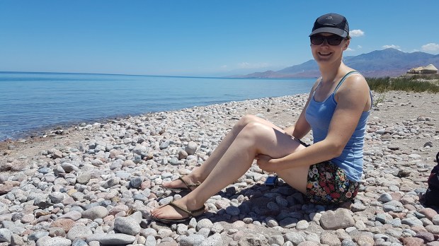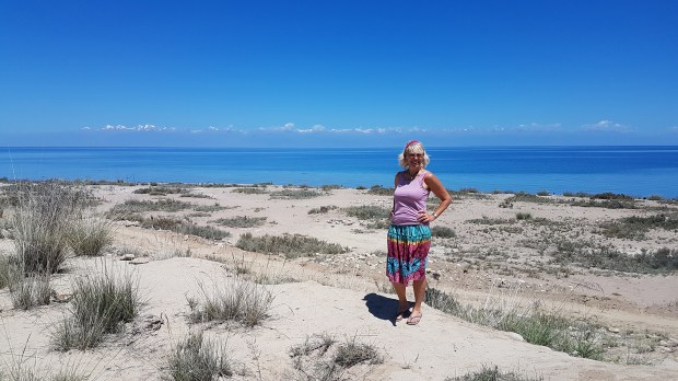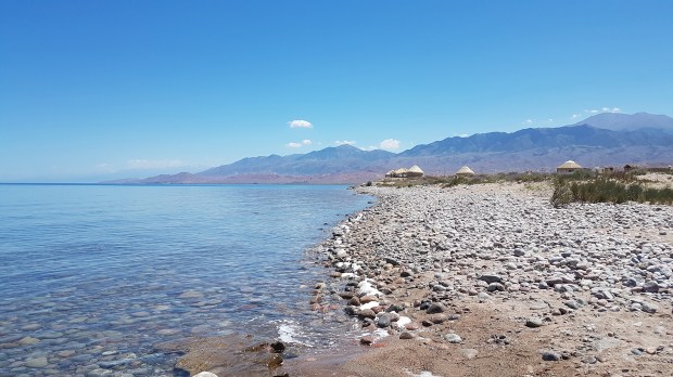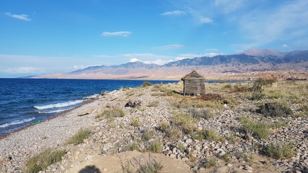 Sehr glücklich und zufrieden machen Lea und ich uns auf zum ersten Bad im einsamen Issyk Kul und genießen den strahlend blauen Himmel, das warme Wasser und den atemberaubenden Blick auf die schneebedeckten Berge im Norden und die farbigen im Süden.