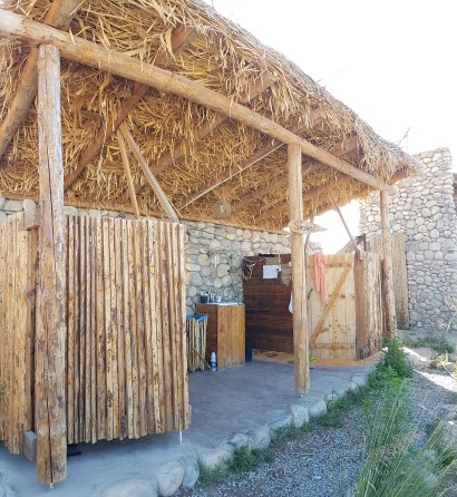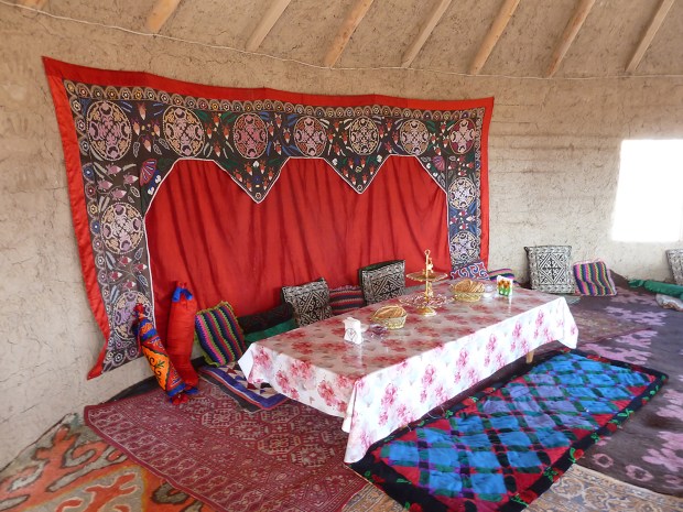 Das Camp sieht auf den ersten Blick aus wie im wilden Westen, einfache Jurten auf staubigem Boden – also ganz unser Ding. Erst beim Rundgang bemerken wir, wie liebevoll und naturnah die Anlage gebaut und gepflegt wird. Die sanitären Anlagen sind top und die große Gemeinschaftsjurte für Frühstück und Abendessen eine Augenweide. Viele hübsche Details fallen uns allerorts ins Auge.