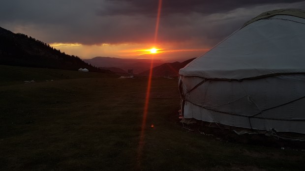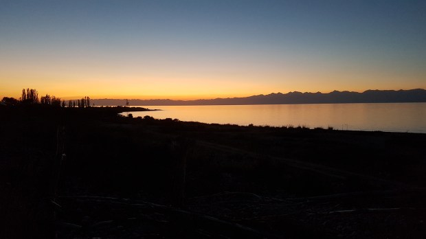 Mit einem wunderbaren Sonnenuntergang über dem Issyk Kul verabschiedet uns der ereignisreiche Tag in die unruhige Nacht. Das schwere Essen, die dünne Luft auf 2500 m, die Festivitäten der Nachbarn, das Getrappel, Muhen, Mähen, Wiehern, Iaen des Viehs und nicht zuletzt der stürmische Wind halten unsere Sinne vom Schlafen ab.