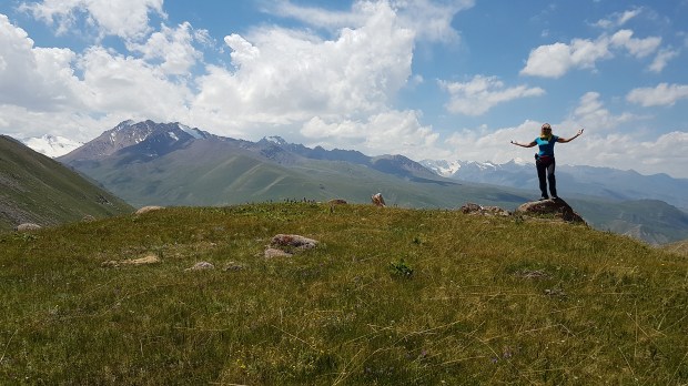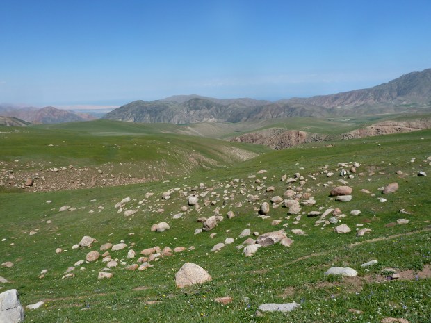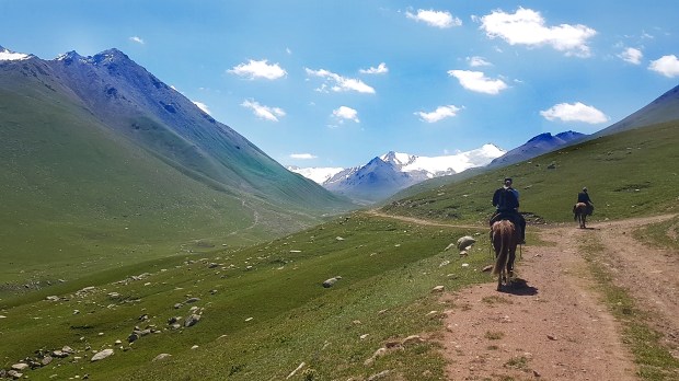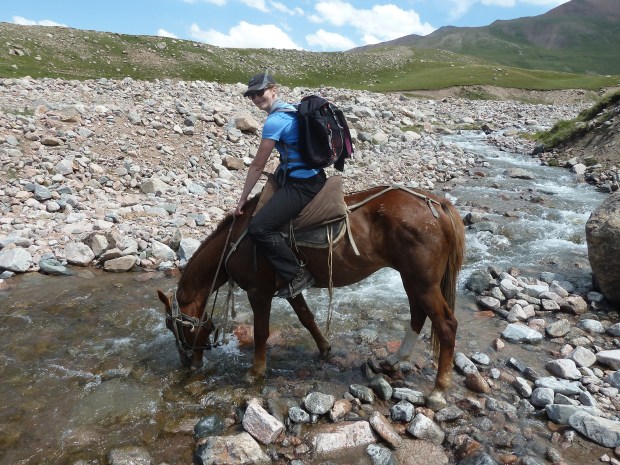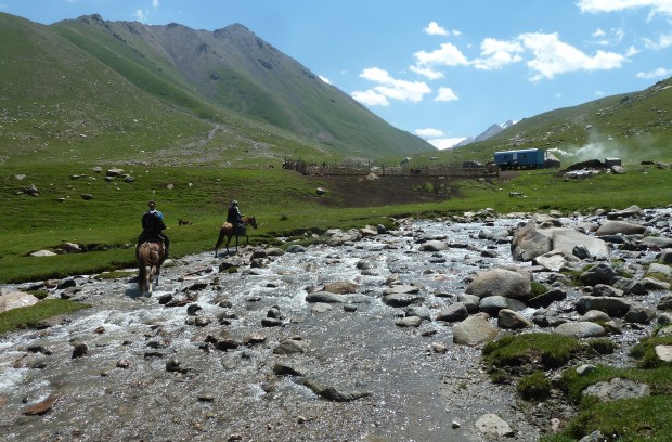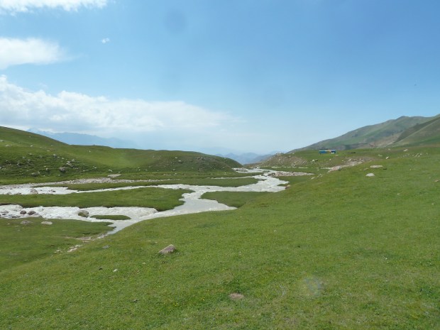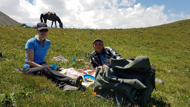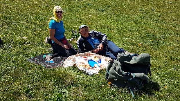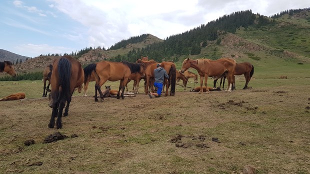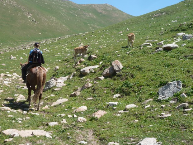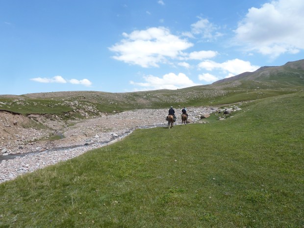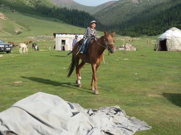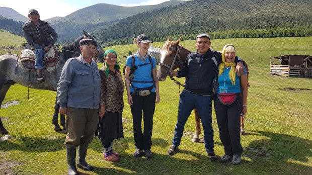 Hier und da passieren wir Einöd-Jurten der Schäfer mit ihren Rinder-, Schaf-, Ziegen- oder Pferdeherden, queren Gebirgsbäche und genießen die Weite der grünen Landschaft. Bekzat unterhält uns nebenbei mit allerlei augenzwinkernden Witzchen und Späßen und schafft es sogar, Lea „ins Gespräch zu verwickeln“.
