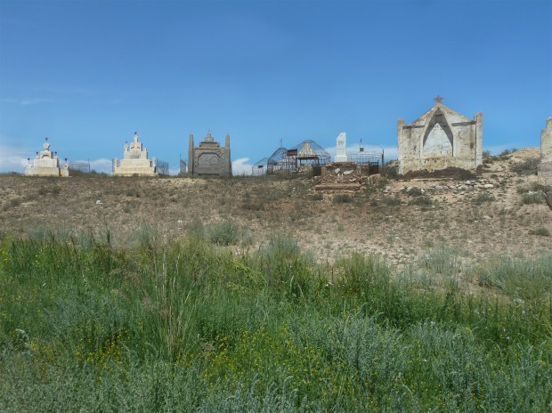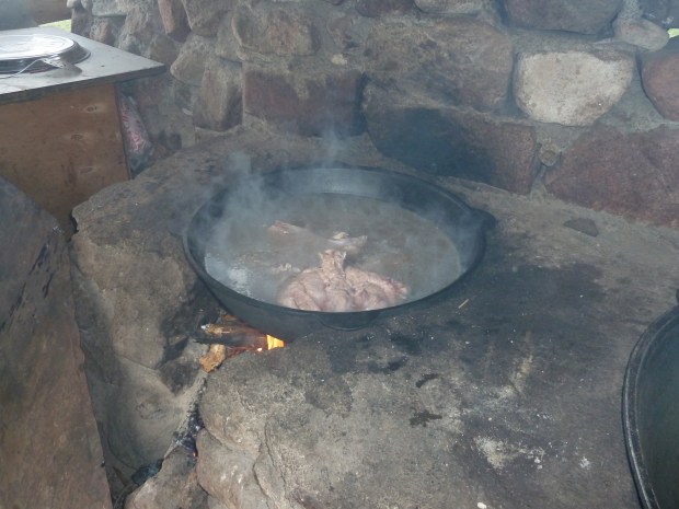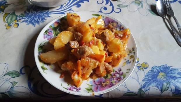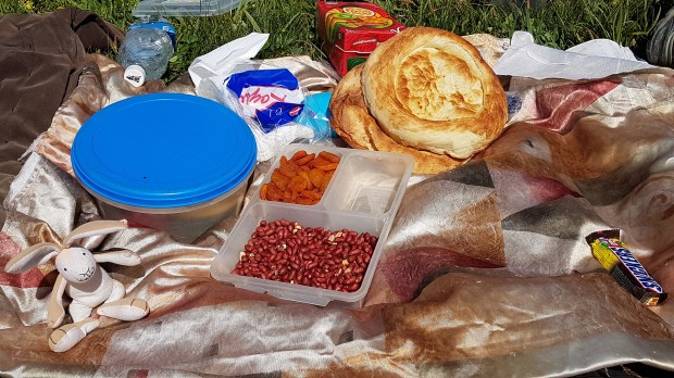 Dort haben wir auch unseren eigenen Ess-Jurtenbau, wo wir in netter Gesellschaft einer Schweizer Familie und zweier mit Mietwagen reisender Schweizer Jungs zum dritten Mal einen leckeren Kurdak-Eintopf essen. Zum allerersten Mal bekommen wir heute Wassermelone als Nachspeise kredenzt, obwohl Melone hier in Kirgistan eigentlich das Standard-Dessert sein soll.