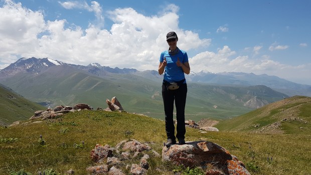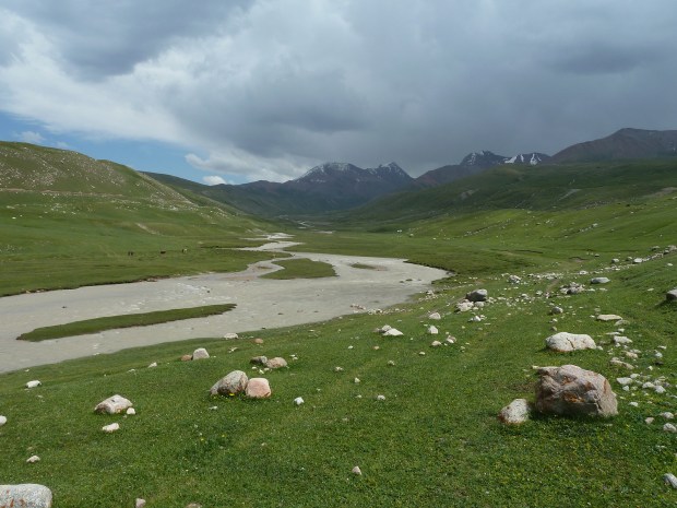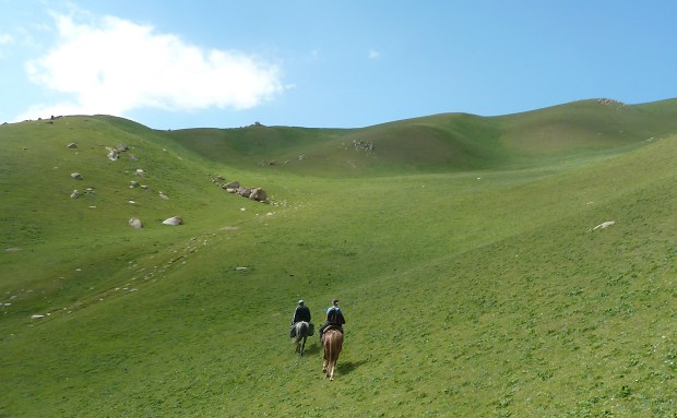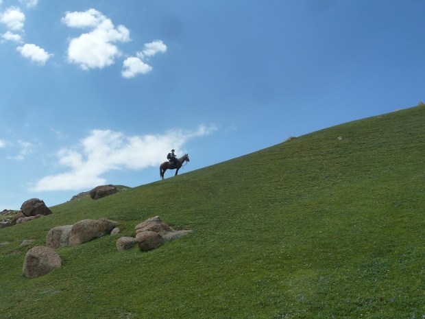 Nachdem wir uns ausgiebig satt gesehen und satt gegessen haben, heißt es wieder aufsteigen und nur eine knappe Stunde später braut sich hinter uns ein mächtiges Gewitter zusammen. Lea und ich werfen besorgte Schulterblicke zurück. So ganz geheuer erscheint es uns nicht, in diesen baumlosen Höhen ins Zentrum von Donner und Blitz zu geraten. Doch Bekzat ist völlig desinteressiert und macht auf „Easy-Rider“, sodass uns nichts anderes übrig bleibt, als uns ebenfalls ausschließlich auf den vor uns liegenden blauen Himmel und die beruhigenden, sanften Hügelketten zu konzentrieren.