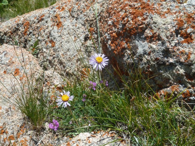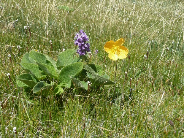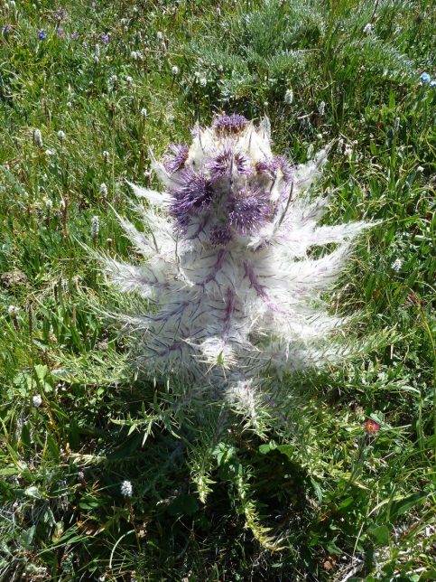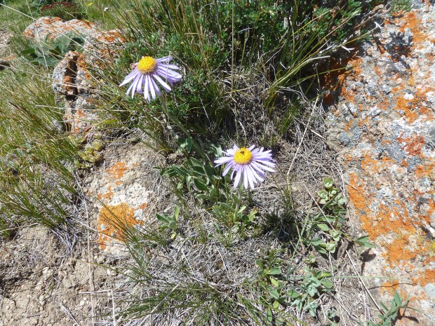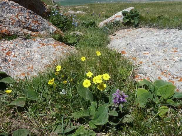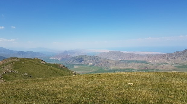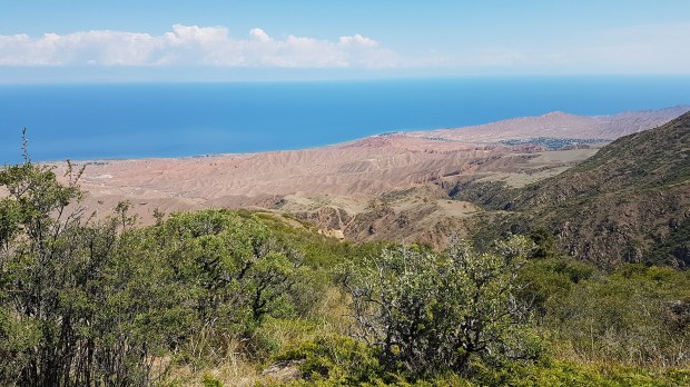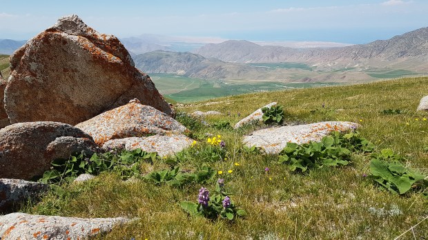 Neben der bunten Flora genießen wir einen gewaltigen Blick auf das kirgisische Meer, die vielfarbenen Bergzüge und die 4500-4750 m hohen Schneeberge des Teskej Ala Too, das „dem Schatten zugewandte bunte Gebirge“.