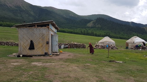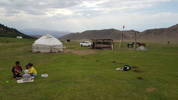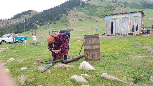 Anfangs haben wir keinen Überblick, wer denn nun überhaupt zur Familie gehört, so umtriebig ist es hier. Die Schäfer-Jurte ist über einen Feld-Wald-Wiesen-Weg auch vierrädrig zu erreichen und wird von den Einheimischen und Besuchern aus Bokonbaevo gerne angefahren. Sei es, um hier einige Tage in der Jurte zu verbringen oder nur um die frische Stuten-Milch zu trinken oder den Wochenvorrat an Kymyz zu besorgen.