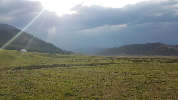 Am sehr frühen Morgen zieht dann endlich das schon zu erwartende Gewitter auf, es donnert und regnet. Ups, unser Jurtendach ist nicht wirklich dicht. An einigen Stellen wird es ziemlich schnell ziemlich nass und wir versuchen aufgeschreckt, unser Hab und Gut in Sicherheit zu bringen. An Schlaf ist jetzt auf den verbleibenden trockenen Stellen auch nicht mehr zu denken.