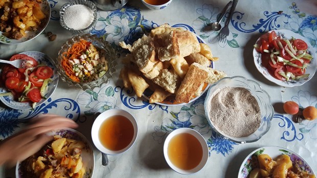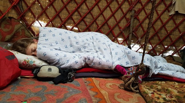 Zum ersten Mal während unserer Kirgistan-Reise sitzen wir mit vielen anderen Travellern beim Abendessen in der großen Gemeinschaftsjurte. Leider entpuppt sich eine aufgescheuchte, geltungsbedürftige Deutsche recht schnell als furchtbar nervig und verbal raumeinnehmend, so dass es uns nicht nur die Sprache verschlägt, sondern uns auch der Appetit vergeht. Die französische Familie ist ebenfalls nur bedingt zu ertragen. Keiner von ihnen hat vegetarisch bestellt, aber die verzogenen Kids bedienen sich wild an unseren Gerichten und fieseln alles was ihnen nicht taugt akribisch und mit angewidertem Augenaufschlag heraus. Da ist Fremdschämen angesagt. Lea und ich fühlen uns sowas von unwohl in dieser Gesellschaft und verziehen uns stillschweigend noch vor der Nachspeise.