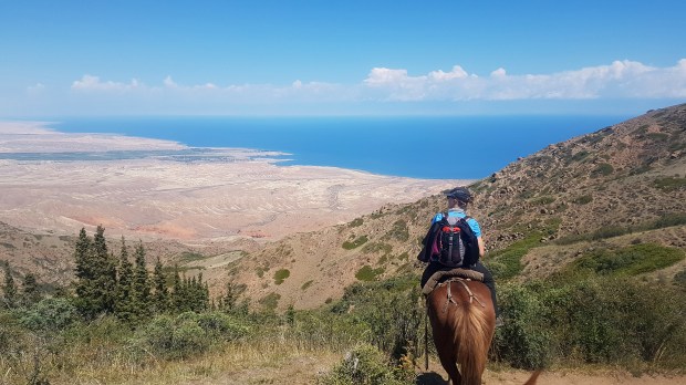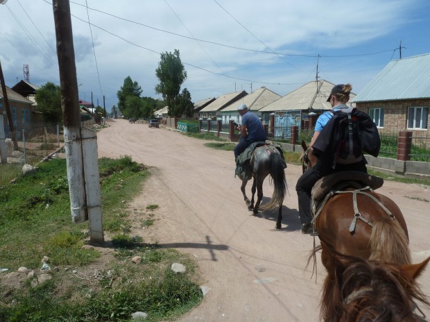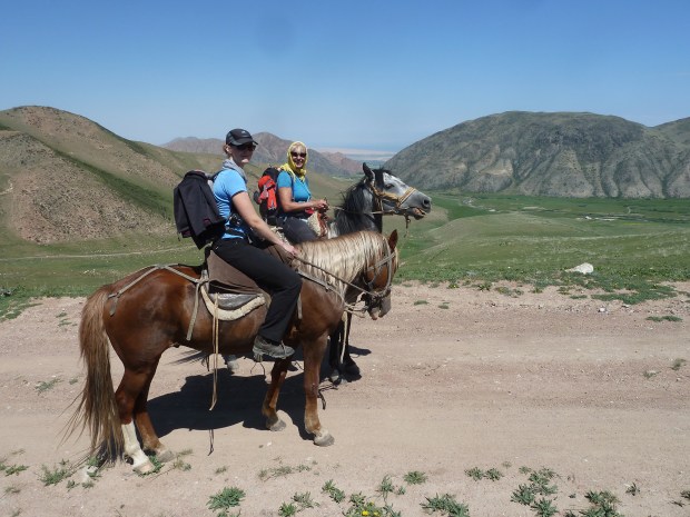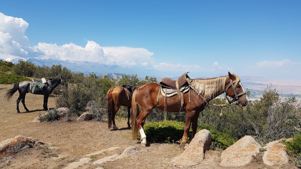 Nach einer wunderbaren Nacht mit Wellenrauschen und sternenklarem Himmelszelt geht es für uns am nächsten Morgen um 9.15 Uhr erst mit dem Taxi zum CBT-Office in Bokonbaevo und anschließend mitsamt unserer 2-Tages-Verpflegung im Kofferraum zum Standplatz der Pferde außerhalb der Stadt. Unser Guide Bekzat hat schon aufgesattelt und erwartet uns. Er ist super nett, lustig und redselig. Letzteres hat meist nur Auswirkungen auf mich, gell Lea?!