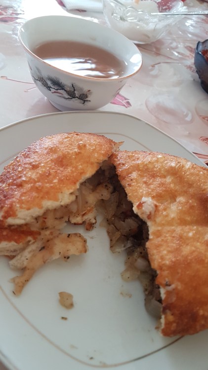 Im Ortszentrum von Bokonbaevo binden wir unsere treuen Begleiter wie im Western an einen Gartenzaun. Freund Eugen wird die Pferdl später abholen. Derweil lädt uns Bekzat zum Abschied noch in einen Hinterhof-Imbiss zu Hoshan (gefüllte Teigtaschen), Chai und Kymyz ein.