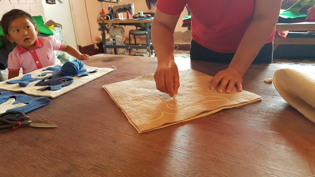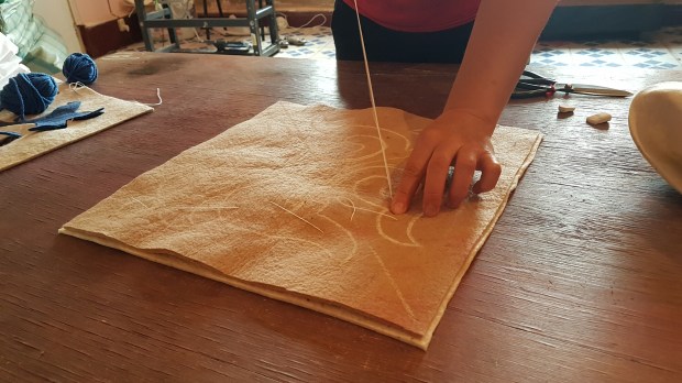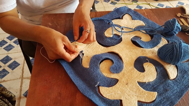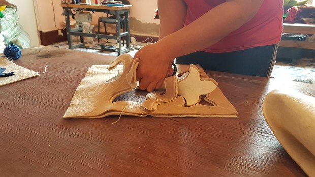 Zuerst werden zwei verschieden farbige Lagen Filz aufeinander gelegt und fixiert. Die Handwerkerinnen zeichnen die geometrischen Motive und Ornamente freihand mit Kreide auf, um sie anschließend auszuschneiden.