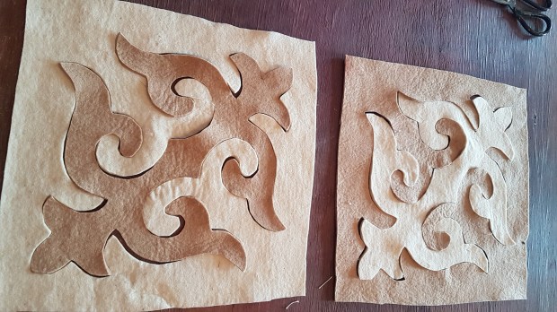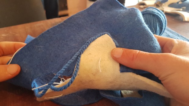 Danach werden die „Filzintarsien“ farblich getauscht und in einer speziellen Technik mit einem Doppelgarn appliziert.