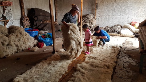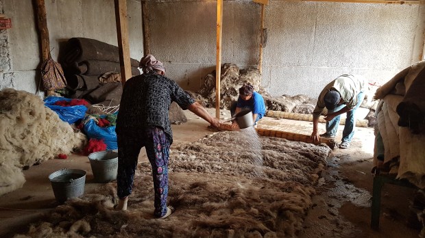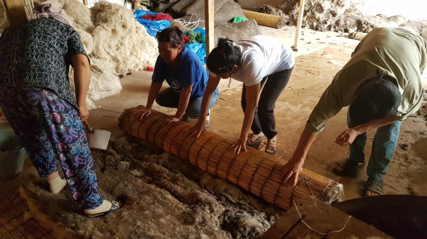 Zuerst wird die gereinigte Schafwolle ganz dicht in dicken Schichten auf einer Bastmatte ausgelegt, dann mit heißem Wasser begossen und mit vereinten Kräften zusammengerollt.