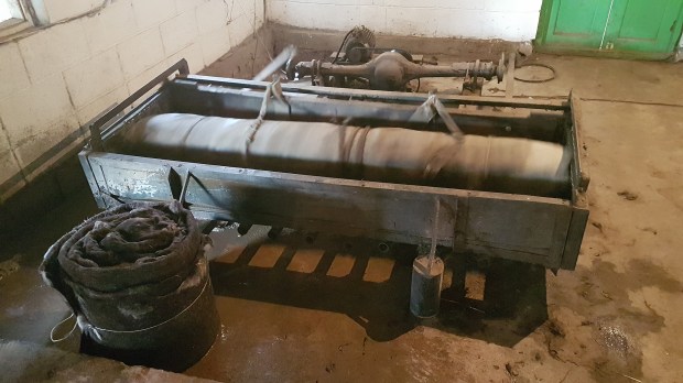 In dieser altertümlichen Maschine wird die dicke Filzwurst dann ordentlich durchgewalkt, gepresst und entwässert. Das dauert einige Zeit.