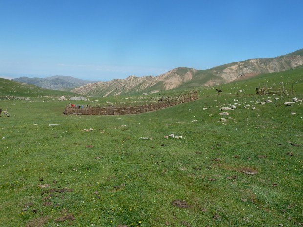 Nach weiteren Aufs und Abs führt uns der Weg über einen Tannen- und Gestrüpp-bewachsenen, steilen Nordhang wieder einige Höhenmeter nach unten unserem Tagesziel, Bas Salkyn Jailoo, entgegen und nach 7 Stunden erreichen wir endlich unsere Schäfer-Familie auf einer famosen Hochebene mit Blick zum großen Issyk Kul-See.
