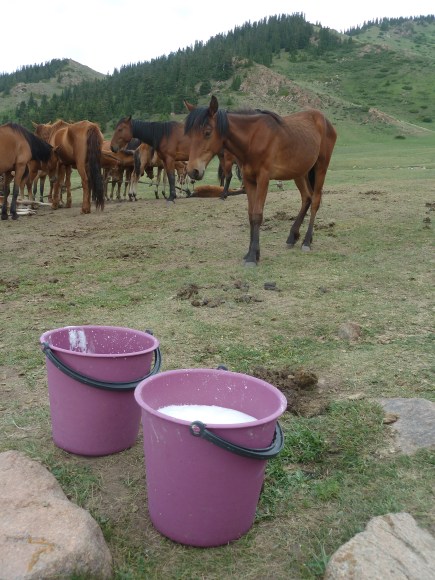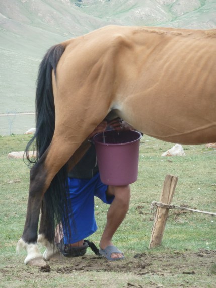 Nachdem die Stuten alle 2 Stunden gemolken werden, ist es kein Zufall, dass auch wir dabei zuschauen können und eingeladen werden, die frisch gezapfte Stutenmilch aus dem Putzeimer zu verkosten. (Anmerk.: Das die Pferdl so dürr sind, ist wohl auf den sehr trockenen, niederschlagsarmen Winter mit wenig Futterangebot zurückzuführen.)