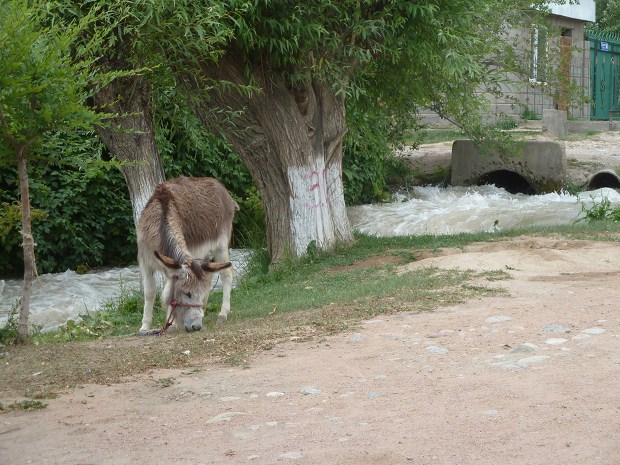 Unsere animalischen Transportmittel auf vier Beinen sind ein hübscher, schwarz-weißer Hengst, auf dem ich Platz nehme, ein kleiner Brauner für die große blonde Lea und ein großer Brauner, Bekzats erklärter Liebling. Insgeheim fragen wir uns, warum die reiterfahrene Lea den etwas trägen kleinen Braunen reitet und ich No-Name-Cowboy den unkastrierten Hengst, der bei jedem Windchen einer sich nähernden Stutenherde ganz nervös wird und auf- oder besser gesagt erregt der Angebeteten entgegen wiehert. Wen wundert’s, dass schon bald ein Tausch ansteht. Leas Vierbeiner kommt einfach nicht voran, sodass Bekzat sich dem störrischen Jungspund annimmt und Lea sein bestes Stück im Stall reiten darf. Ich komme mit meinem Mannsbild gut zurecht, solange keine Weiber in der Nähe sind.