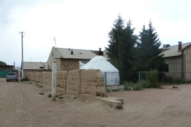 Nach dieser Frage-Odyssee wagen wir schon gar nicht mehr daran zu glauben, dass diese Filzmanufaktur, die von Frauen betrieben wird, real existiert. Trotzdem machen wir uns auf den Weg, den langen Weg (alle Straßen in kirgisischen Ortschaften sind km-lang). Nach ein paar Irrläufern stehen wir mit detektivischem Gespür à la Miss Marple vor einem Haus mit hoher Mauer und einem Jurtenzelt im Hof, von dem nur das obere Dach zu erkennen ist. Kein Wegweiser, kein Schild am Haus, aber die Adresse stimmt.
