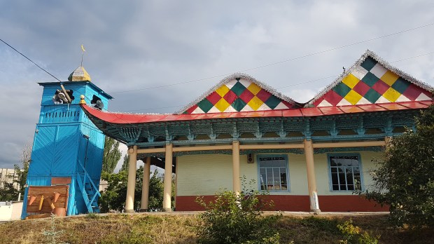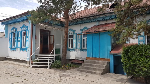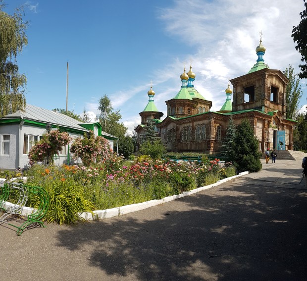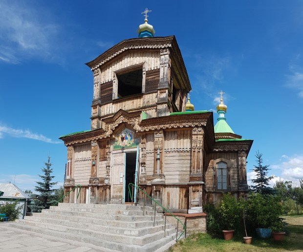 Vom Destination Karakol Office schlendern wir gemütlich zur Russisch-orthodoxen Kirche der Heiligen Dreifaltigkeit. Sie wurde 1895 komplett aus Holz gebaut, während der Sowjetzeit aber auch als Tanzclub und Warenlager zweckentfremdet. Leider ist das Fotografieren im Innern nicht erlaubt, aber die freundliche türkis-weiß-goldene Gestaltung und die Einfachheit schaffen eine sehr wohlige Atmosphäre. Der Devotionalien-Laden verkauft alles außer Postkarten, aber ein Foto konnte ich im Netz dann doch noch finden.