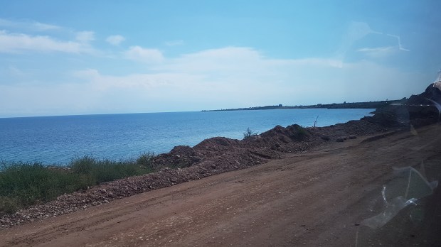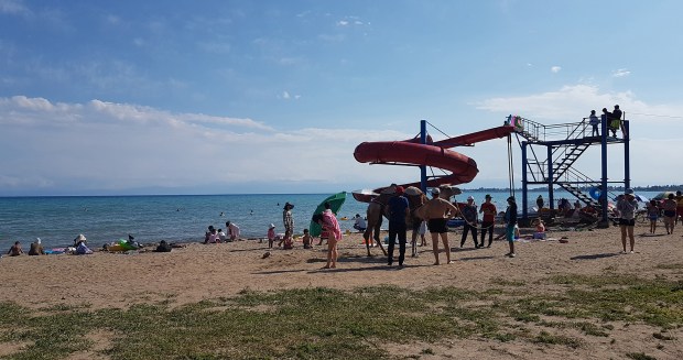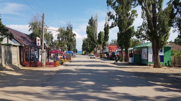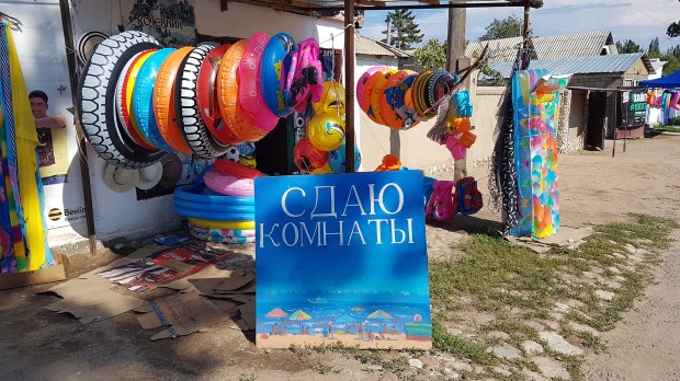 Die Straßen sind unbefestigt und staubig, die Geschäfte und Lokalitäten so schäbig und ungemütlich – und hier soll seit Jahrzehnten das Urlaubsparadies der Russen und östlichen Anrainerstaaten sein?!? Aber es geht noch schlimmer: Der Strand von Tamtschy setzt noch einen drauf. Okay, er hat alles, was Strände am Mittelmeer auch zu bieten haben: Hüpfburgen, Rutschen, Touristenboote, Strandbuden, Bananen-ziehende Speed-Boote … aber alles ist in einem dermaßen maroden, heruntergekommenen Zustand, dass es einen graust. Zusammen mit der lärmenden menschlichen Invasion, die völlig desinteressiert anstatt Spuren im Sand großflächig ihren Müll und Unrat hinterlässt, versetzt uns der Anblick in einen akuten Schockzustand.