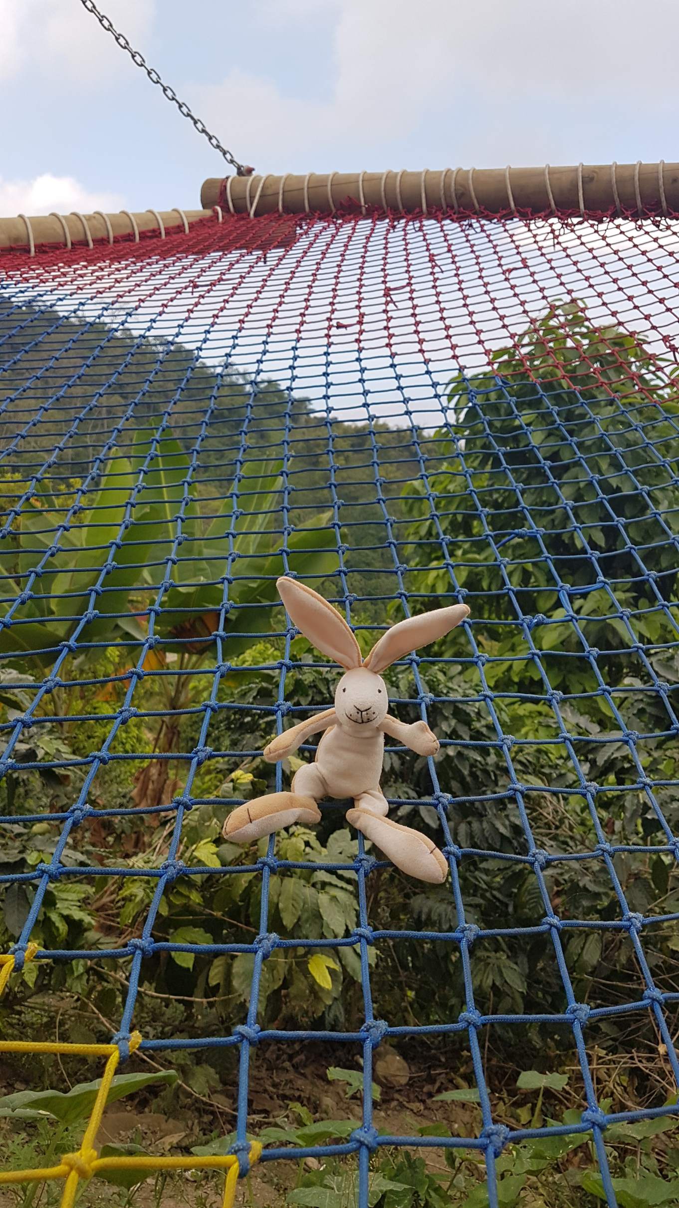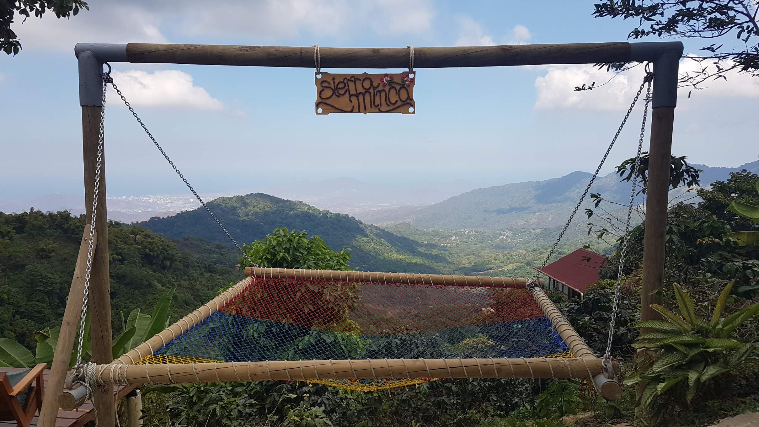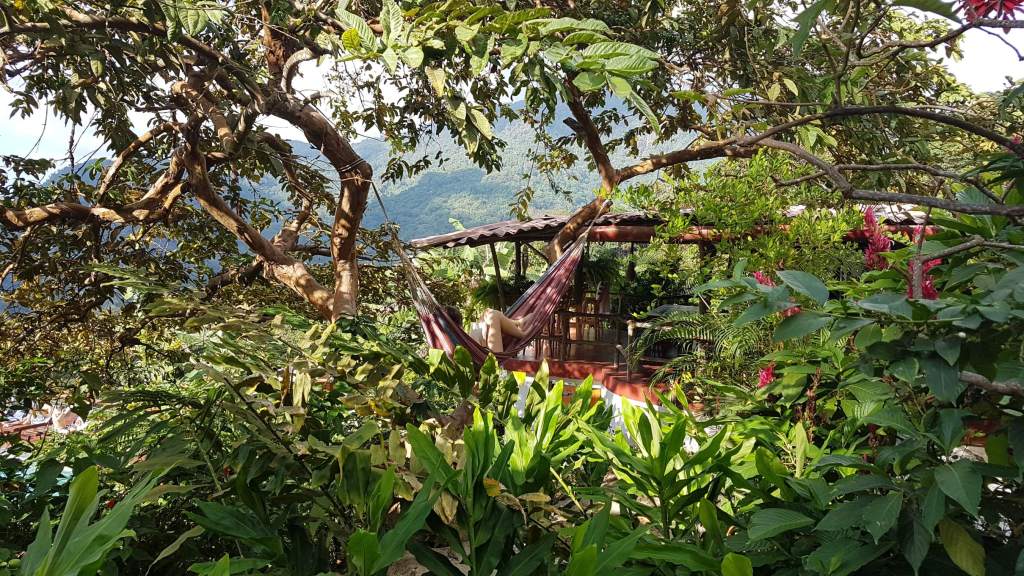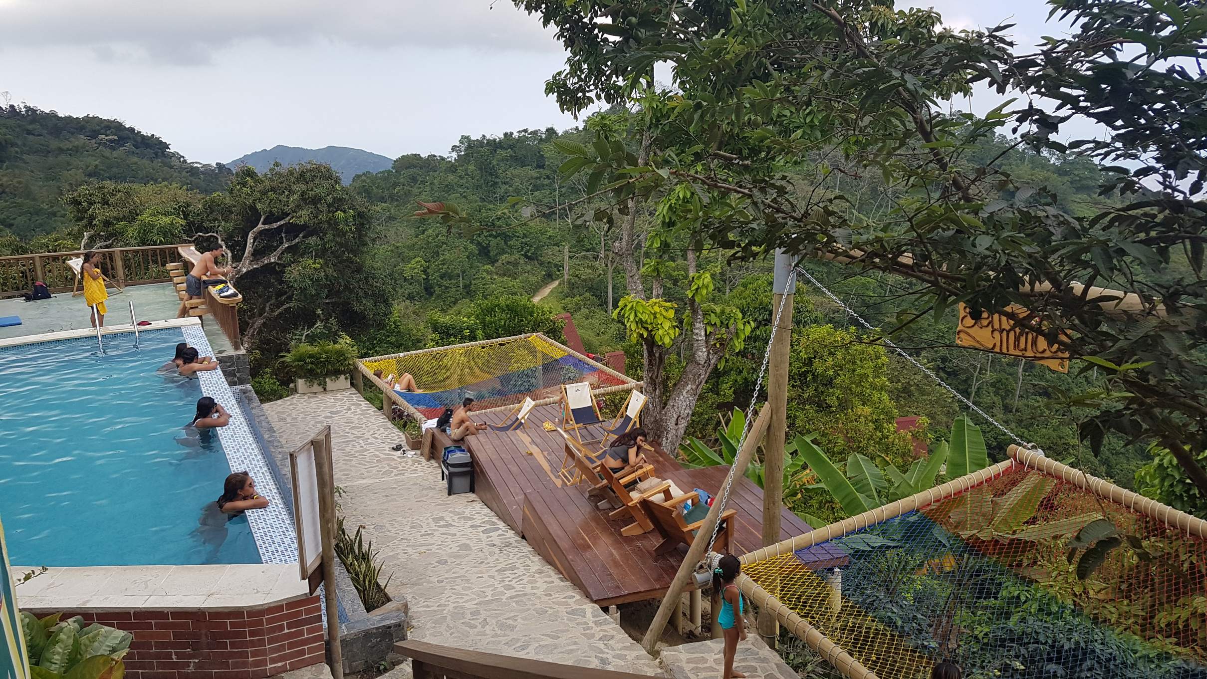 Anstatt einer halben Stunde laufe ich also eine Stunde zur Casa Elemento und muss auch wieder ein ganzes Stück nach oben aufsteigen. Die Casa Elemento ist bei jungen Backpackern aus aller Welt richtig beliebt, heißt aber inzwischen Sierra Minca. Als Gastbesucher muss man sozusagen einen Eintritt zahlen und bekommt ein Getränk dazu. Naja, wenn ich die Schönen und Coolen da so mit Cocktail im Pool abhängen sehe, bin ich doch schon sehr froh, für meinen Aufenthalt die Casas Viejas ausgewählt zu haben. Trotzdem probiere ich natürlich mit Hasi zusammen die Hängematte aus und wir chillen eine Weile: