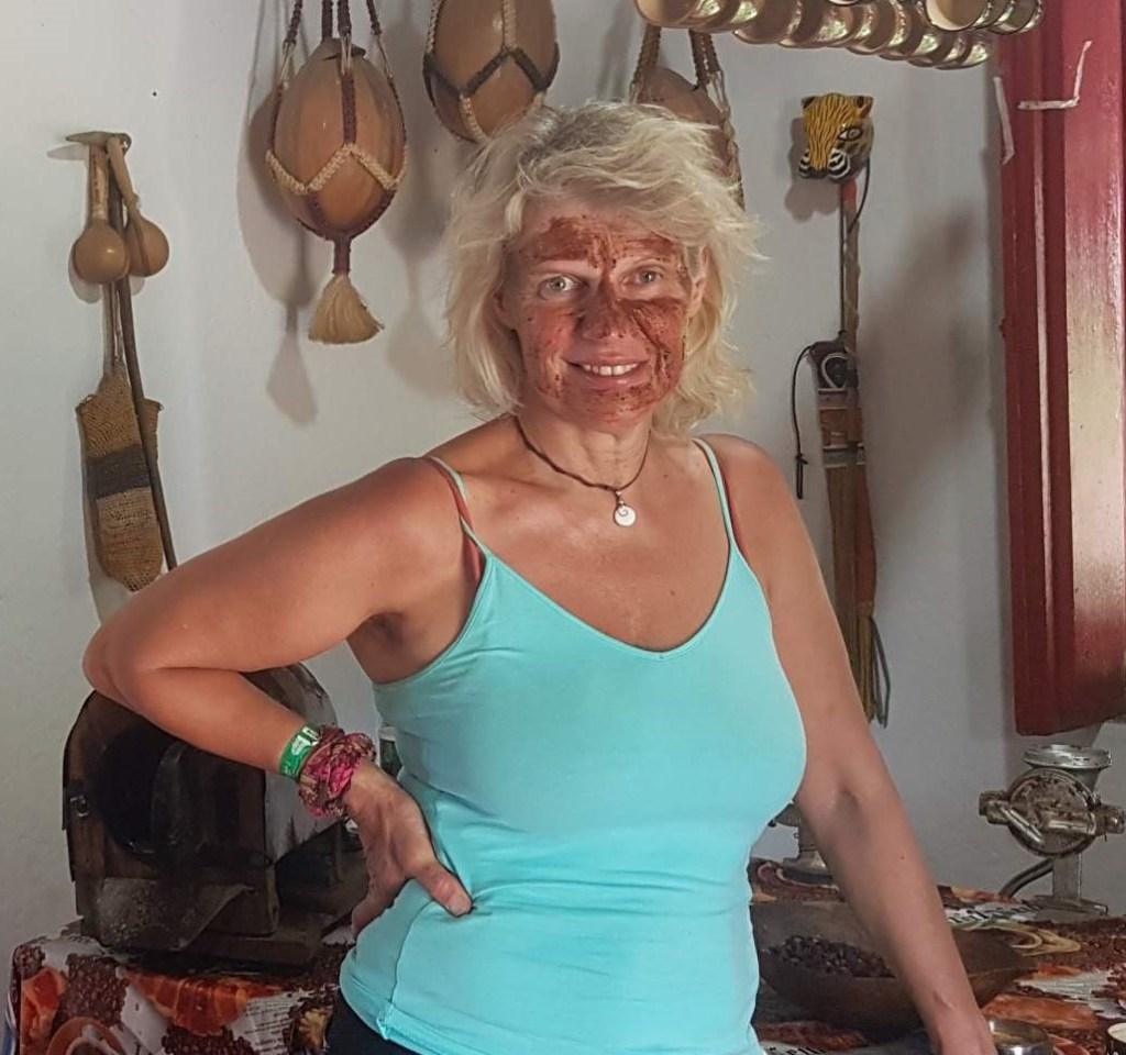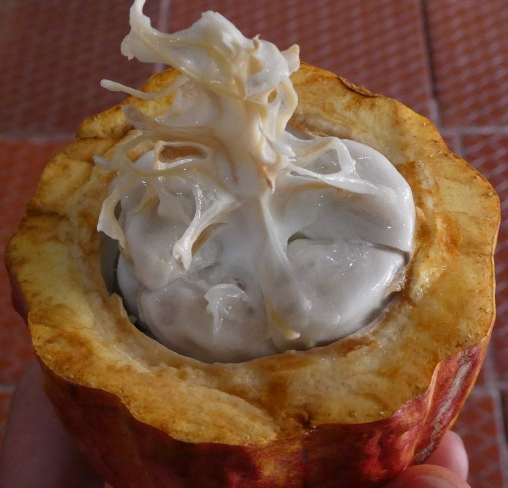 Die Kakao- und Kaffee-Finca der Familie Hidalgo ist traumhaft gelegen mit weitem Blick nach Santa Marta. Der Öko-Familienbetrieb in 3. Generation pflanzt außer Kakao auch Kaffee, Avodaco und Bananen an und hält Bienen. Noch bin ich alleine, als dann aber eine junge Australierin dazustößt, geht die Fast-Privat-Führung auch schon los. Für Señor Hildalgo ist das, was er macht, wirklich eine Herzensangelegenheit. Mit Feuereifer ist er dabei und hält eine tolle Präsentation, bei der wir Vieles über Kakao lernen. Unter anderem, dass unserer Schokolade die wertvolle Kakaobutter entzogen und diese durch billiges Palmöl ersetzt wird! Die gesunde Kakaobutter wird dann separat für teures Geld verkauft.