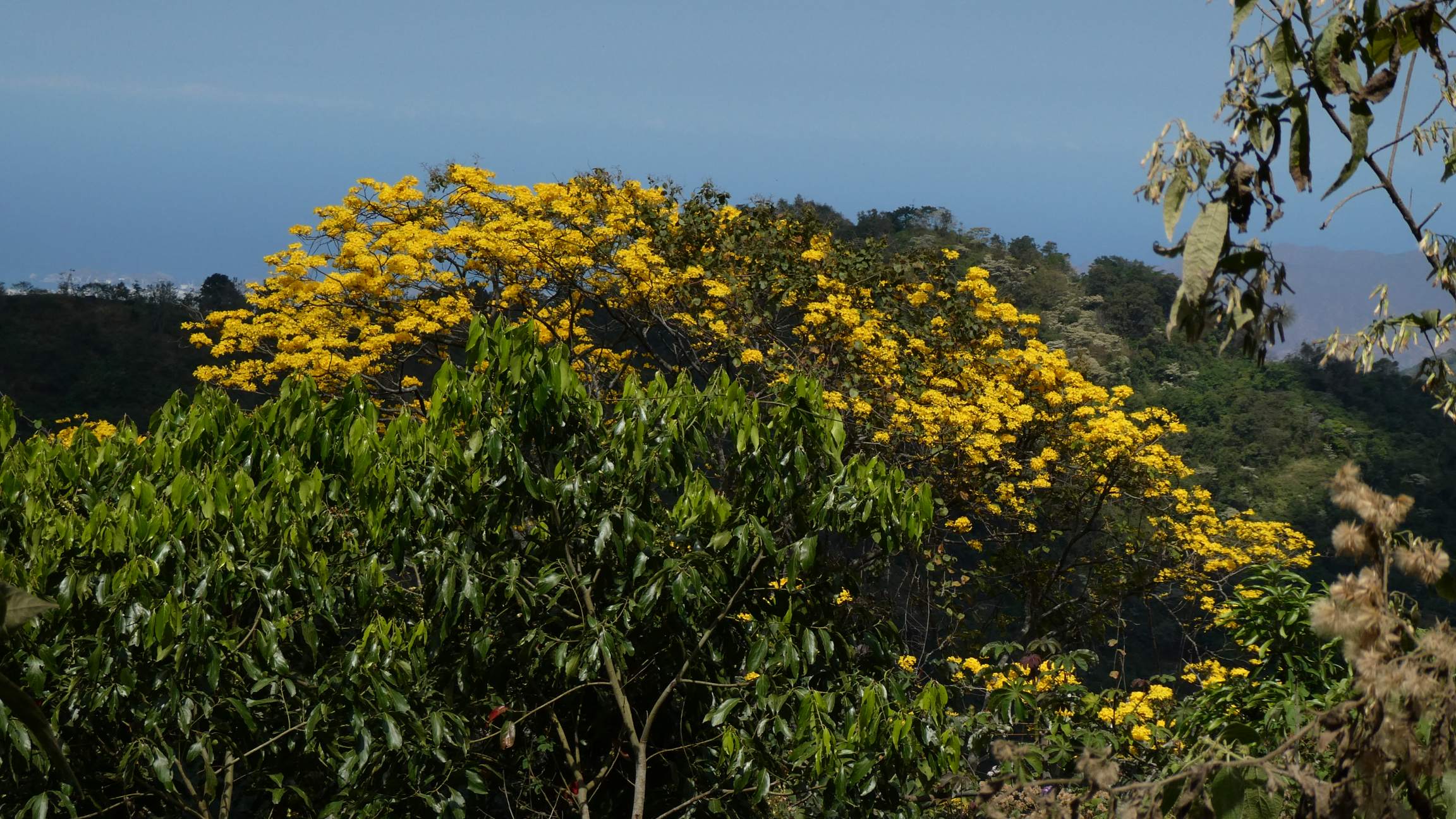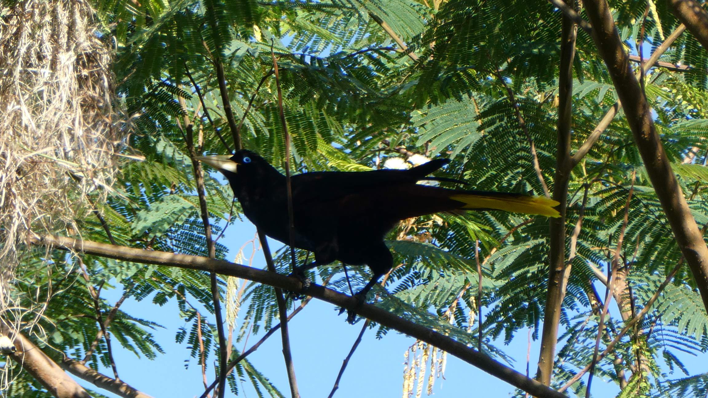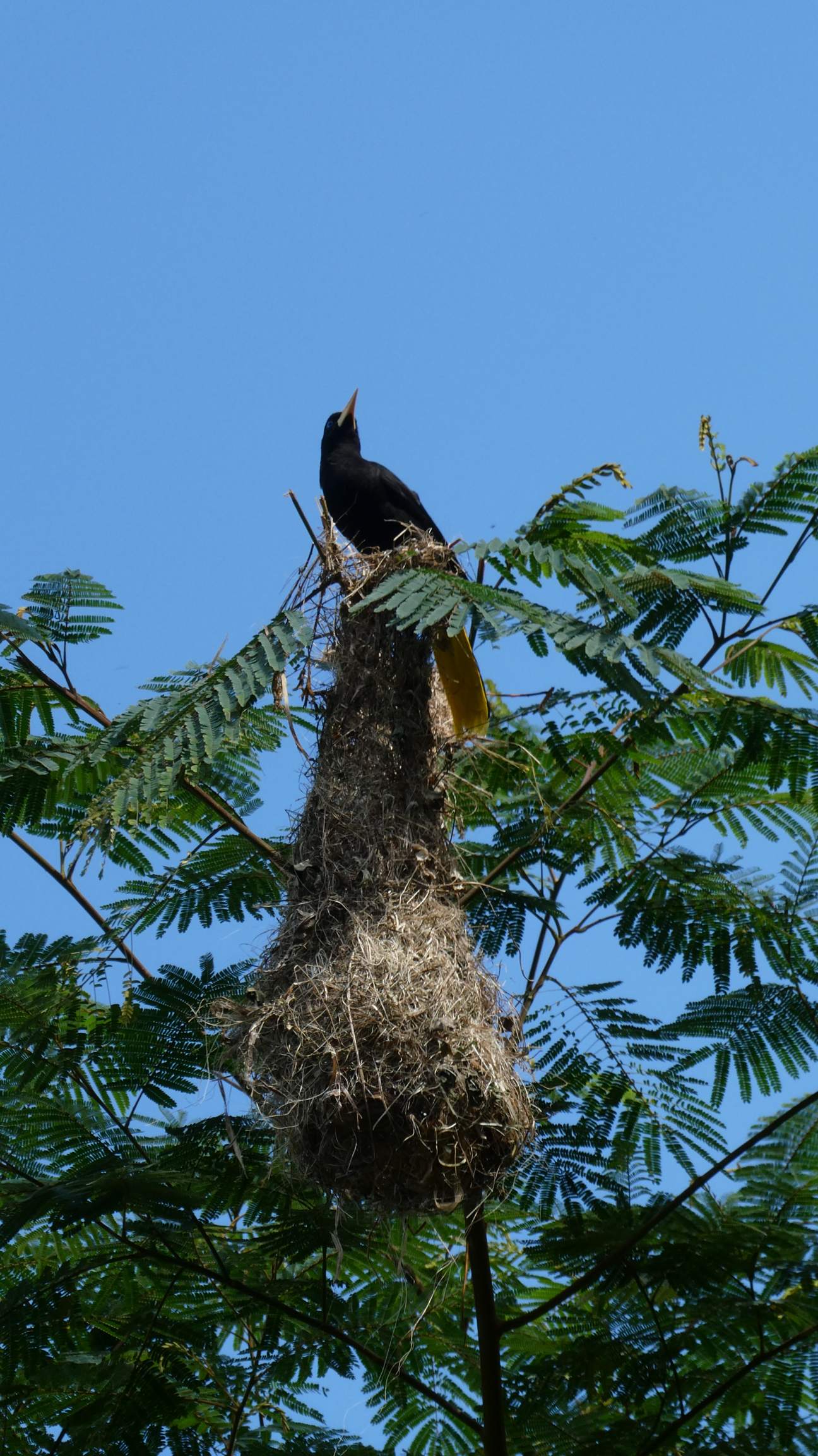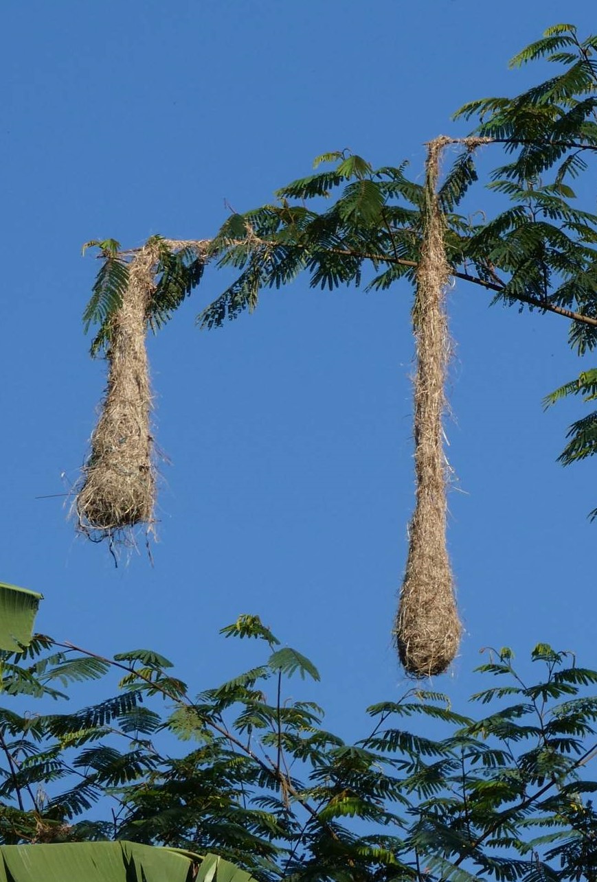 Das fängt ja schon mal gut an und das Frühstück ist auch der Hammer. Um 8.45 Uhr bin ich startklar für meine Wanderung – wie immer alleine. Ich möchte über den Aussichtspunkt Los Pinos zur Casa Elemento (bekannt für ihre Riesen-Hängematten) und dann über den Marinka Wasserfall nach Minca. Nur einen kurzen Anstieg weiter fasziniert mich ein alleinstehender Baum mit den großen Webervogel-Nestern. Bisher habe ich nur kleine Webervögel kennengelernt, aber diese lustig ausschauenden Gesellen haben eine stattliche Raben-Größe. Sie sind so witzig anzusehen mit ihren großen Augen und wenn sie fliegen leuchten die aufgefächerten Schwanzfedern knallgelb.