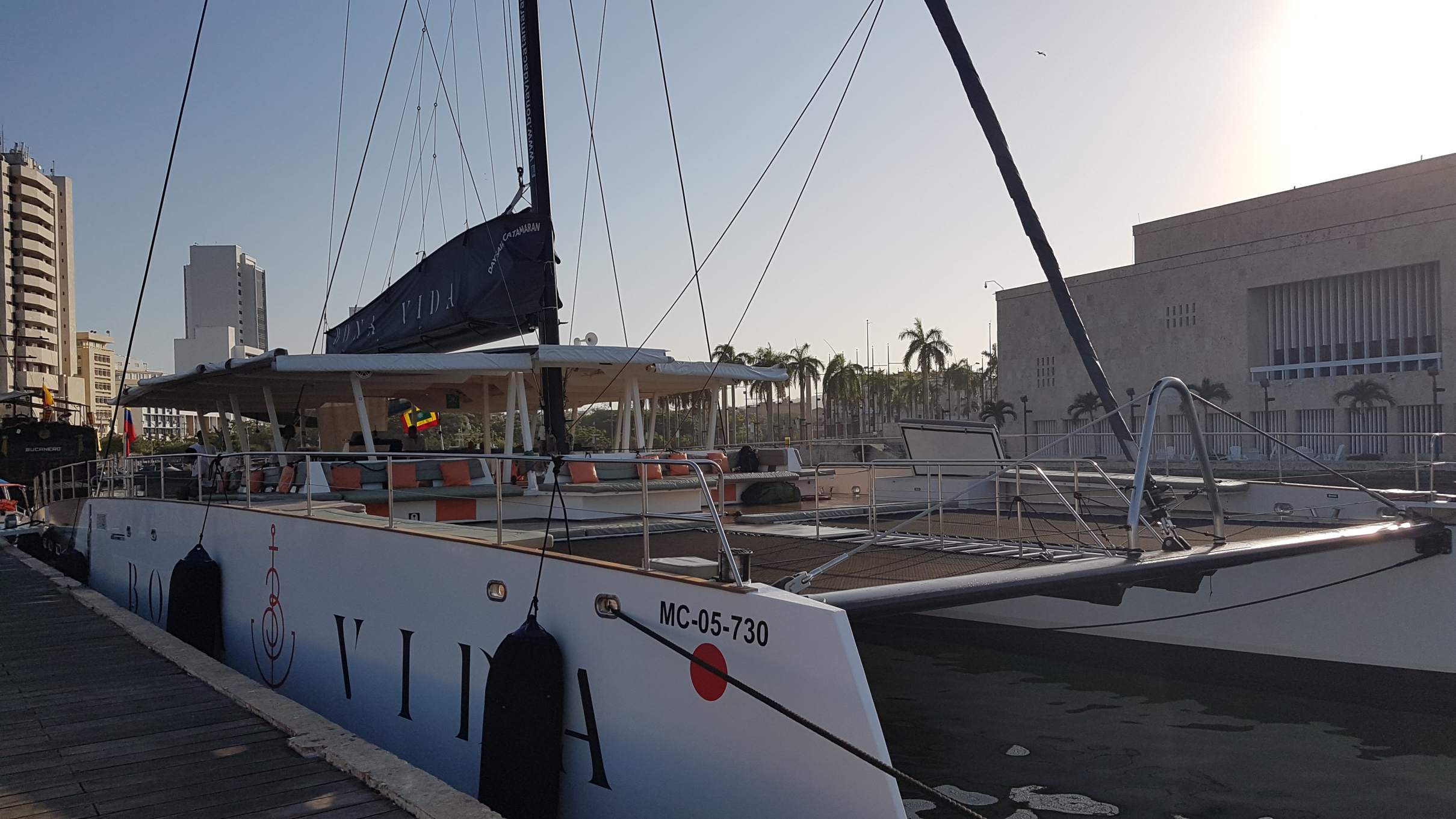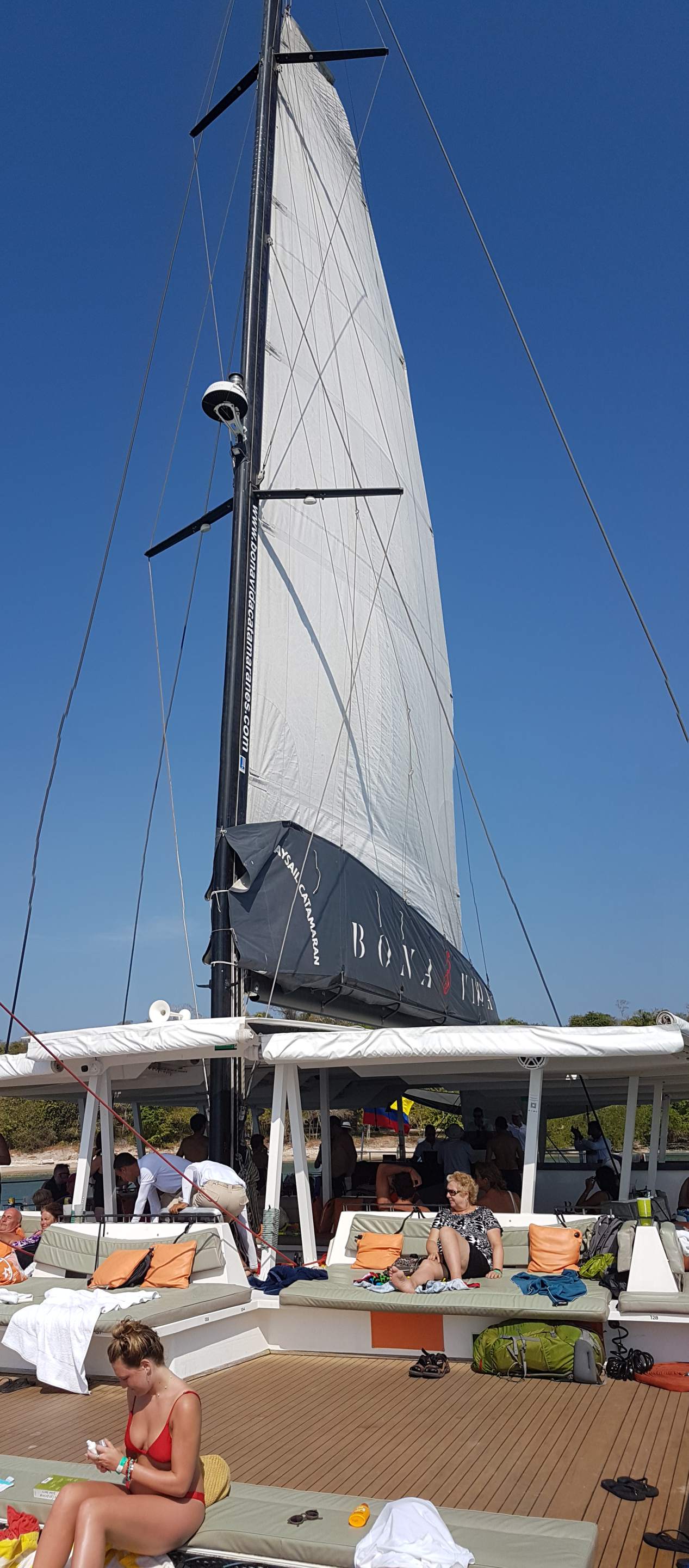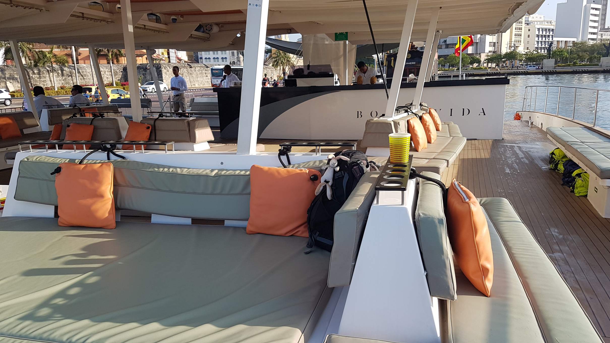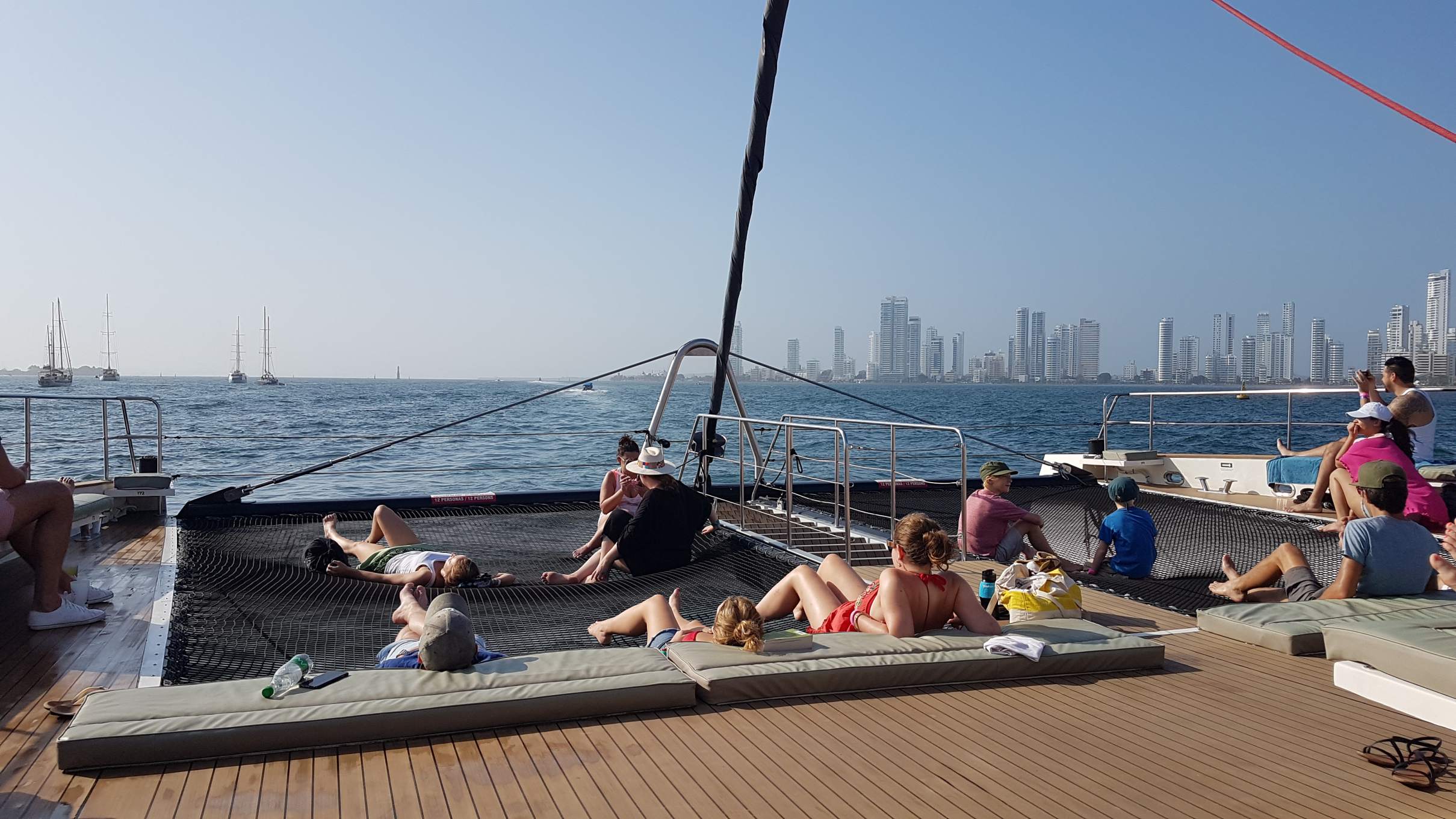 Am Samstag, den 08.02.2020, verabschiede ich mich vom Santuario Hostel und mache mich morgens früh auf zum Muelle de los Pegasos. Für den letzten Tag in Cartagena gönne ich mir für 70 € einen Tagesausflug mit dem Bona Vida Catamaran. Ich bin eine der ersten auf dem Catamaran und belege eine herrlich breite Liege. Immer mit der Nase im Fahrtwind schippern wir von 8.30 bis 16 Uhr durch das Karibische Meer, machen zwei Schnorchel-Stopps und werden mit einer köstlichen Paella verwöhnt. Alles in allem kein aufsehenerregendes Erlebnis, aber genau richtig zum Abschalten und Abschiednehmen. Bei der Rückfahrt nimmt der Steuermann nochmal ordentlich Fahrt auf, die Wellen schwappen in hohem Bogen aufs Vorderdeck. Sehr zur Gaudi aller Fahrgäste. Klar ist aber auch, dass da mein Backpack unter der Bank nicht trocken bleibt.