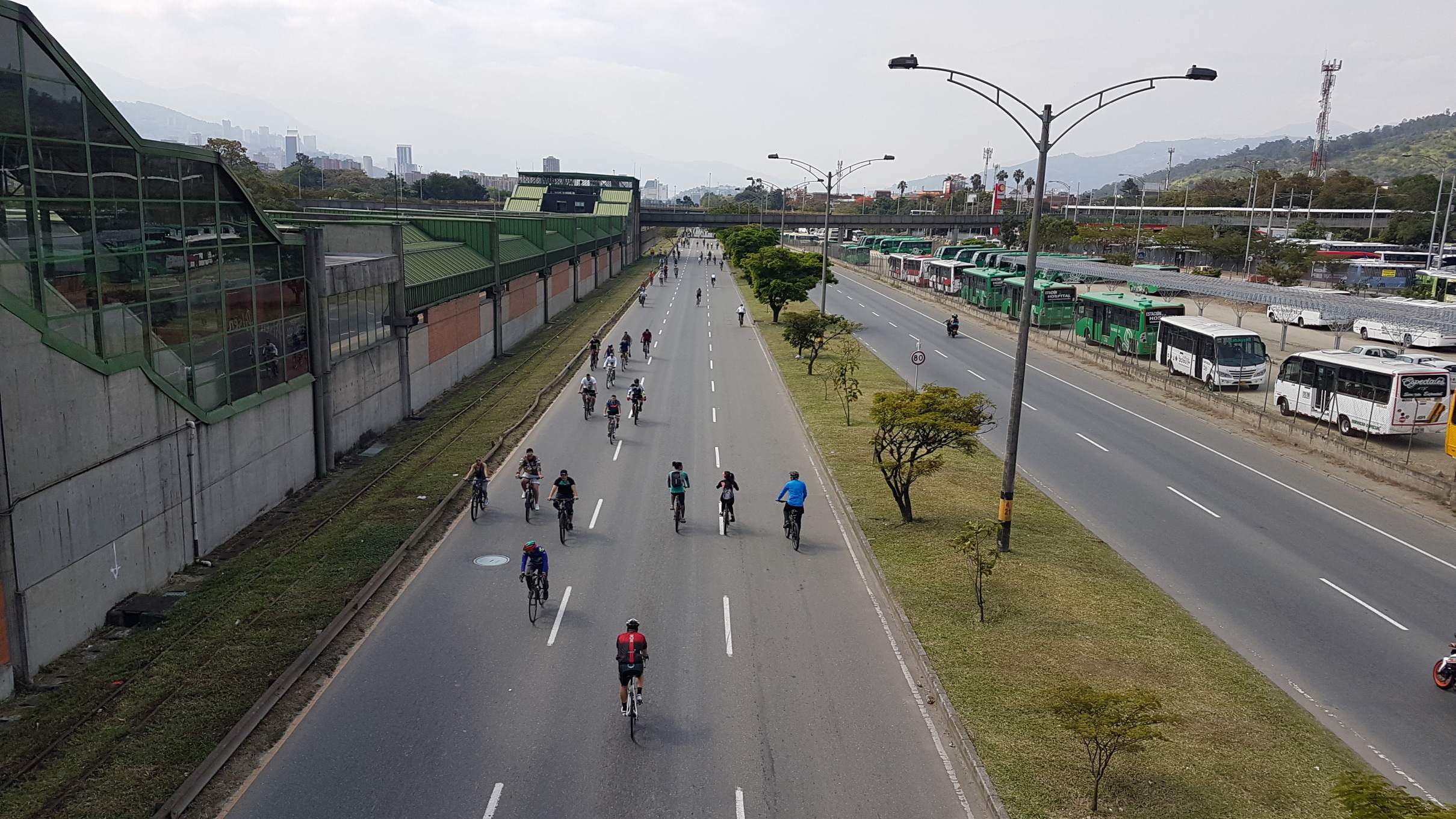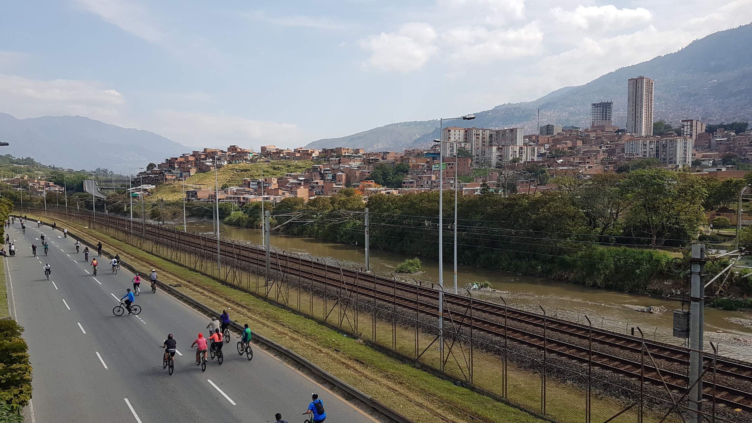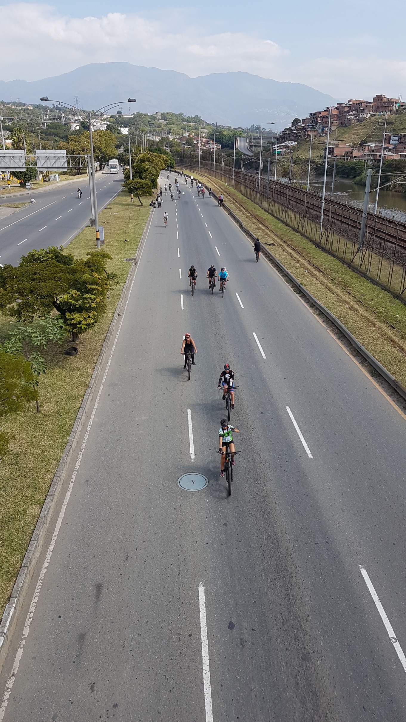 Über eine große Fußgängerbrücke überschreite ich die 6-spurige Einfallstraße nach Medellìn, die heute am Sonntag als Ciclo Vía freigegeben ist. Eine geniale und sehr beliebte Einrichtung in Kolumbiens Großstädten Bogotá und Medellín. Von 7 bis 13 Uhr werden JEDEN Sonntag und Feiertag große Hauptverkehrsstraßen für den Autoverkehr gesperrt. Dann gehören die breiten Straßen allen, die sich ohne Motor fortbewegen. Vom enthusiastischen Rennradfahrer über Inliner- und Tretrollerfahrer bis zum Kinderrad oder Kinderwagen ist alles vertreten und die Kolumbianer nutzen die Gunst der autofreien Stunden.