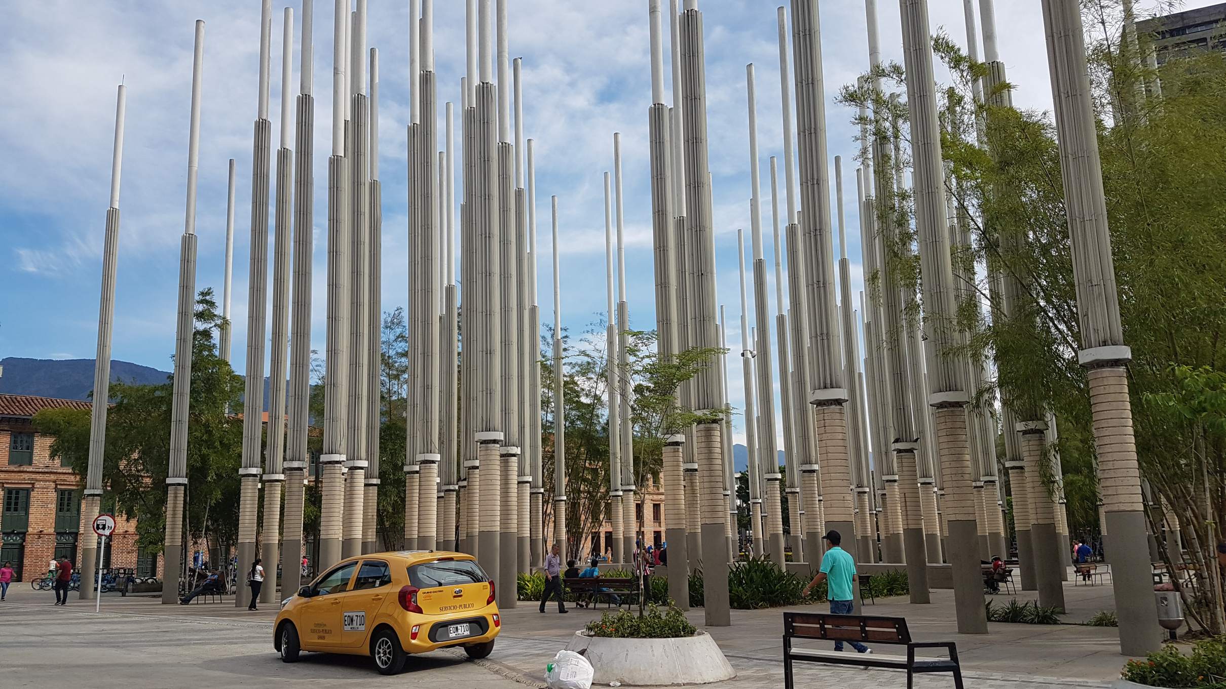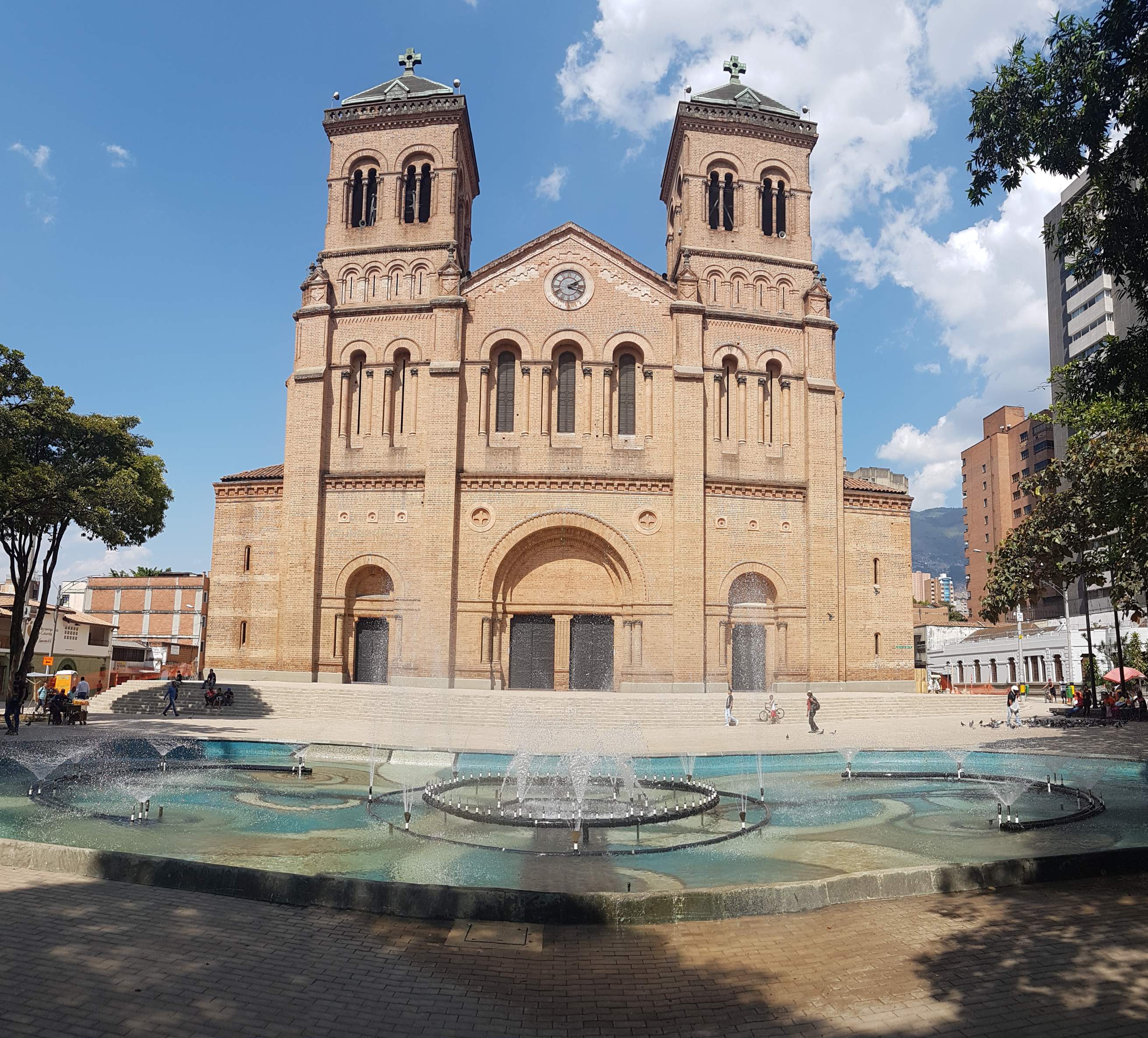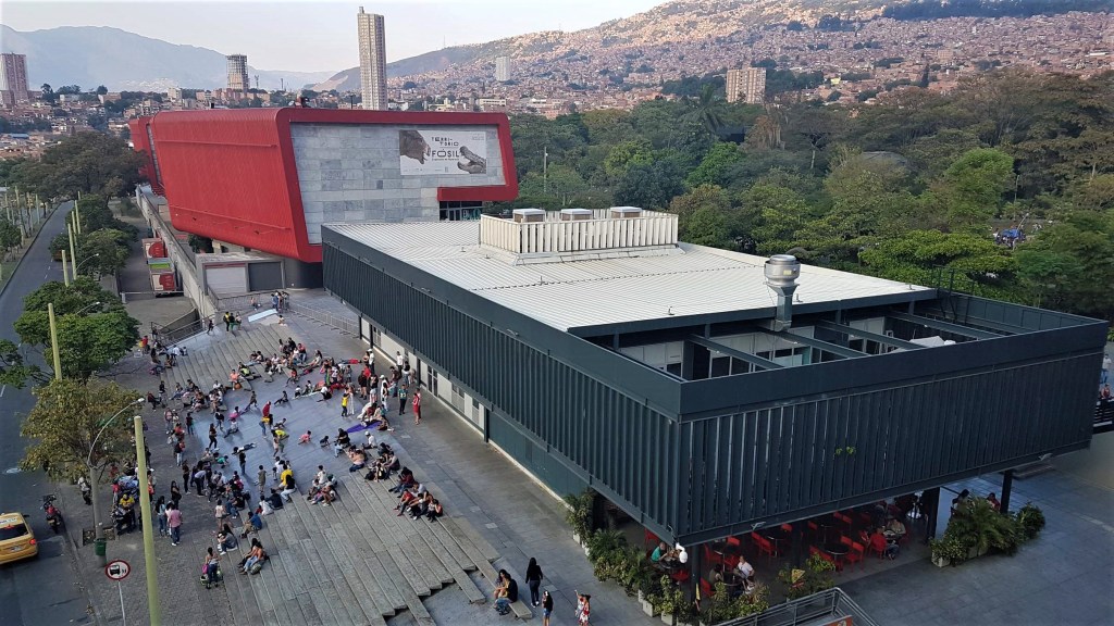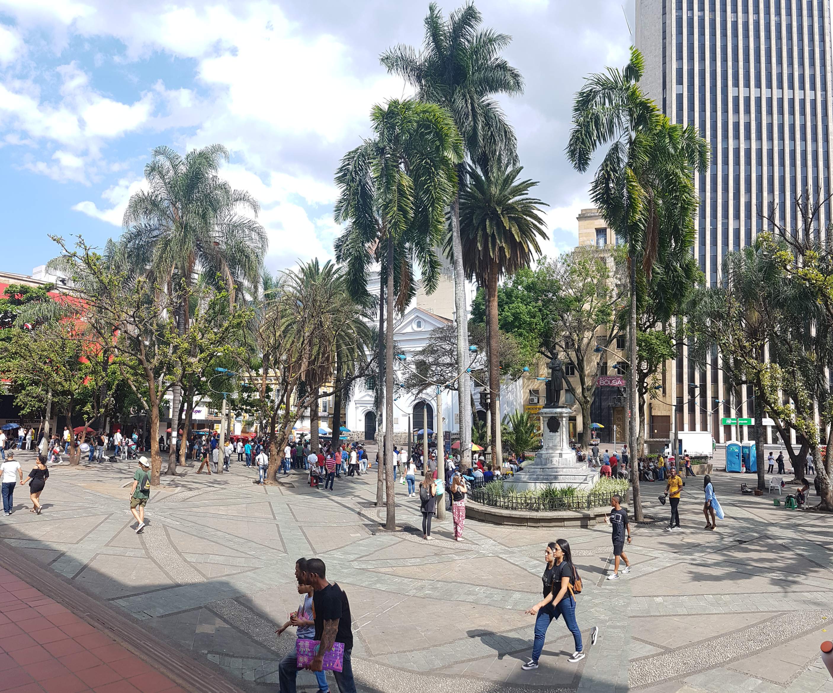 Apropos „Parque …“ – Die Örtlichkeitsbezeichnung „Parque“ in Kolumbien und ganz speziell hier in Medellín ist nicht zwangsläufig gleichzusetzen mit einem „Park“ im klassischen Sinne. Zwar stehen auch in diesen „Parques“ vereinzelt ein paar alte Bäume rum, aber ansonsten ist alles zugepflastert und zugemauert. Zwei weitere schöne Beispiele in Medellín sind der Parque Berrío …