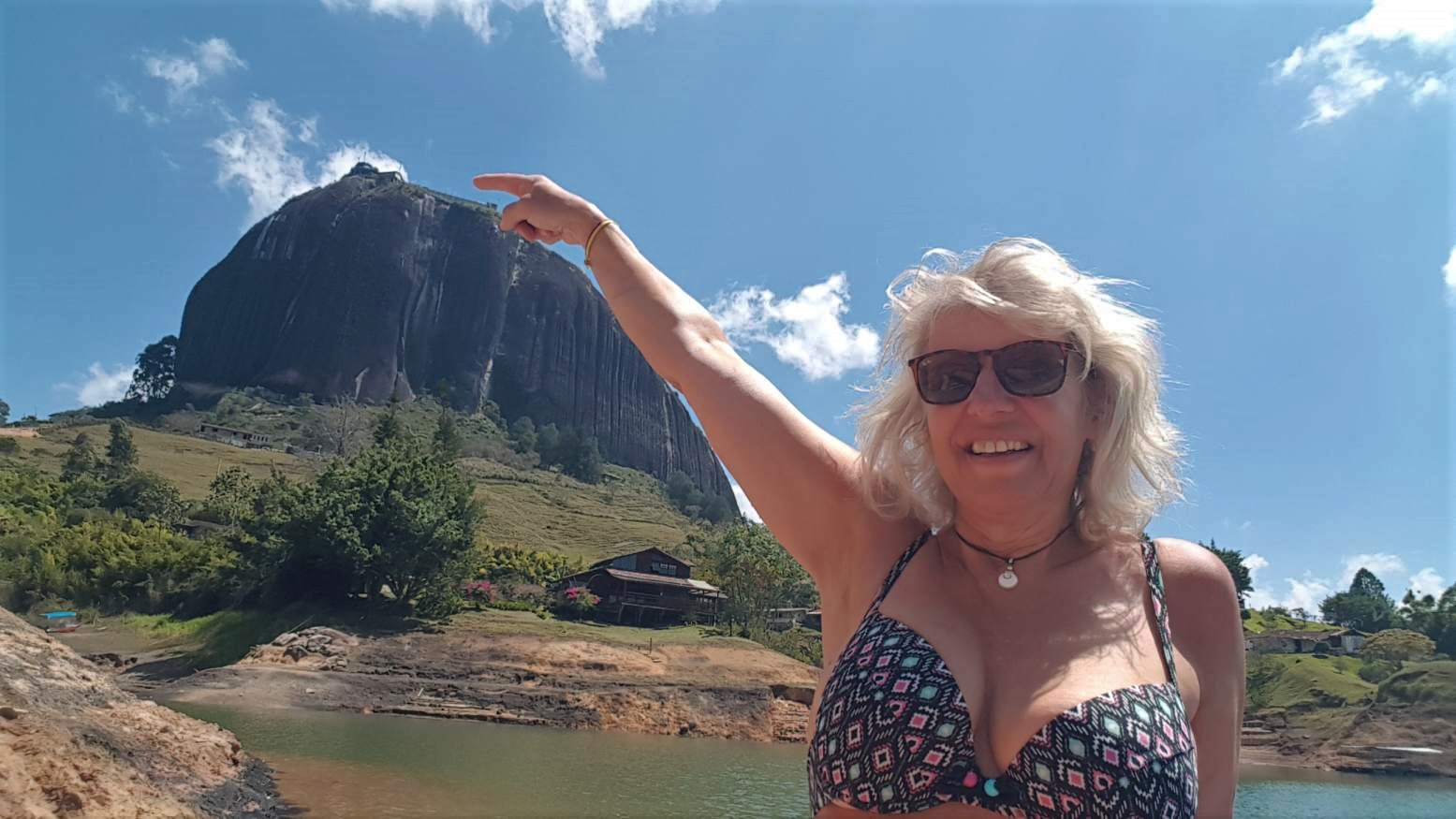 Solch ein fotogener Hotspot zieht natürlich auch das Instagram-Völkchen an und so vergehen an der Reling schon mal 10 Minuten, bis alle Posing-Varianten durchexerziert sind. Aber ich habe ja alle Zeit der Welt und muss nicht wieder runterspurten, um das Collectivo nach Medellín zu erwischen. Nach einem miserablen Kaffee in der dürftigen Gipfel-Restauration versuche ich noch einmal mein Glück. Dabei treffe ich auf drei junge Chilenen, die in jedes Foto ein Bild halten. Weil sie mir sympathisch sind, frage ich, ob ich sie zusammen mit dem „Foto im Foto“ ablichten soll, was sie begeistert annehmen. Dann erzählen sie mir, dass sie diese Kolumbien-Reise eigentlich zu viert unternehmen wollten, ihr bester Freund aber ernsthaft erkrankt ist und deshalb nicht mit konnte. Nun denken Sie bei jedem Foto-Spot an ihn und lassen ihn so teilhaben. Da fällt mir doch glatt ein, dass ich Hasi noch gar nicht mit diesem fantastischen Ausblick in Szene gesetzt habe, was ich natürlich gleich nachhole.