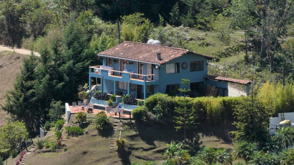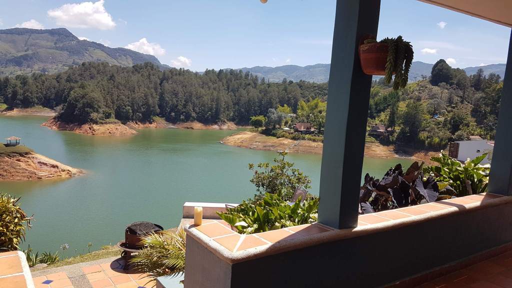 Die Auswahl des Hostels in Guatapé war nicht ganz einfach, denn wenn man die Luftaufnahme der Region anschaut, hat man schon die Qual der Wahl, in welcher der Nischen und Buchten des riesigen Stausees man sich niederlassen sollte. Oder doch gleich direkt in dem Örtchen übernachten? Da zu erwarten ist, dass Guatapé äußerst touristisch, laut und nicht wirklich ursprünglich ist, habe ich ein Hostel etwa 15 Minuten Fahrzeit vor Guatapé gewählt. Es liegt günstig nahe eines Bushalte- und Rastplatzes an der Straße, ich komme also jederzeit mit dem Collectivo überall hin und wieder zurück. An diesem Busstopp lasse ich mich nun also von meinem Fahrer mitsamt Zweitages-Gepäck absetzen und laufe nur ein paar Meter bis zum Galeria Hostel: