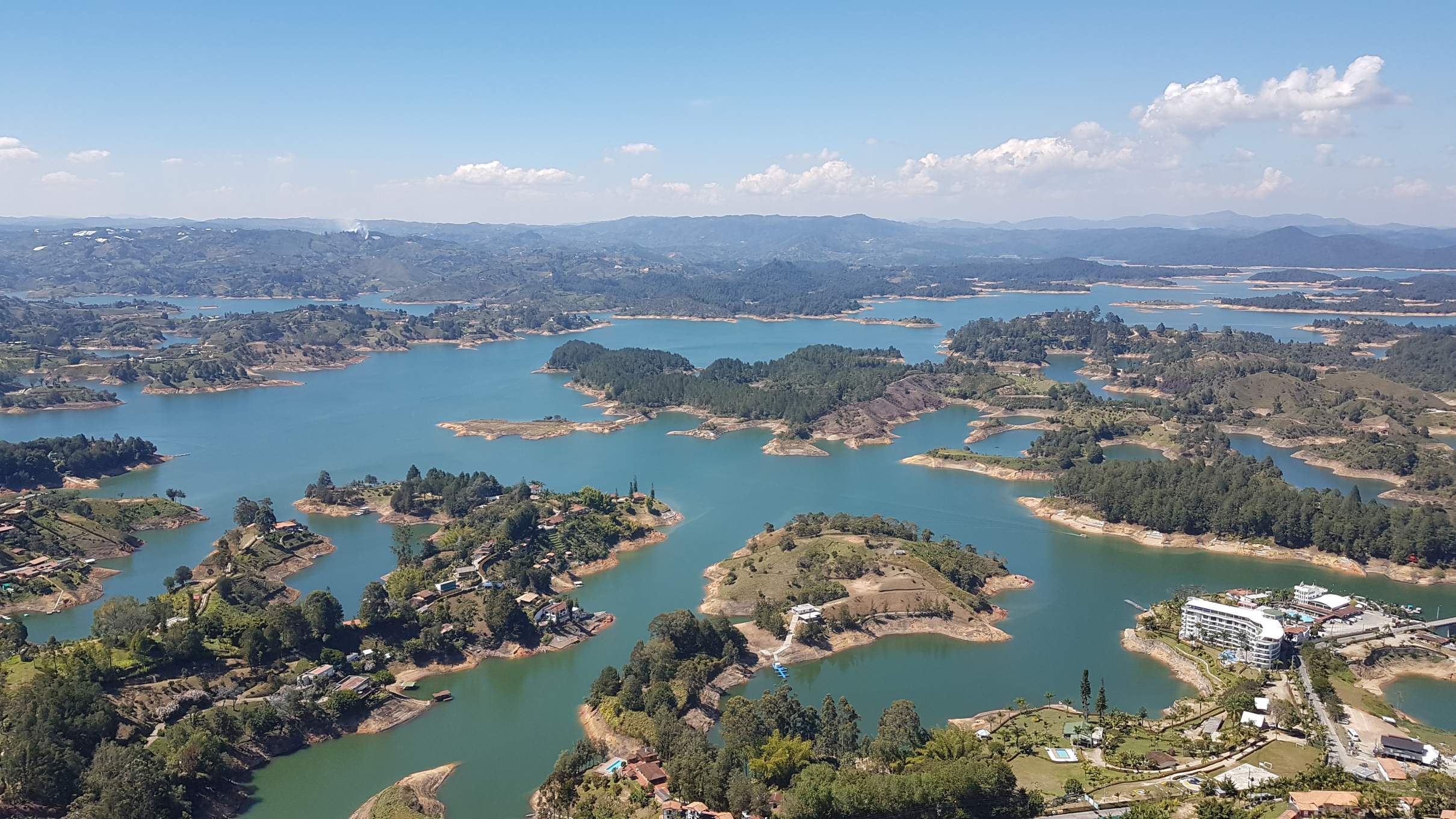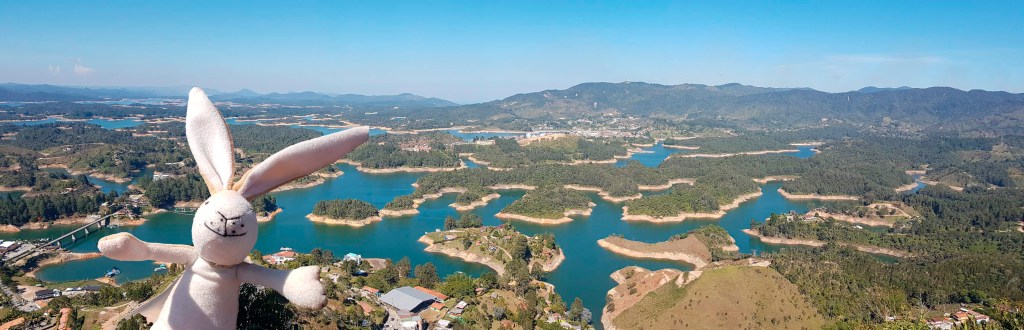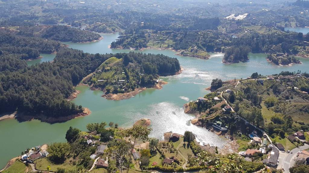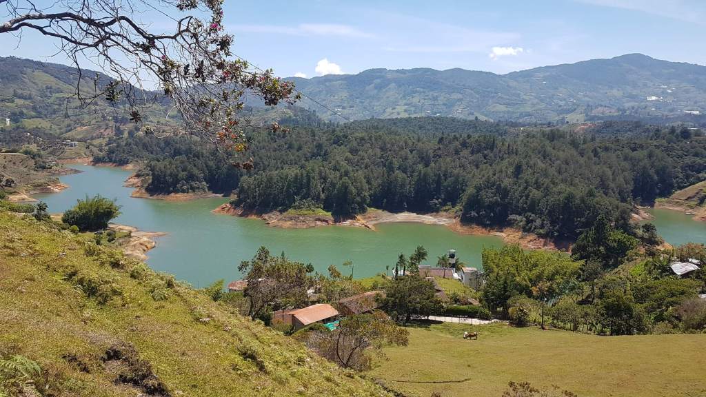 Das Pueblo Guatapé am gleichnamigen Stausee liegt etwa 85 km von Medellín entfernt. Viele machen nur einen Tagesausflug dorthin, ich möchte aber nicht ständig auf die Uhr schauen und werde deshalb über Nacht bleiben. Der lokale Bus fährt vom Terminal del Norte ab, das ja nicht so weit von meinem Hostel entfernt liegt. Und wie genial: Wenn ich schon mal hierbin, kann ich gleich am Schalter von Rapido Ochoa das Busticket für meine Weiterfahrt nach Jardín für den kommenden Freitag buchen. Gesagt getan und schon geht’s weiter an den Schalter Richtung Guatapé. Auch da läuft es wie am Schnürchen, Ticket gekauft, Gepäck gescannt und den letzten Platz im vollen Bus erwischt, den ganz vorne am Fenster. Um 8.50 Uhr setzt sich der Bus in Bewegung, die 2-stündige Fahrt kostet gerade mal 4 € (15.000 COP). Das ist mal ein günstiger Touri-Ausflug, bei dem ich – nach Verlassen des Stadtgebiets – genussvoll die Aussicht genieße auf sanfte Hügel, Wiesen und Weiden mit kleinen Fincas, die Rinderzucht oder Gemüseanbau betreiben.