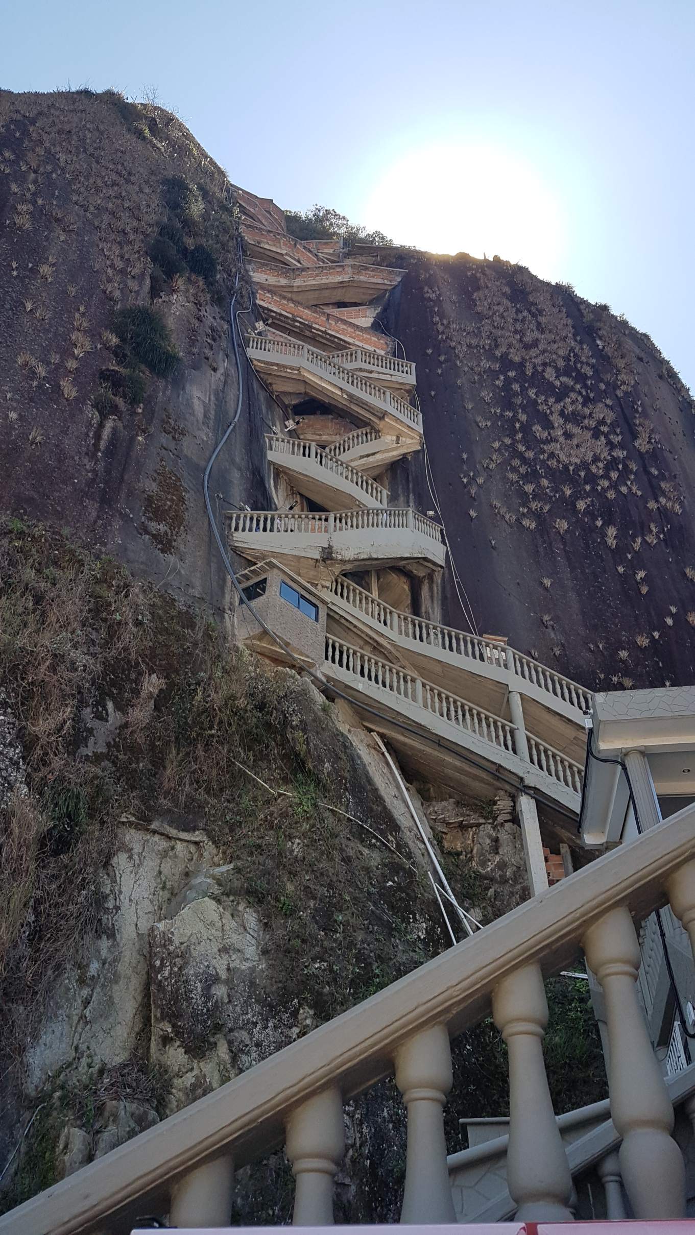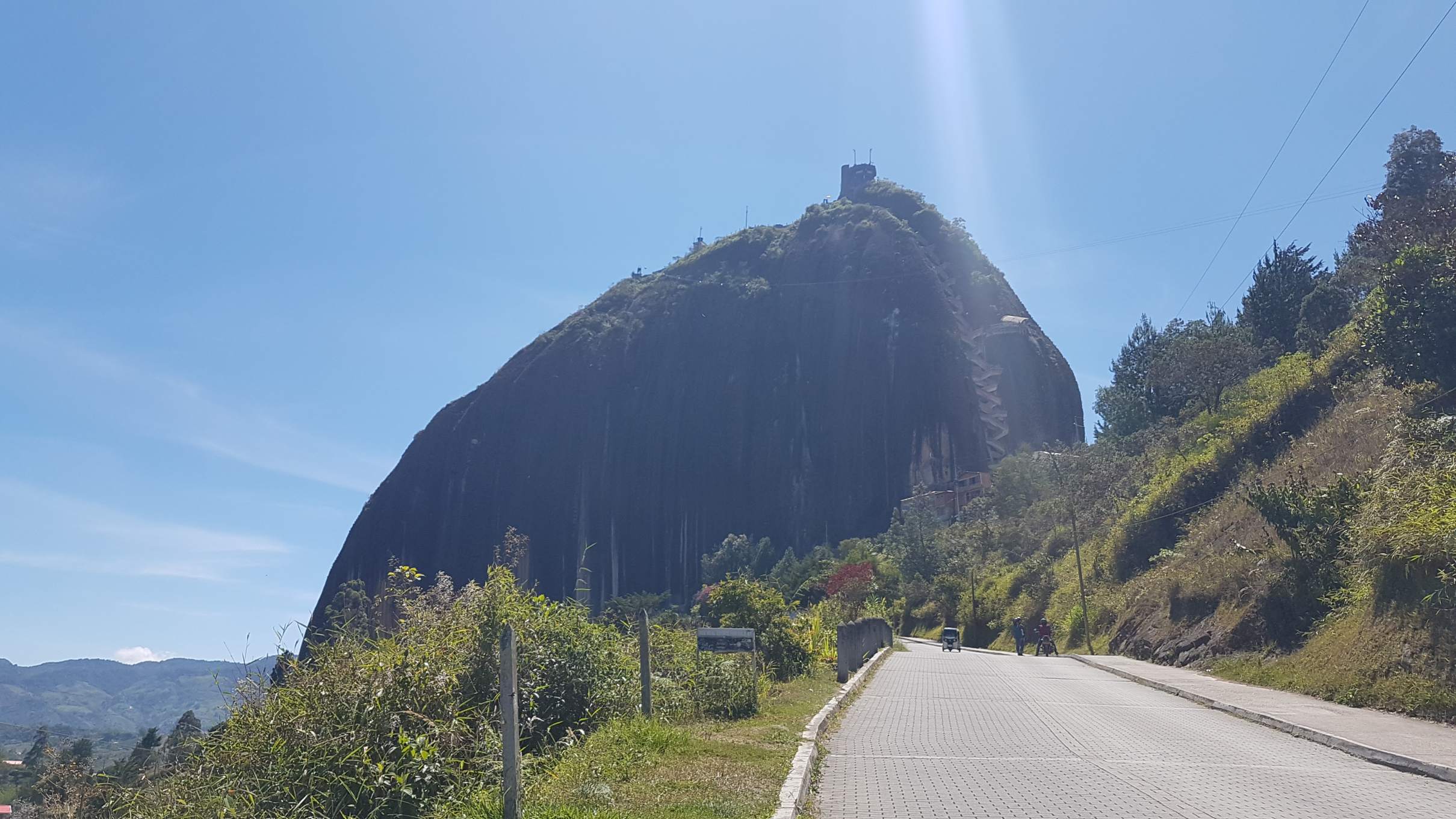 Nach etwa 20 Minuten komme ich zu einem steil aufführenden Pfad, der als Abkürzung zum Eingang des Peñol-Aufstieges führt. Ein fleißiges Ehepaar steht Spalier und möchte für das Durchqueren ihres Areals ein Wegegeld. Die Art und Weise der Geldeinforderung gefällt mir gar nicht. Da ich nicht fußlahm bin, laufe ich den weiteren Weg außen rum und erklimme über die offizielle Zufahrt (ja, man kann sich natürlich auch mit einem der bunten Tuk-Tuks oder mit dem Auto hochfahren lassen) die letzten Höhenmeter bis zur riesigen Treppe, die in 670 Stufen auf den 2.135 m hohen El Peñol führt.