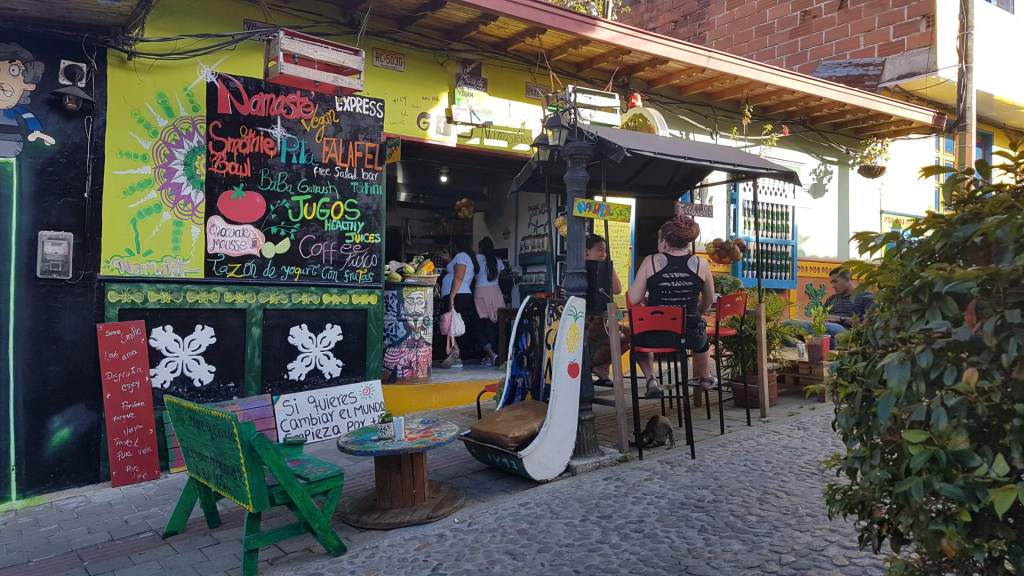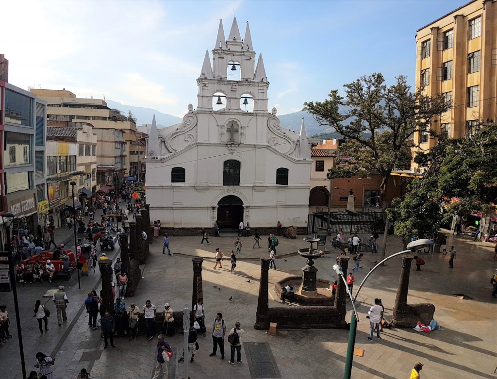 Unweit des Plaza Botero hatte ich eine Restaurant-Empfehlung ausgemacht, natürlich wieder vegetarisch für mich, Govindas. Von meinem Tisch hier oben habe ich das ganze Treiben auf der Straße und dem Vorplatz der alten Iglesia de la Veracruz voll im Blick.