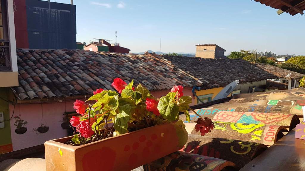 Nach dem Frühstück gehe ich noch einmal eine große Runde schwimmen und lass mir auf dem Ponton die warme Sonne auf den Pelz scheinen. Um 12 Uhr stehe ich an der Bushaltestelle in Fahrtrichtung Medellín. Der erste Bus fährt übervoll an mir vorbei, doch der zweite hält an. Auch er ist vollbesetzt, aber ob meines Alters tritt mir ein junger Kolumbianer seinen Sitzplatz ab. Neben mir sitzt Sophia, leicht alternativ, 38 Jahre alt, aus Medellín. Sie lebt mit ihrem Töchterchen in Guatapé und verkauft Silberschmuck. Heute ist sie auf dem Weg zu ihrer Mama – hört sich nach einem „Pflichtbesuch“ an. Sie möchte mich gleich auf einen Kaffee bei Muttern mitnehmen 😉