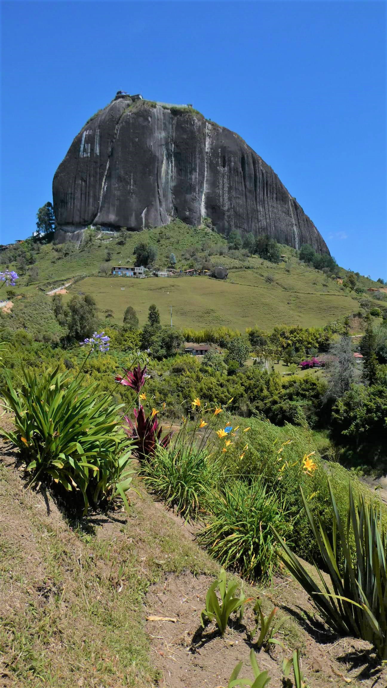 Okay, erst um 13 Uhr mit der Umrundung und dem Aufstieg zum El Peñol zu starten, ist bei der Hitze vielleicht etwas verplant. Aber die Sicht und das Licht sind sicher besser als am Morgen und ich habe ja meinen roten Sonnenschirm als Schattenspender dabei. Vom Hostel aus kann ich in einem Bogen zum Fuß des Granitpfeilers aufsteigen und dort entlang eines herrlichen Wanderpfades in ca. 30 Minuten um den ganzen Sockel wandern – natürlich mit herrlichen Aussichten.