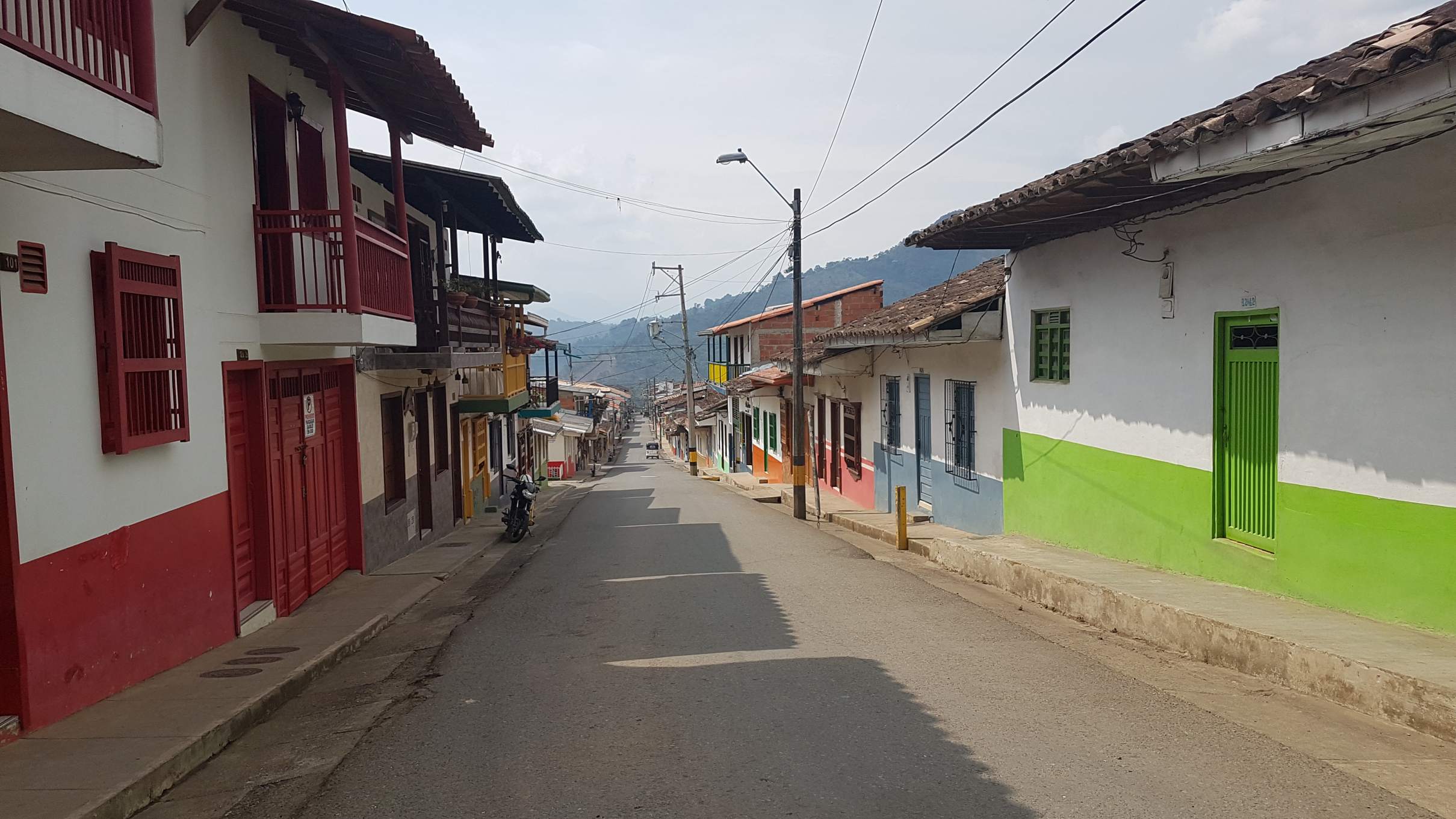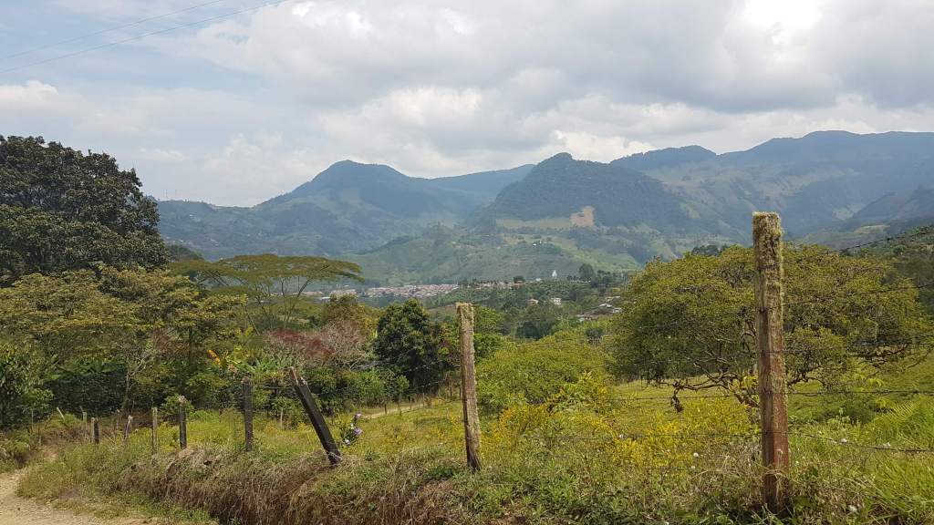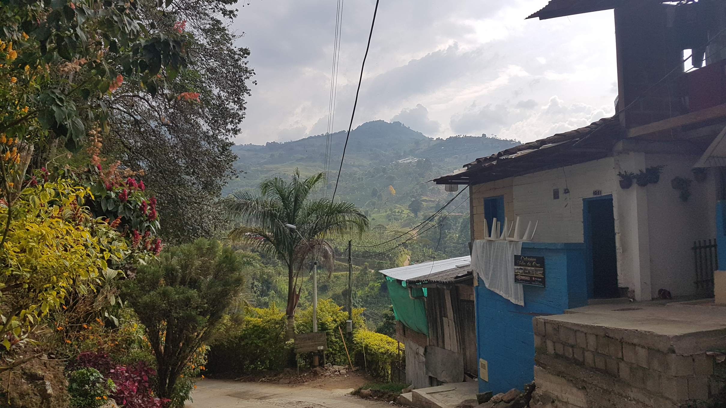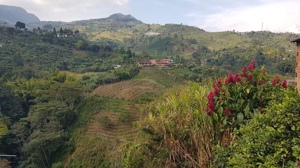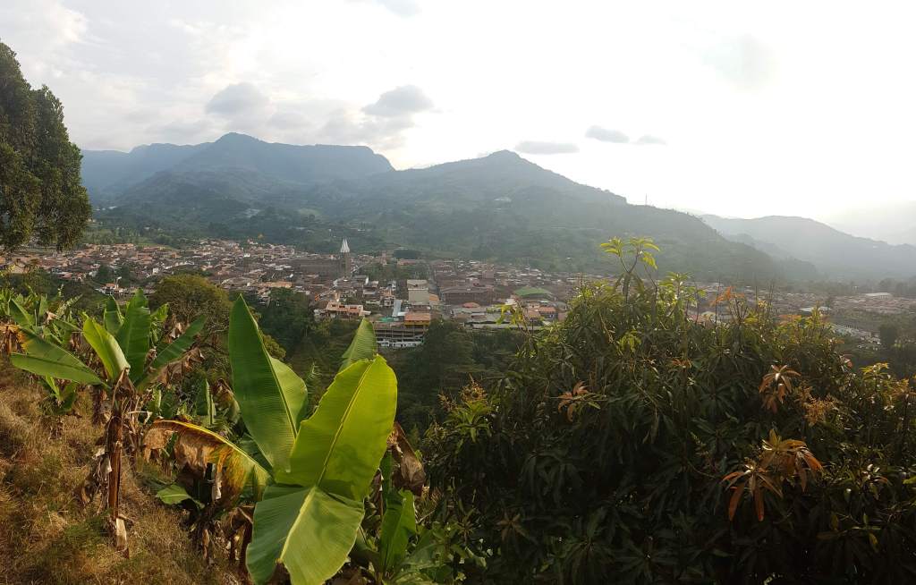 Die 4-stündige Fahrt ist etwas überschattet von der Sorge um die für das kommende Wochenende angekündigten Demonstrationen der Guerilla-Gruppe ELN (Nationale Befreiungsarmee), die gerade auf dem Land auch mal gewalttätig ausarten können. Mein Sitznachbar, ein älterer, sehr gepflegter Herr, und ich hoffen, dass wir an diesem Freitag noch unbehelligt nach Jardín kommen. Der Señor reist eigens für einen Gottesdienst seiner Glaubensgemeinschaft dorthin. 4 Stunden Fahrzeit auf holprigen Straßen über die Cordillera Occidental mit Schlaglöchern und Serpentinen, nur um vor Ort gemeinsam zu beten, wäre jetzt nicht so meins. Aber mein angenehmer Zufallsreisegefährte erzählt mir nebenbei von Land und Leuten, zeigt mir den Cerro Bravo und die spitze Pyramide des Cerro Tusa … In Bolomboló im Distrikt Venecia machen wir zum ersten Mal Rast und werden kurz nach dem Ort erneut angehalten: Razzia – alle Männer müssen aus dem Bus aussteigen und ihre Papiere herzeigen. Entlang des Río Cauca und des Río Pedral geht es weiter über Hispania und Andes Richtung Jardín. Erste Kaffeeplantagen steil wie Weinberge kleben an den Berghängen. Um 13 Uhr erreichen wir unser Ziel.