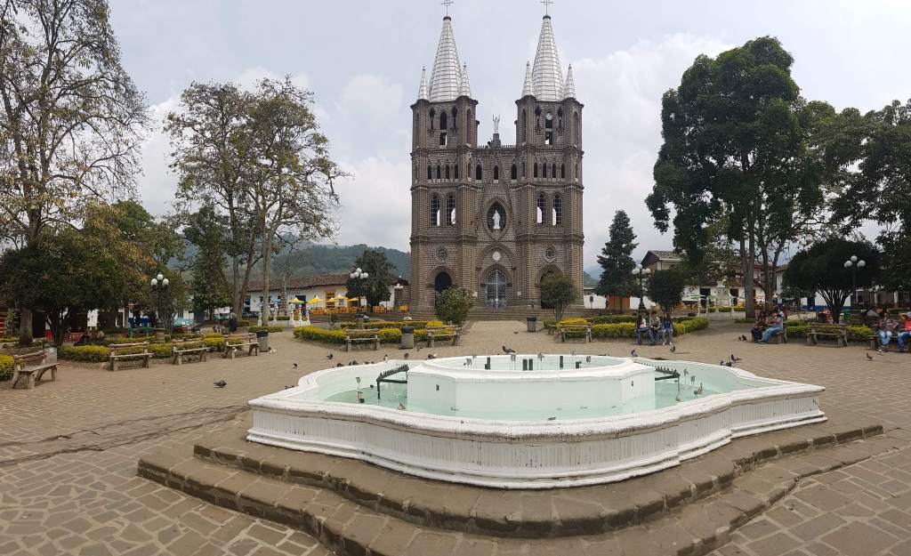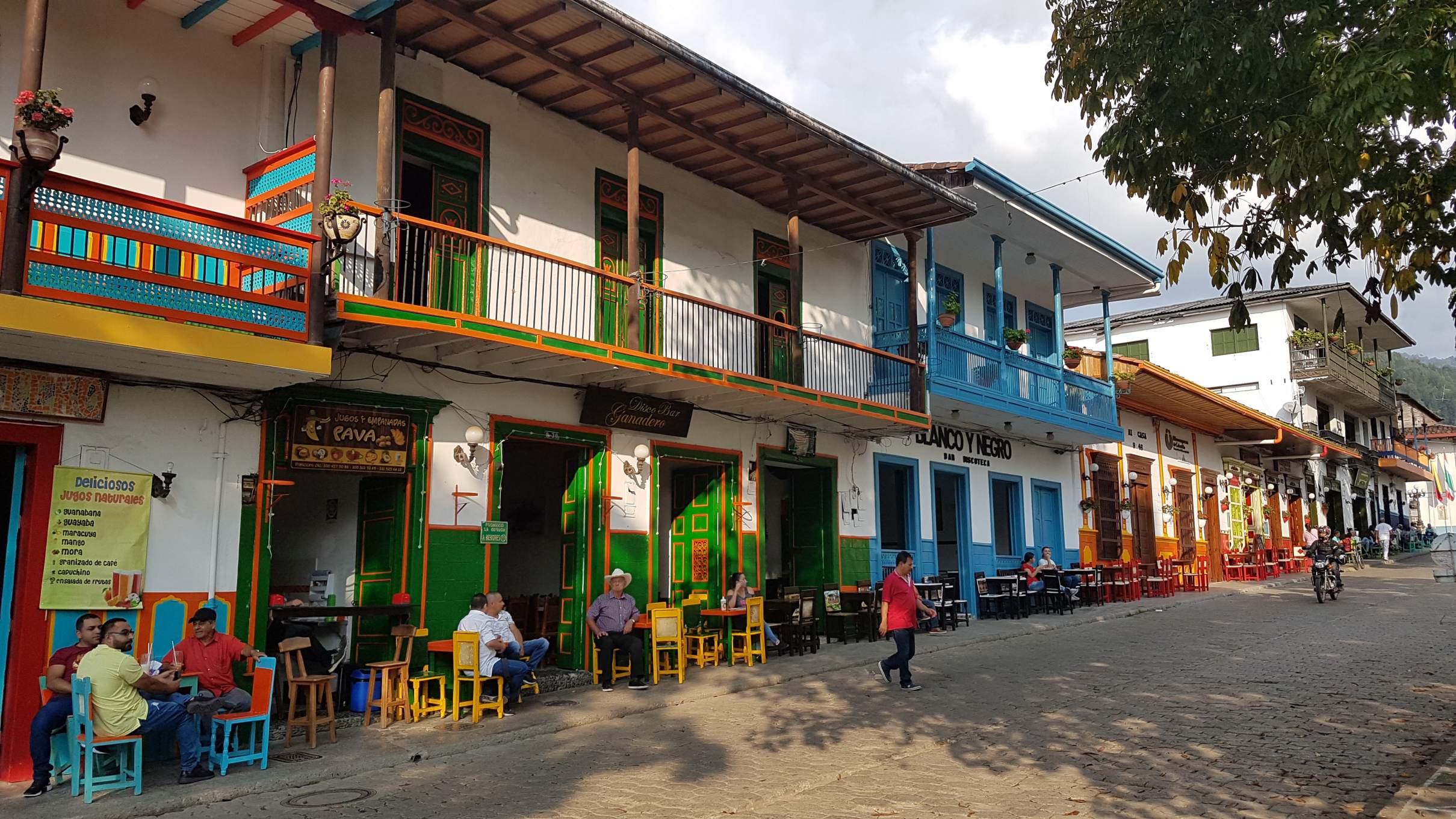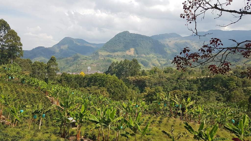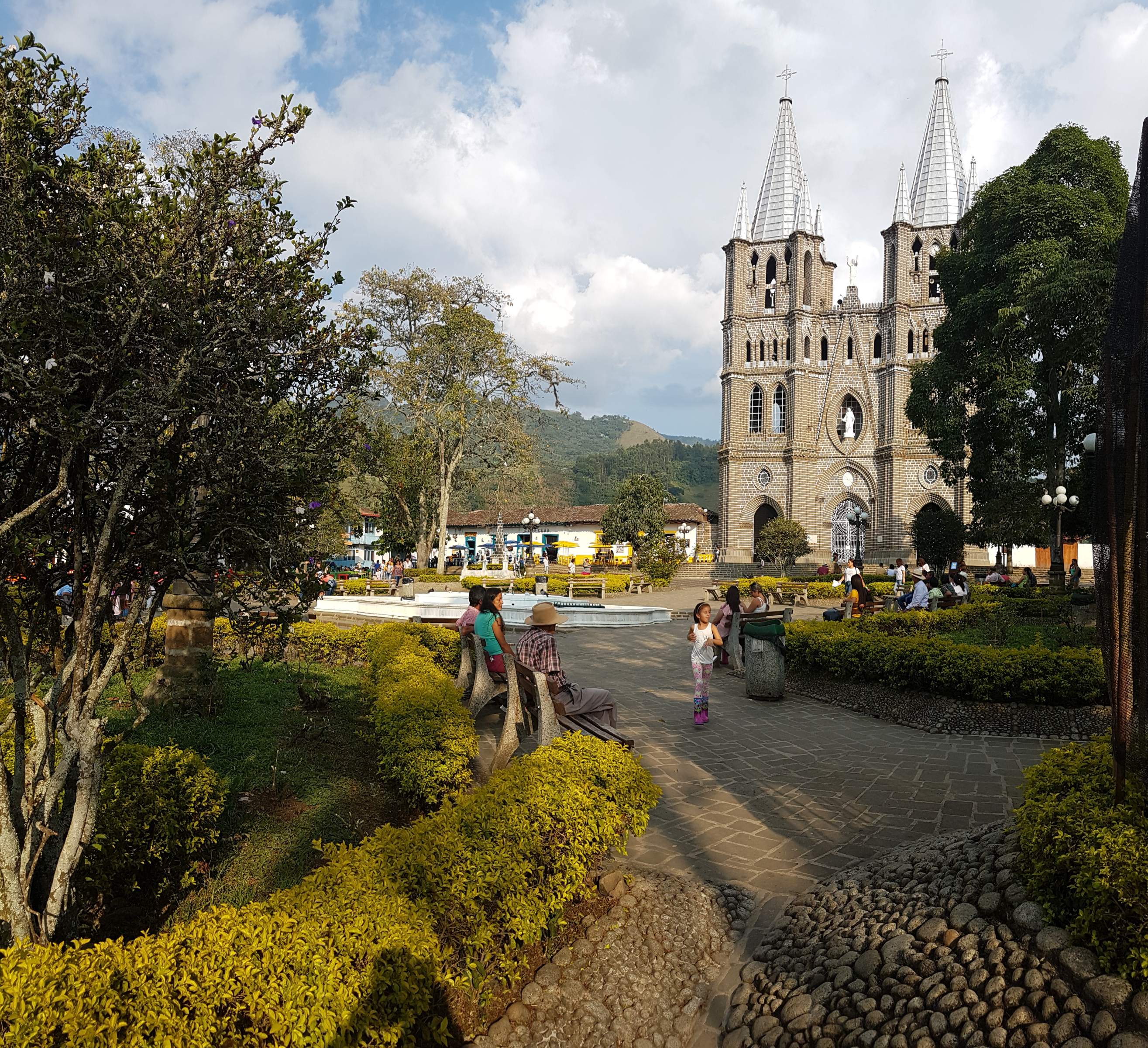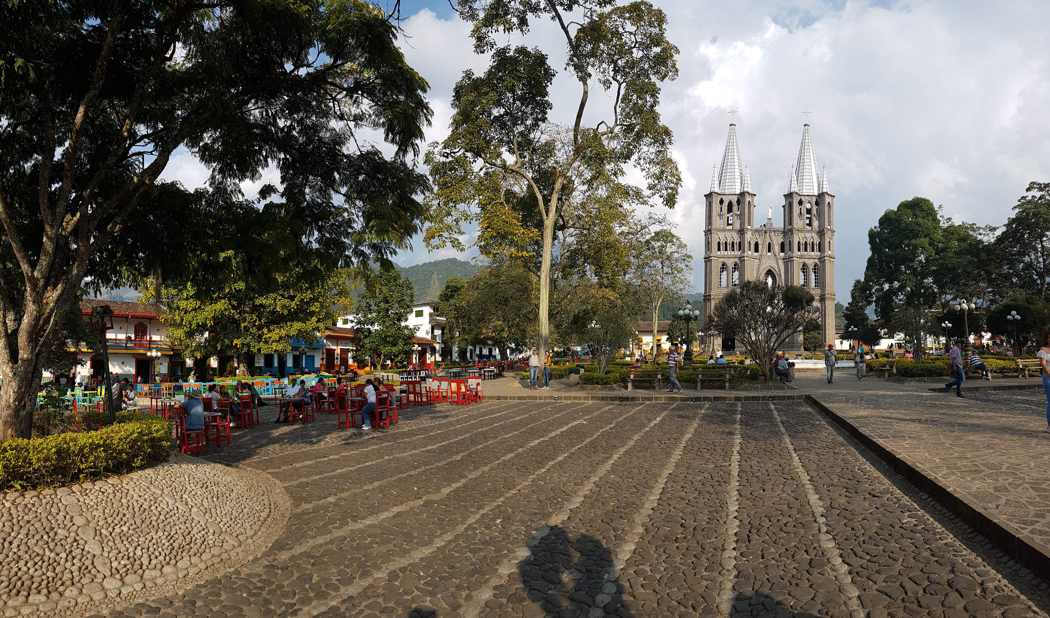 Die 4-stündige Fahrt ist etwas überschattet von der Sorge um die für das kommende Wochenende angekündigten Demonstrationen der Guerilla-Gruppe ELN (Nationale Befreiungsarmee), die gerade auf dem Land auch mal gewalttätig ausarten können. Mein Sitznachbar, ein älterer, sehr gepflegter Herr, und ich hoffen, dass wir an diesem Freitag noch unbehelligt nach Jardín kommen. Der Señor reist eigens für einen Gottesdienst seiner Glaubensgemeinschaft dorthin. 4 Stunden Fahrzeit auf holprigen Straßen über die Cordillera Occidental mit Schlaglöchern und Serpentinen, nur um vor Ort gemeinsam zu beten, wäre jetzt nicht so meins. Aber mein angenehmer Zufallsreisegefährte erzählt mir nebenbei von Land und Leuten, zeigt mir den Cerro Bravo und die spitze Pyramide des Cerro Tusa … In Bolomboló im Distrikt Venecia machen wir zum ersten Mal Rast und werden kurz nach dem Ort erneut angehalten: Razzia – alle Männer müssen aus dem Bus aussteigen und ihre Papiere herzeigen. Entlang des Río Cauca und des Río Pedral geht es weiter über Hispania und Andes Richtung Jardín. Erste Kaffeeplantagen steil wie Weinberge kleben an den Berghängen. Um 13 Uhr erreichen wir unser Ziel.