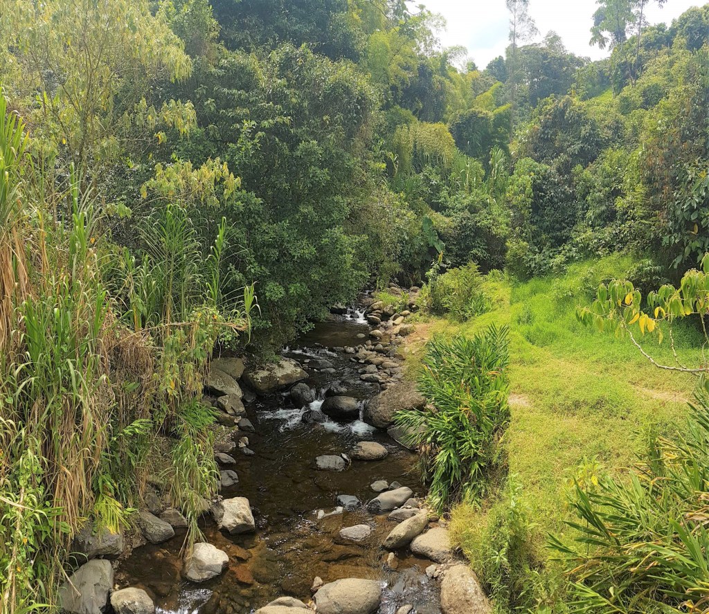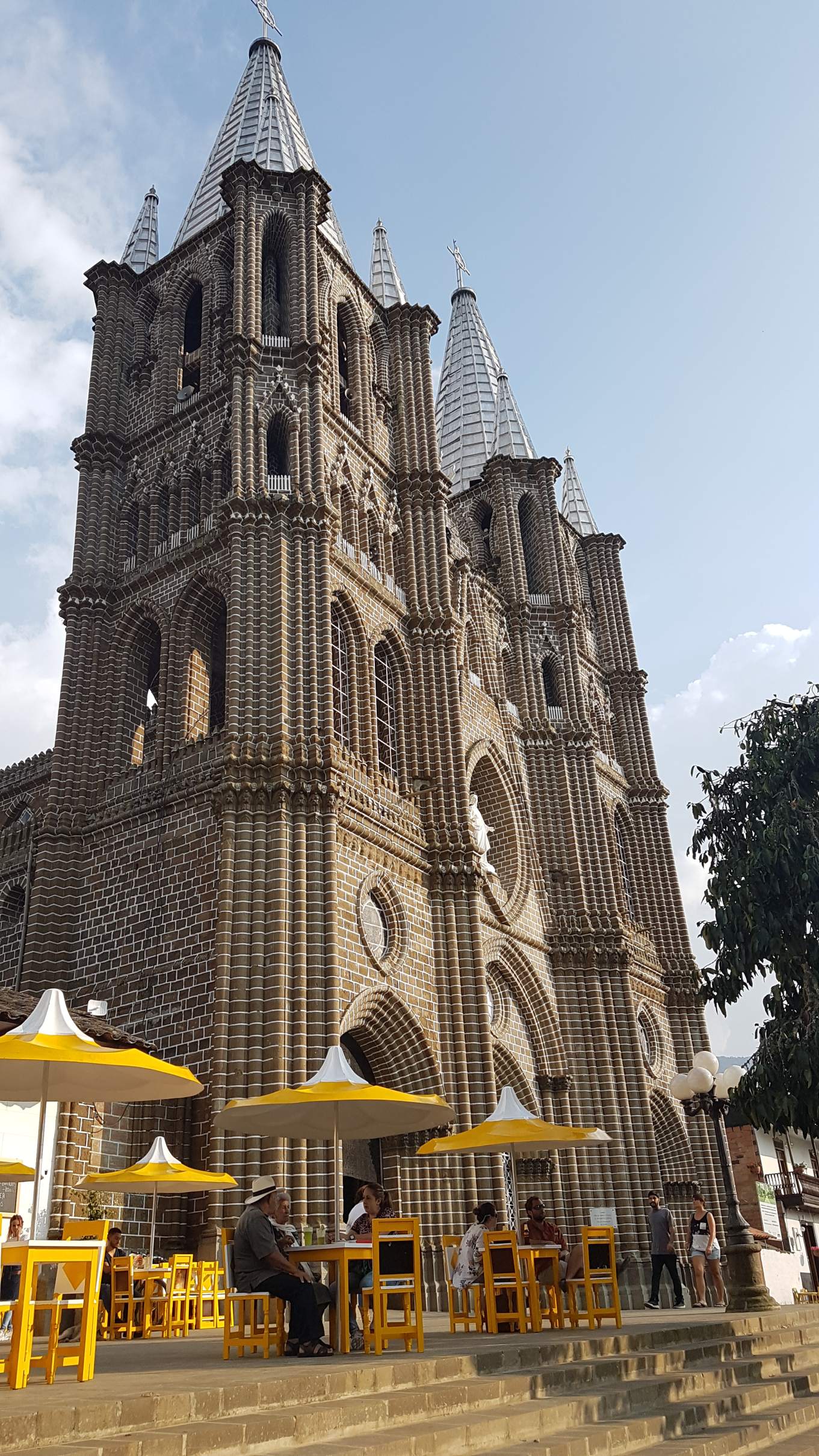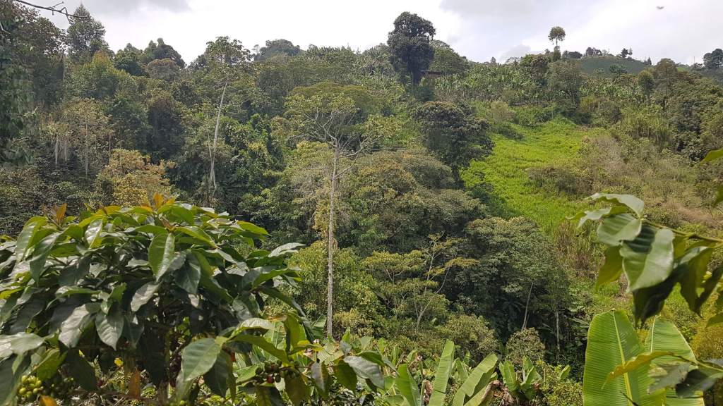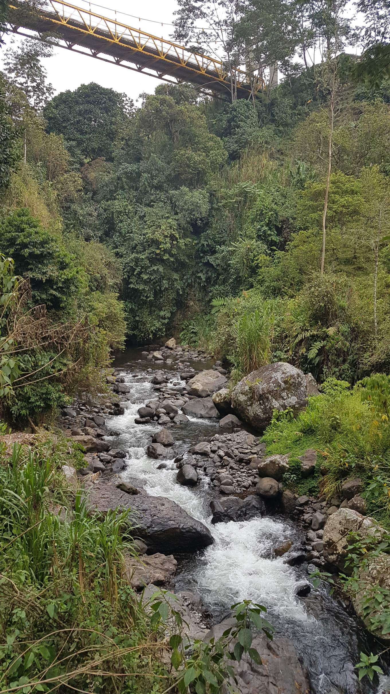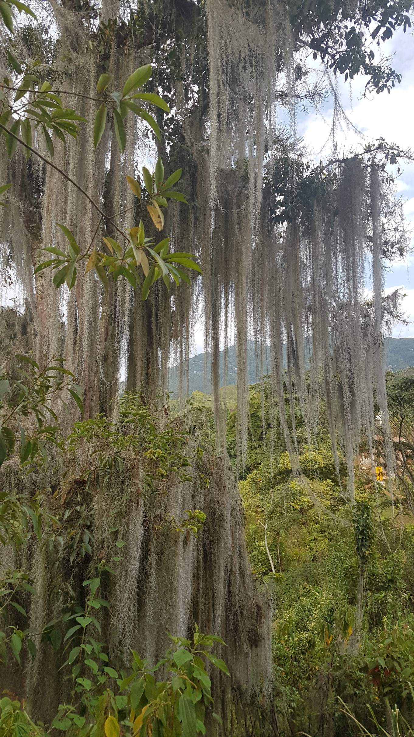 Die 4-stündige Fahrt ist etwas überschattet von der Sorge um die für das kommende Wochenende angekündigten Demonstrationen der Guerilla-Gruppe ELN (Nationale Befreiungsarmee), die gerade auf dem Land auch mal gewalttätig ausarten können. Mein Sitznachbar, ein älterer, sehr gepflegter Herr, und ich hoffen, dass wir an diesem Freitag noch unbehelligt nach Jardín kommen. Der Señor reist eigens für einen Gottesdienst seiner Glaubensgemeinschaft dorthin. 4 Stunden Fahrzeit auf holprigen Straßen über die Cordillera Occidental mit Schlaglöchern und Serpentinen, nur um vor Ort gemeinsam zu beten, wäre jetzt nicht so meins. Aber mein angenehmer Zufallsreisegefährte erzählt mir nebenbei von Land und Leuten, zeigt mir den Cerro Bravo und die spitze Pyramide des Cerro Tusa … In Bolomboló im Distrikt Venecia machen wir zum ersten Mal Rast und werden kurz nach dem Ort erneut angehalten: Razzia – alle Männer müssen aus dem Bus aussteigen und ihre Papiere herzeigen. Entlang des Río Cauca und des Río Pedral geht es weiter über Hispania und Andes Richtung Jardín. Erste Kaffeeplantagen steil wie Weinberge kleben an den Berghängen. Um 13 Uhr erreichen wir unser Ziel.