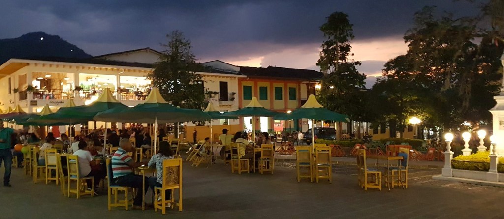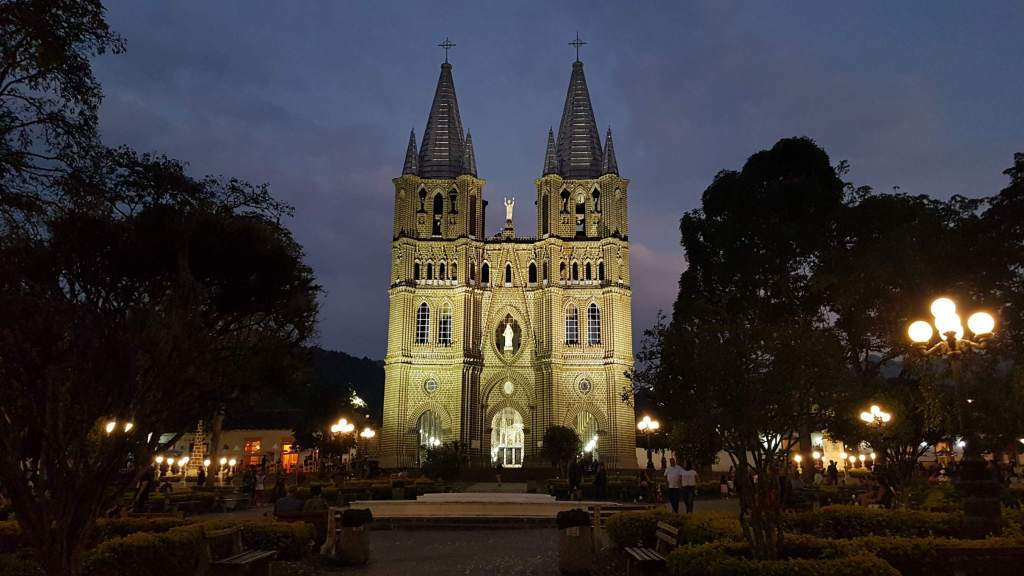 Diesen Ausstoß an Glückshormonen lasse ich an der Plaza mit zwei Colombia Negra noch sacken, bevor ich mich mit einem kurzen Zwischenstopp im Hostel auf den Weg zu einer Veggie-Restaurant-Empfehlung mache. Inzwischen ist es dunkel geworden und, ja, das Restaurant liegt etwa 1 km außerhalb von Jardín. Dunkle Feldwege, einsame Fincas, hier und da Hundegebell – schon ein bisschen gruselig. Aber da kommt ein junges Mädel zu mir herangefahren – ohne Licht am Rad! Sie ist Einheimische, möchte zum gleichen Restaurant und freut sich, dass ich uns mit meiner Taschenlampe in der Dunkelheit den Weg beleuchte. Das Restaurant mit alternativem Touch ist chillig, ich schaue über das nächtliche Jardín mit seiner großen Kirche, genieße einen leckeren Gemüsereis … und friere ein bisschen. Wird doch recht frisch hier auf 1.750 m.