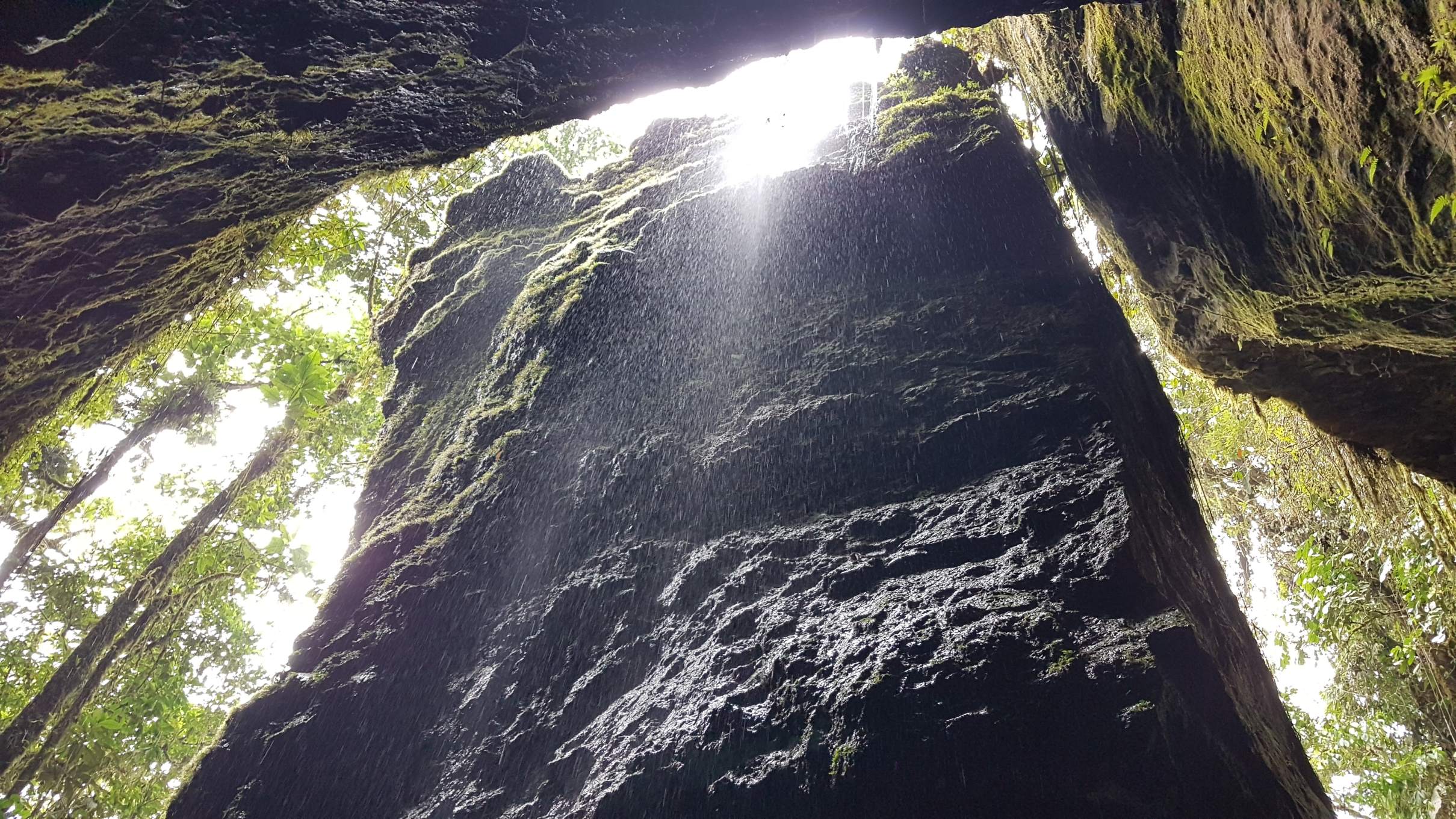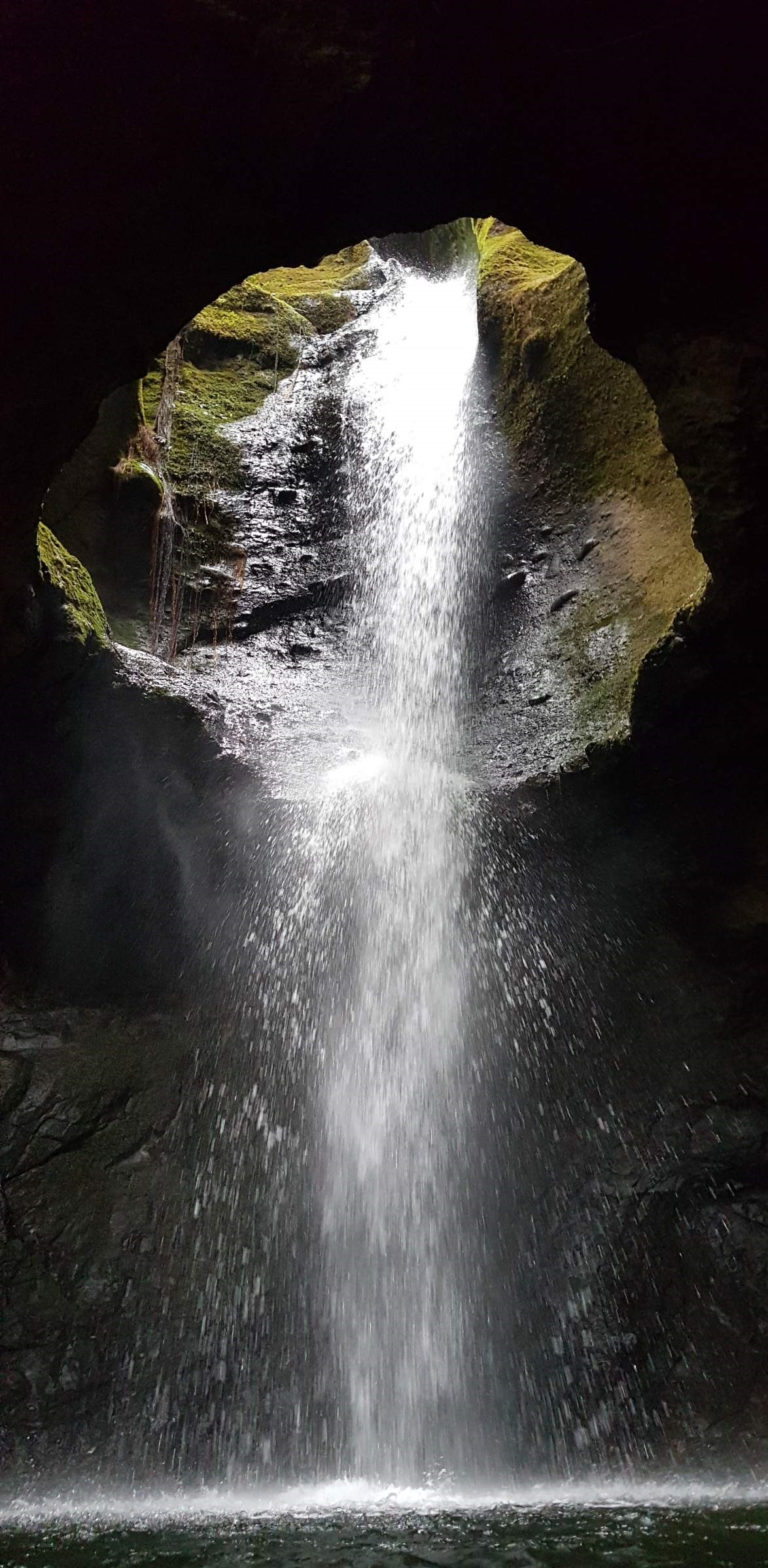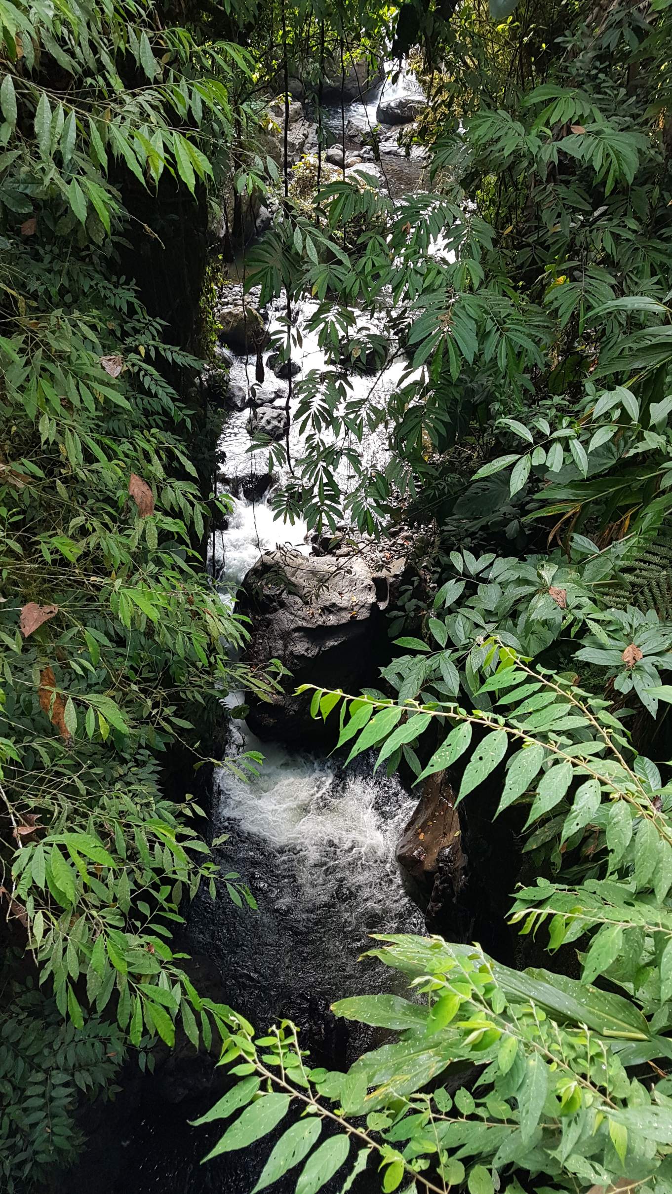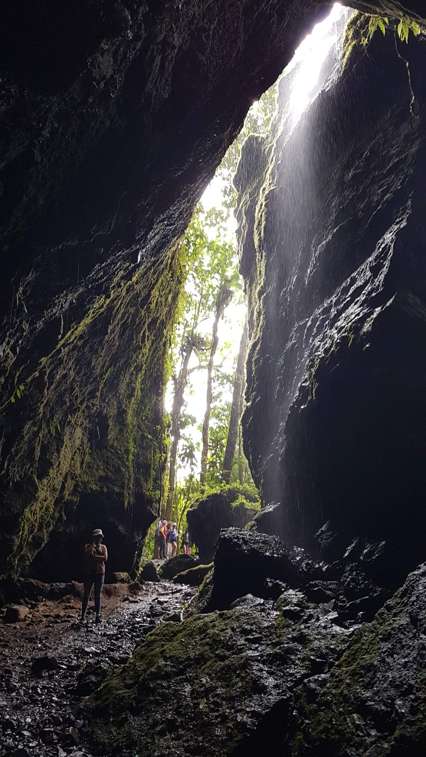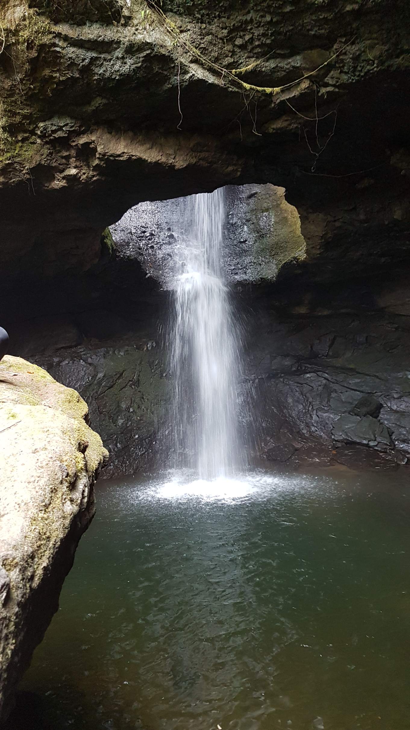 Der Wasserfall durch das Höhendach ist nicht herausragend spektakulär, aber ein schöner Naturort. Natürlich gehöre ich zu den wenigen Personen, die sich auch wagemutig in den 16-18 Grad kalten Tümpel wagt. Aber auch nur denen ist der Blick durch das Loch nach oben in den grünen Dschungel vorbehalten. Leider habe ich meine Handy-Schutzhülle nicht dabei und kann „den Durchblick“ deshalb nicht wirklich festhalten.