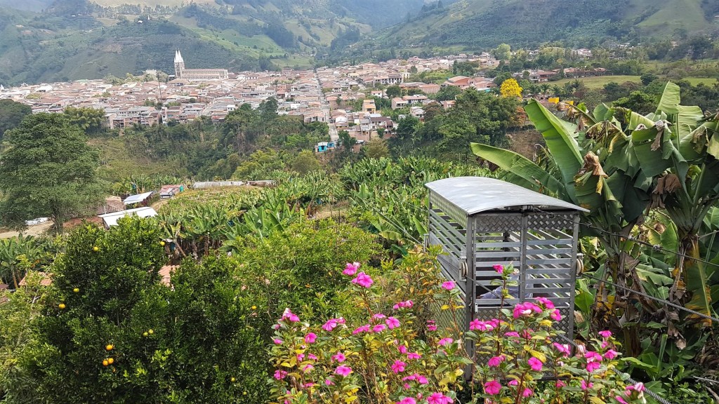 Mit dieser Self-made-Seilbahn (die alte Kabine wurde gerade gegen eine neue aus Edelstahl ausgetauscht) kann man herrlich bequem hinterunter nach Jardín sausen … oder eben hinauf. Sie wird von Einheimischen und Touristen gerne genutzt. Ich trinke mit dieser wunderbaren Aussicht einen Tinto und entscheide mich, da es erst 11 Uhr ist, weiter zu wandern.