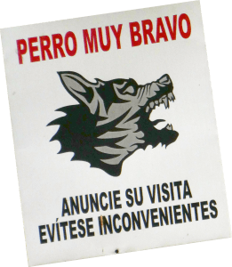 Obwohl ich alleine und auch „einsam“ unterwegs bin, fühle ich mich auf den Wegen und Pfaden sehr wohl und sicher – abgesehen von den Hunden, die mich, je einsamer die Fincas liegen, umso lauter und aggressiver von der Seite ankläffen. Meinen Schirm habe ich schon parat und steige weiter den Berg hinauf … bis mich dieses Schild ausbremst: