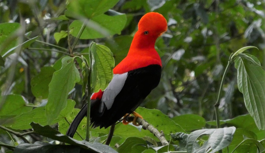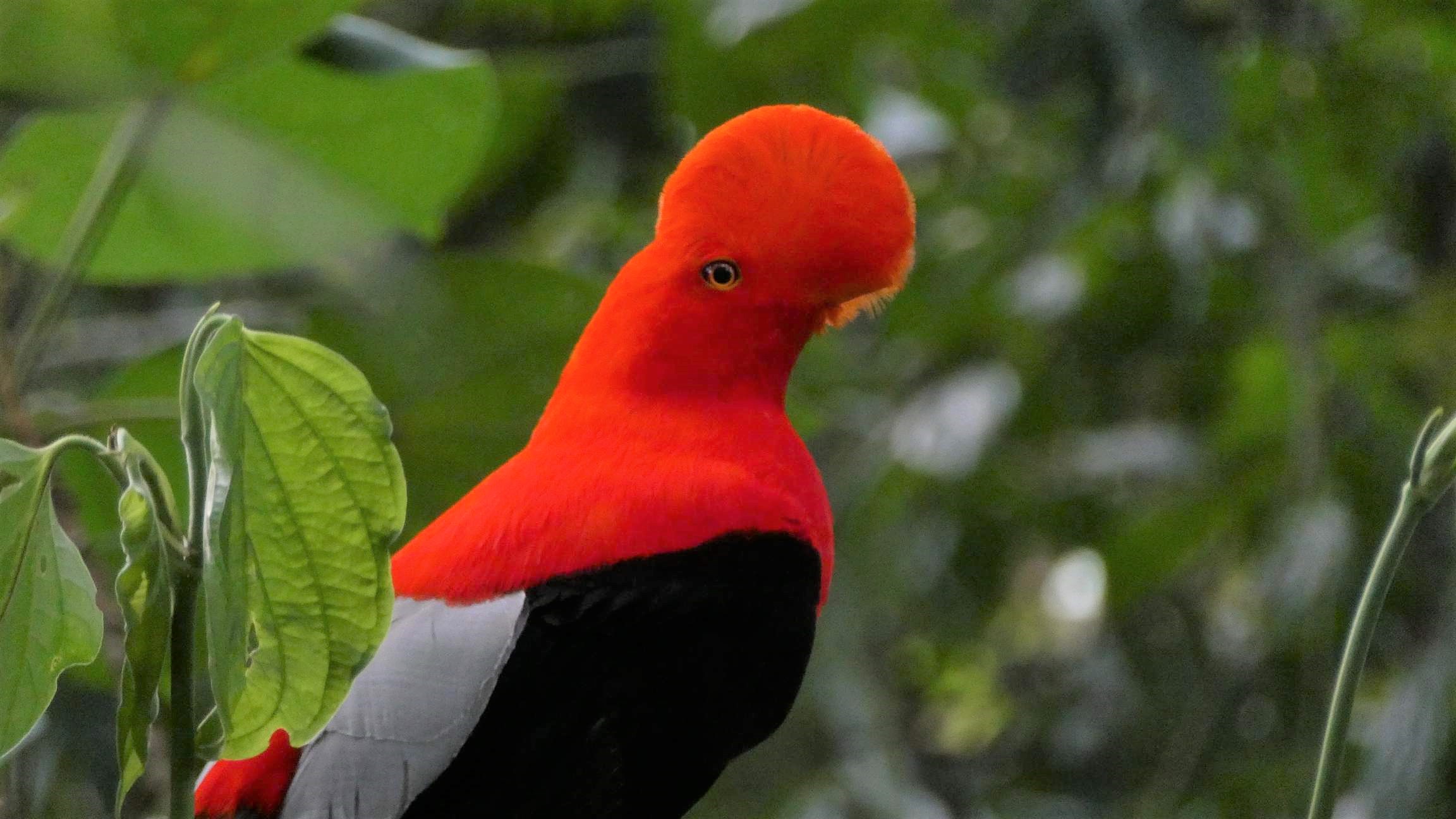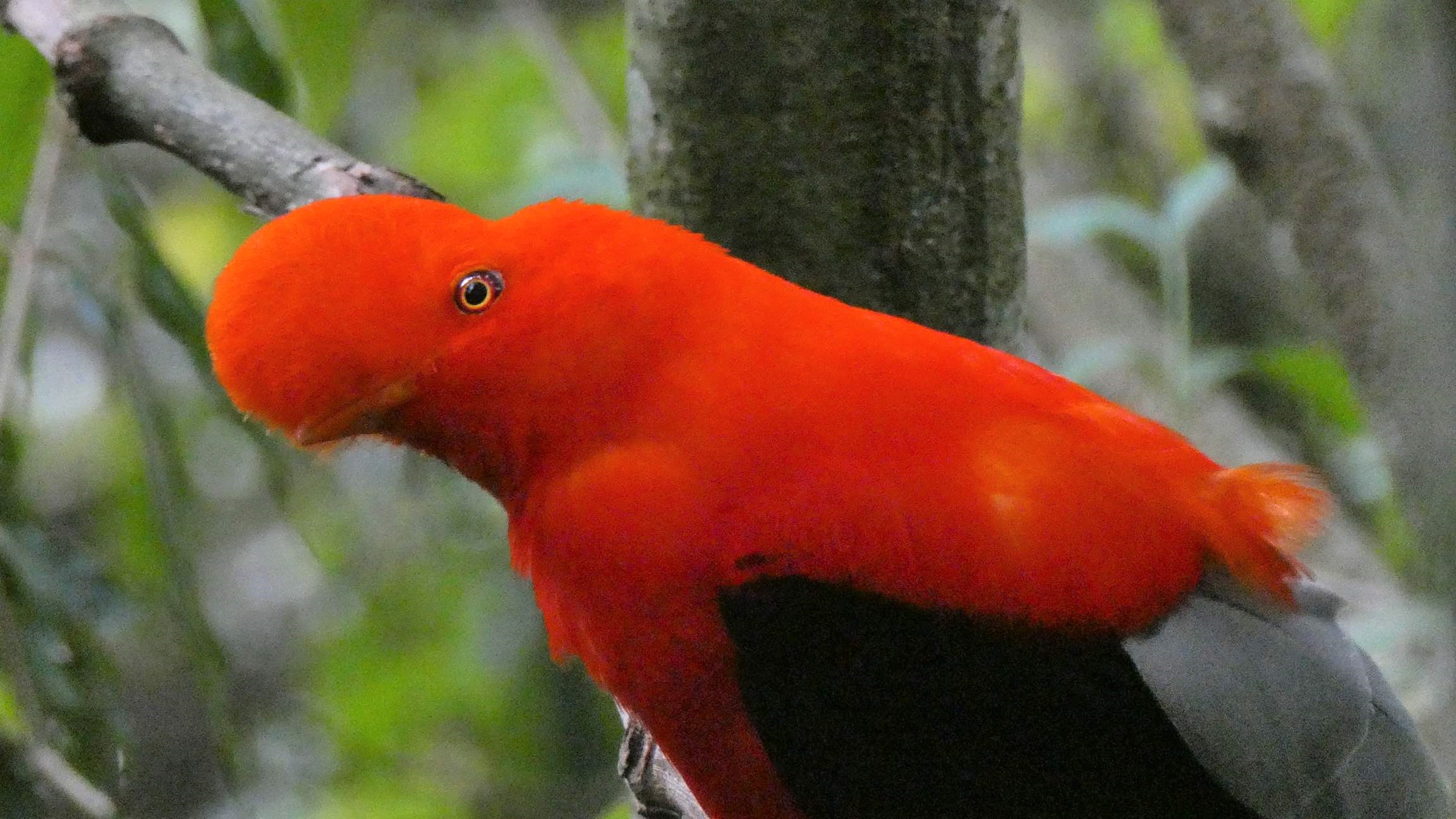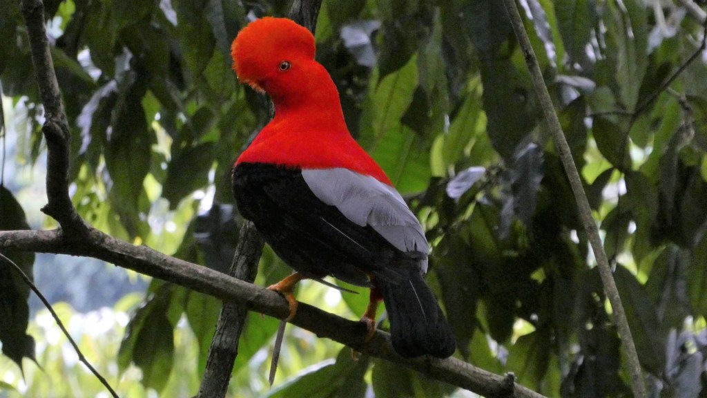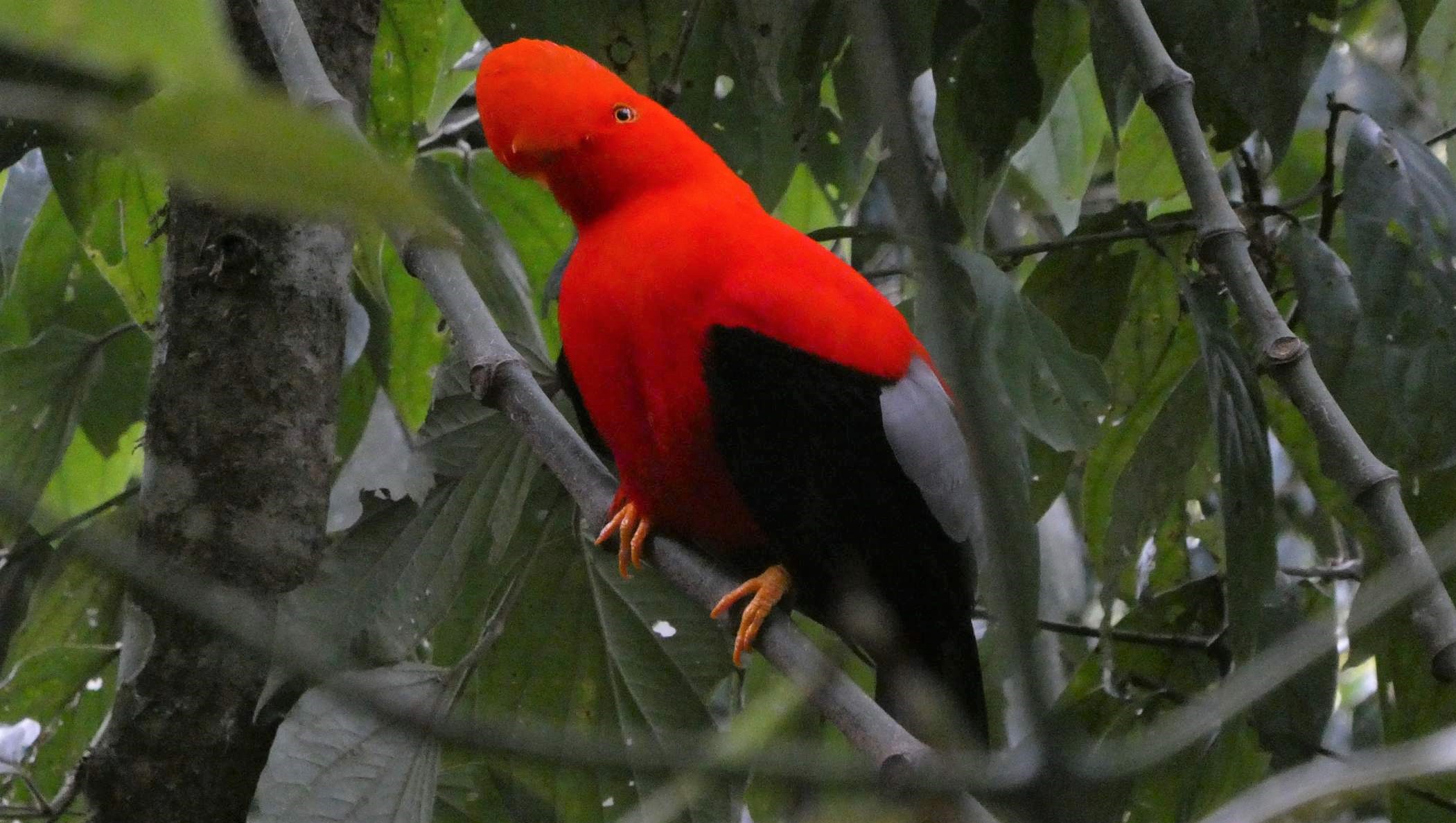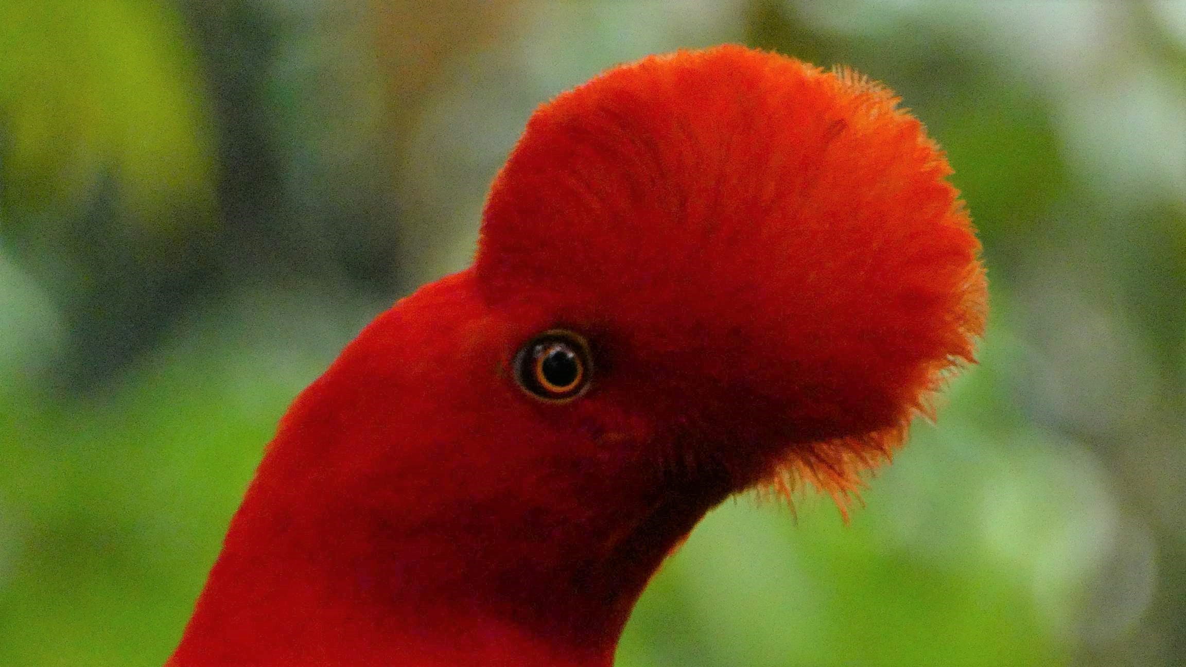 In einer Seitenstraße zur Plaza buche ich für den nächsten Tag eine Tour zur Cueva de Esplendor auf 2.300 m. Und pünktlich um 17 Uhr stehe ich erneut vorm Tor des Jardín de las Rocas. Auf mein Klingen öffnet mir die Dame des Gartens die Tür, ich zahle meinen Obolus und sie führt mich durch den kleinen Garten zu den Beobachtungsplattformen. Und tatsächlich! In den Bäumen, die hier vom Flussufer hoch gen Himmel wachsen, tummeln sich ganze Gruppen von Gallitos! WOW! Was für eine Freude! Ich lege mich auf die Pirsch, beobachte die seltsamen Gestalten mit den Federkämmen bis zum Schnabel und lausche dem zugegebenermaßen eher unschönen Gekreische. Die egozentrischen Herren der Schöpfung sind Einzelgänger und versammeln sich nur für die Nacht hier. Die Weibchen im schlichten orange-braunen Gewand kümmern sich derweil andernorts alleine um den Nachwuchs.