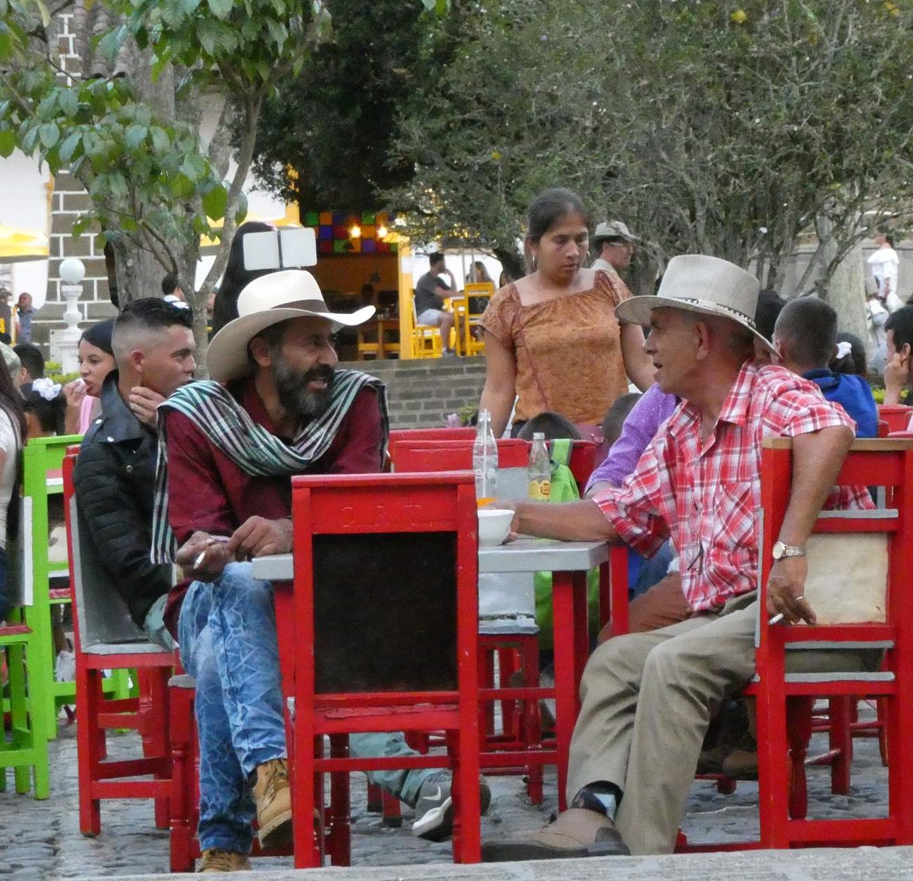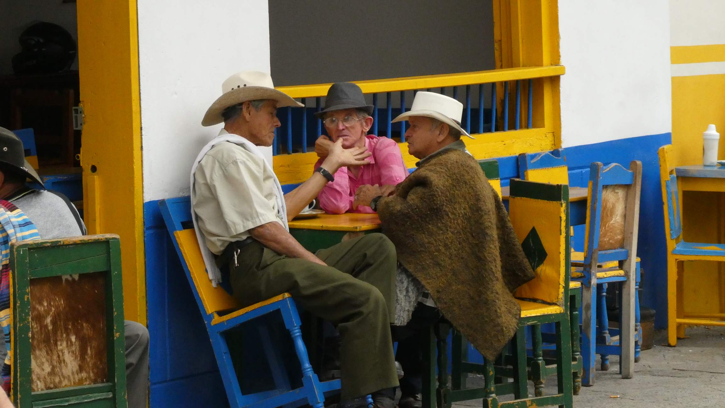 Nach dem Duschen und Packen tauche ich noch einmal in die Plaza-Gemeinschaft ein, trinke mein geliebtes Colombia negra und probiere dabei die heimische Sitte mit dem Händeklatschen aus. Funktioniert perfekt!