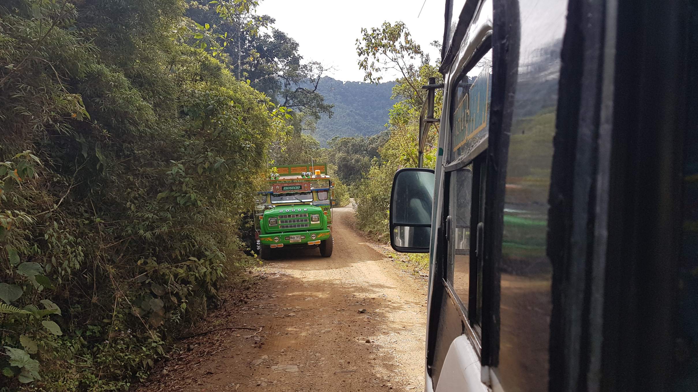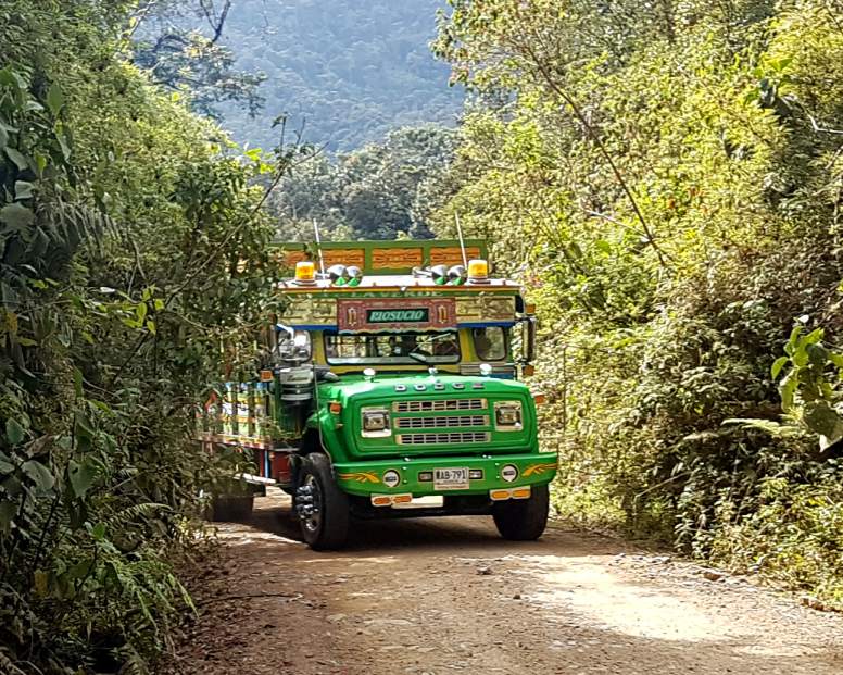 Mit Überlast quält sich das klapprige Gefährt mit Ächzen und Schnauben die holprige Piste bergauf. Auch wenn es den Anschein hat, dass sich die Karre demnächst in ihre Einzelteile zerlegt, klingt der Motor beruhigend kraftvoll. Ich hoffe insgeheim, dass auch die Bremsen im Fall der Fälle ihren Dienst tun. Gut eine Stunde geht es auf der unbefestigten Einbahnstraße durch dichten Nebelwald. Bei Gegenverkehr wird es eng und ich bin froh, dass es seitwärts nie steil bergab geht. Zwei der bunten Chiva-Busse passieren uns – wenn man Glück hat, kann man auch mit diesen zumindest optisch schickeren Fahrzeug die Strecke Jardín – Riosucio zurücklegen. Scheint mir aber für Gepäck und Fahrgäste eine staubige Angelegenheit zu sein.