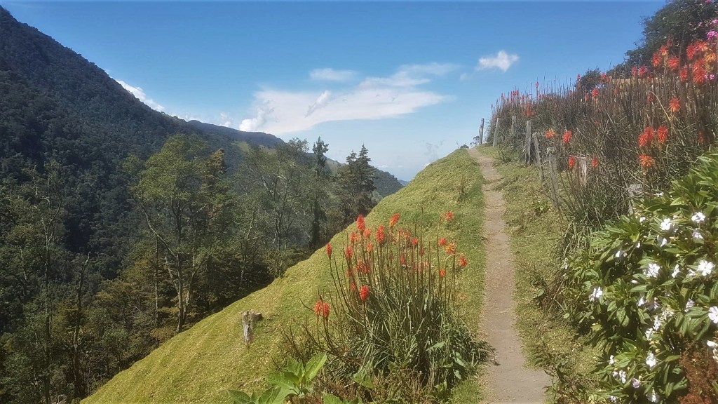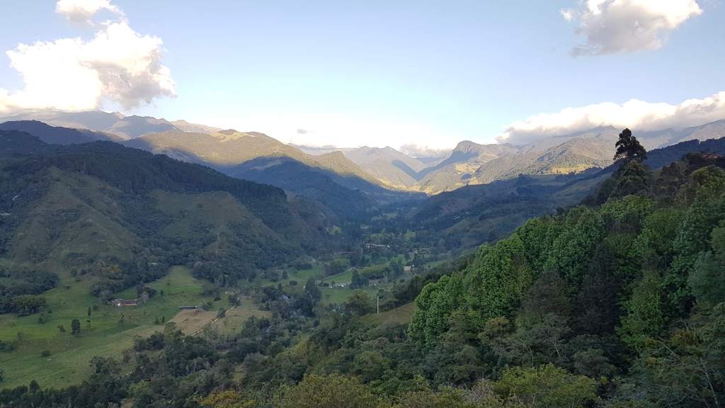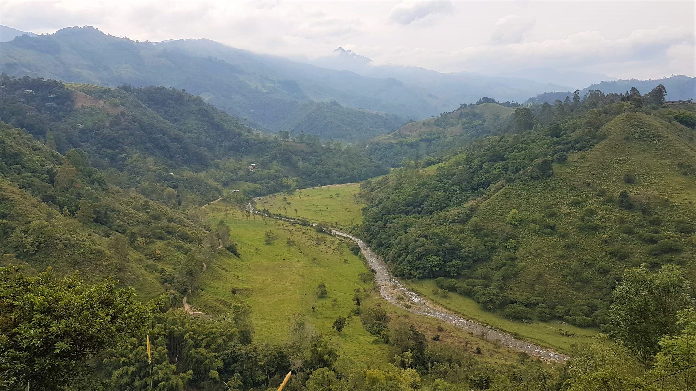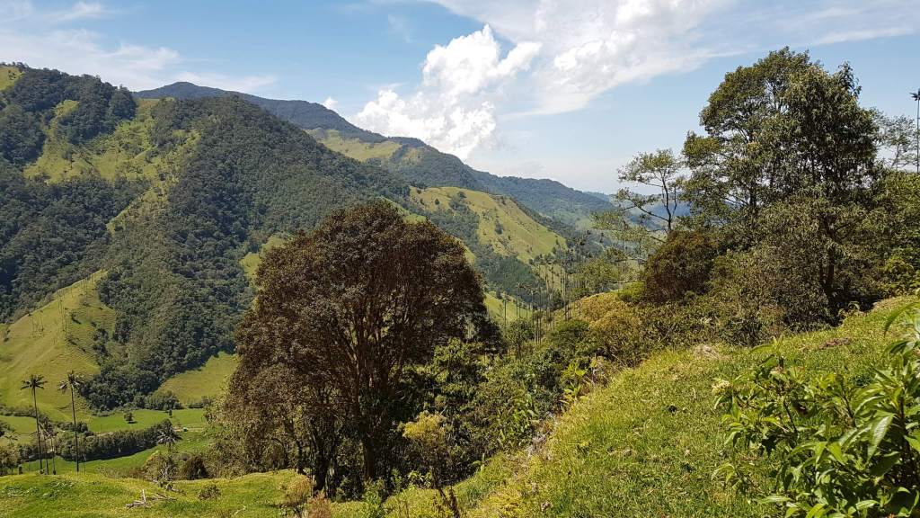 Jetzt genieße ich diese herrliche Landschaft in der warmen Morgensonne und sehe schon die Wachspalmen auf der anderen Talseite in den Himmel ragen. Die Wiesen strahlen in einem saftigen Grün, bis der Wiesenpfad irgendwann endet und entlang des Río Quindío wild-romantisch durch den Nebelwald aufwärts führt.