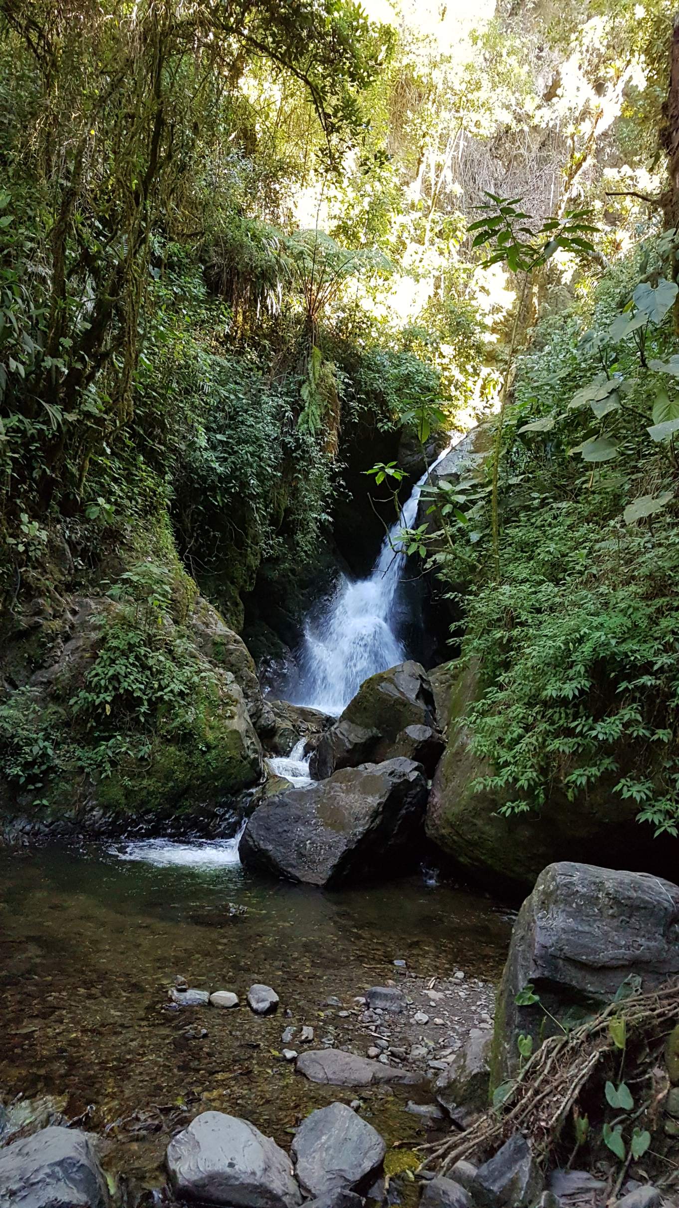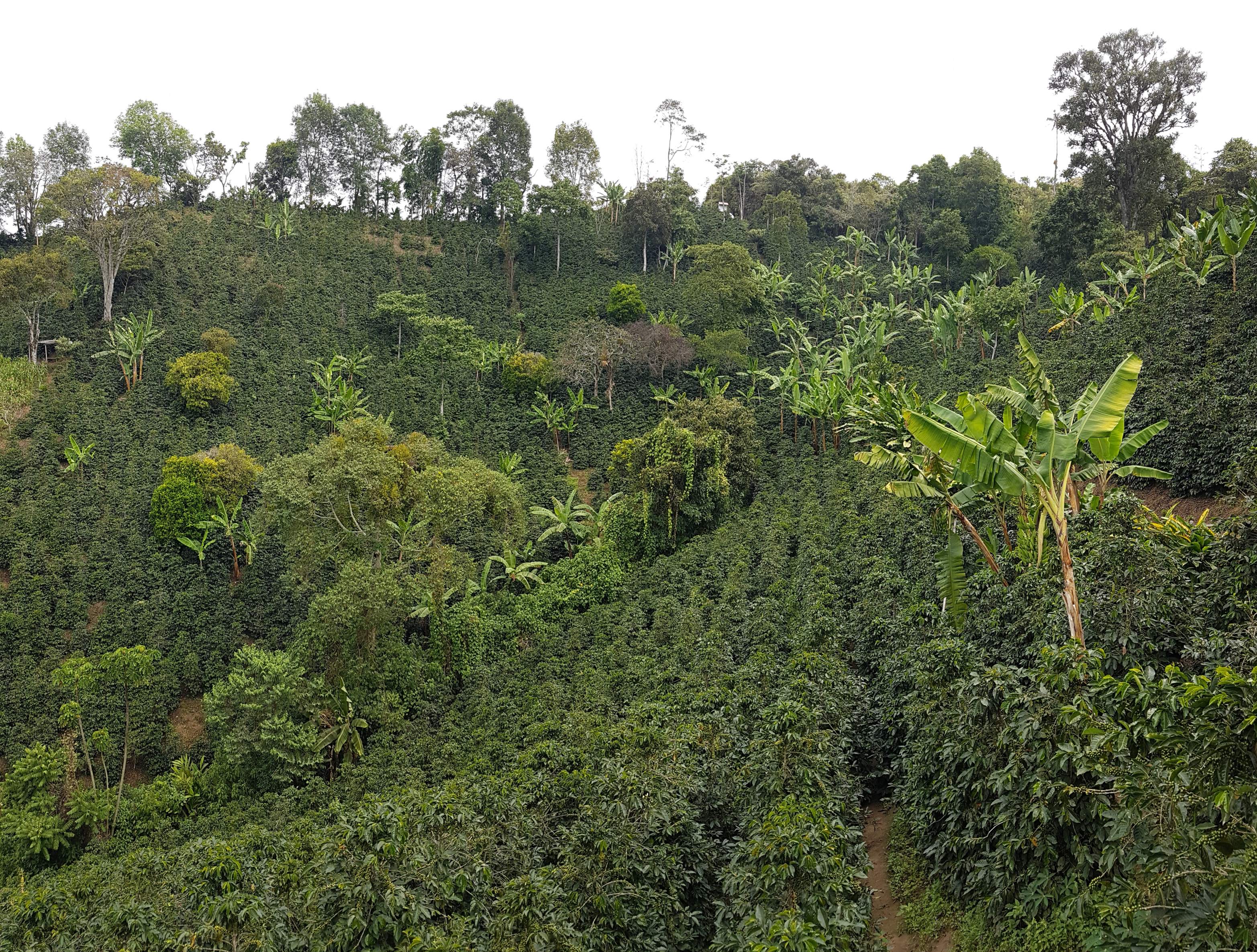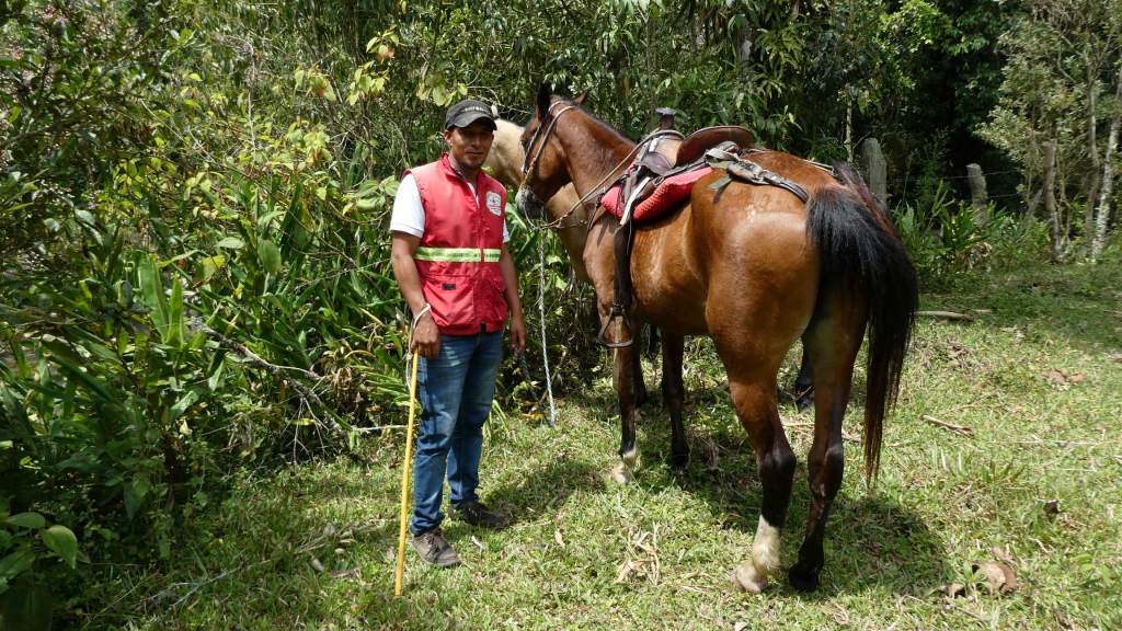 Nach den Gassen von Salento verlassen wir schon bald den breiten Forstweg und tauchen ein in die dichte Vegetation. Dort sehe ich zum ersten Mal einen wunderschönen Barranquero Andino, der uns neugierig und völlig unerschrocken aus dem nahen Gebüsch beobachtet. Über schmale Pfade, auf und ab, erreichen wir nach 1 Stunde die kleine Kaffee-Finca Las Acacias mit einem herrlichen Ausblick auf das Tal des Río Boquerón.