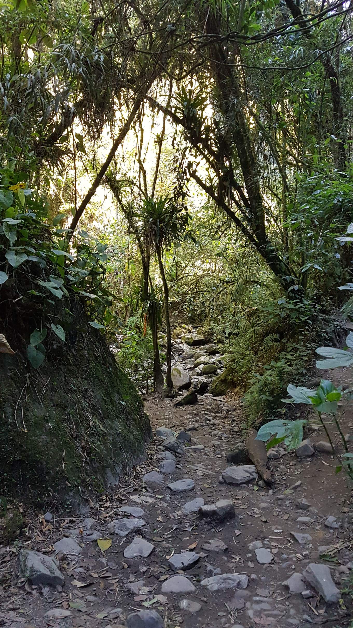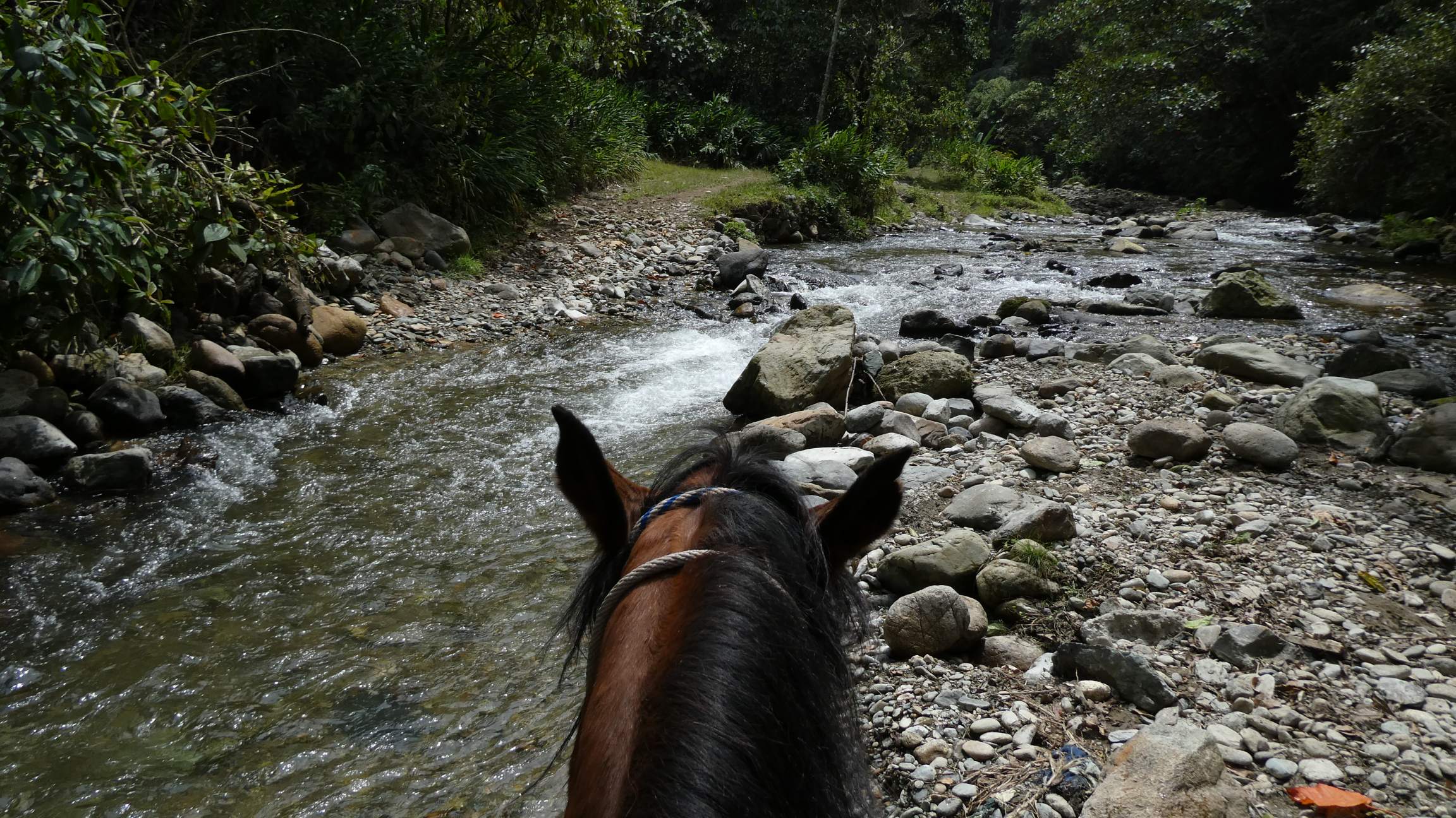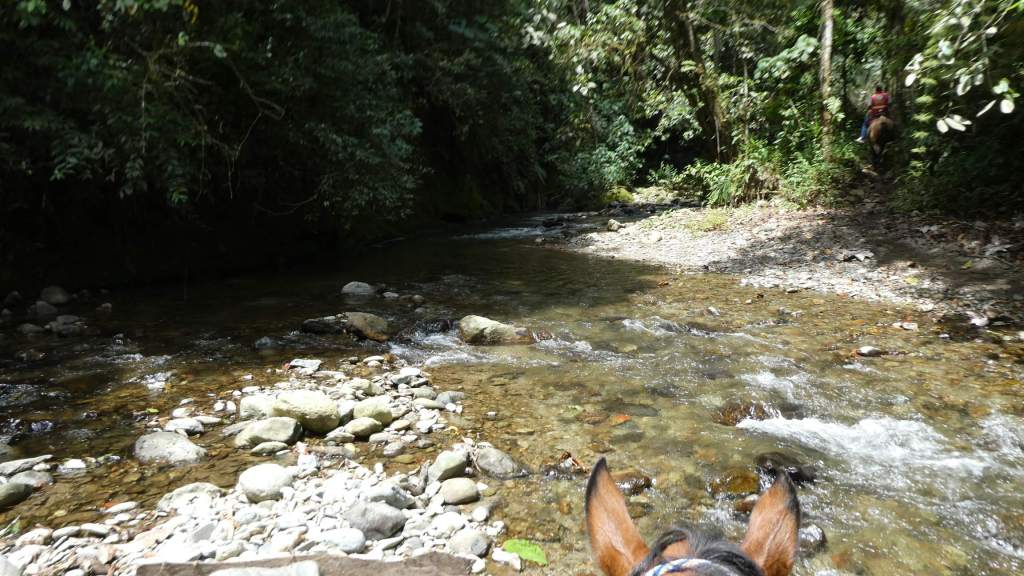 Nach einer kurzen Rast geht es weiter entlang des Boquerón und – So ein Mist! Meine neue Kamera ist baden gegangen!! Ich hatte vergessen, sie nach der Rast wieder am Rucksack zu befestigen. Angel angelt sie zwar ziemlich schnell aus dem Wasser heraus, aber es schaut nicht gut aus. Seltsamerweise mag ich mir dadurch gar nicht meine gute Stimmung vermiesen lassen und genieße weiter diesen herrlichen Ritt. Volle Konzentration ist jetzt auch gefragt, denn es geht super steil über einen ausgewaschenen Pfad den Berg wieder hinauf. Ach, was für ein Erlebnis!!