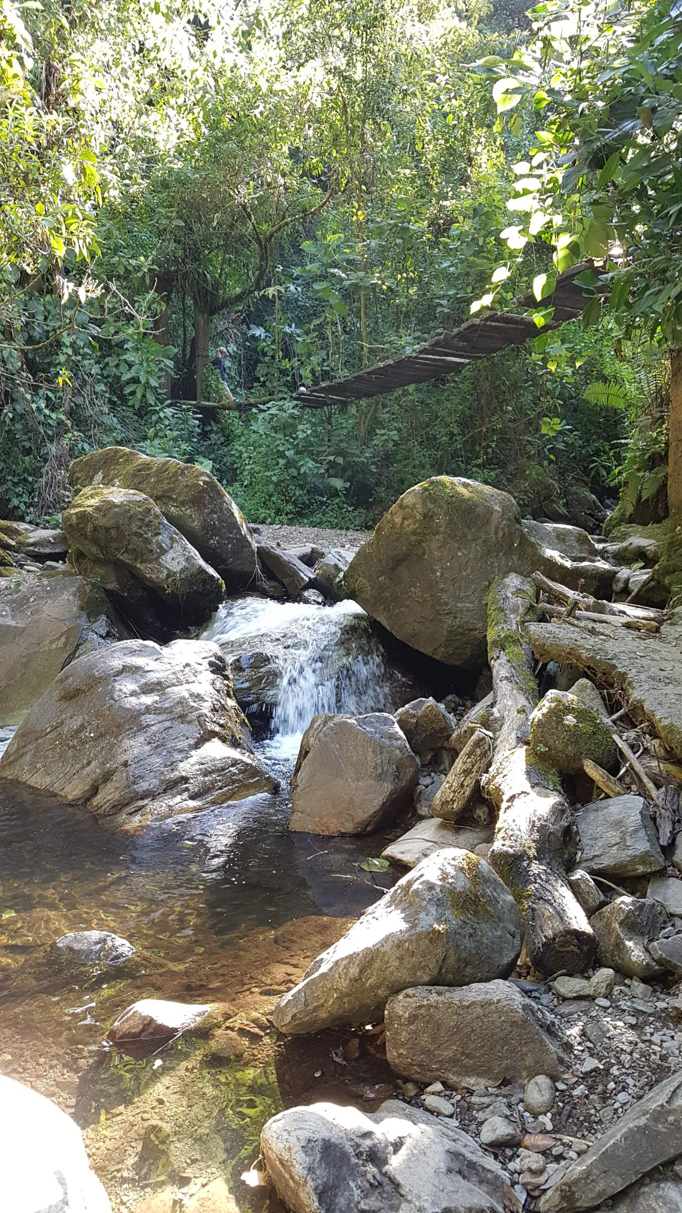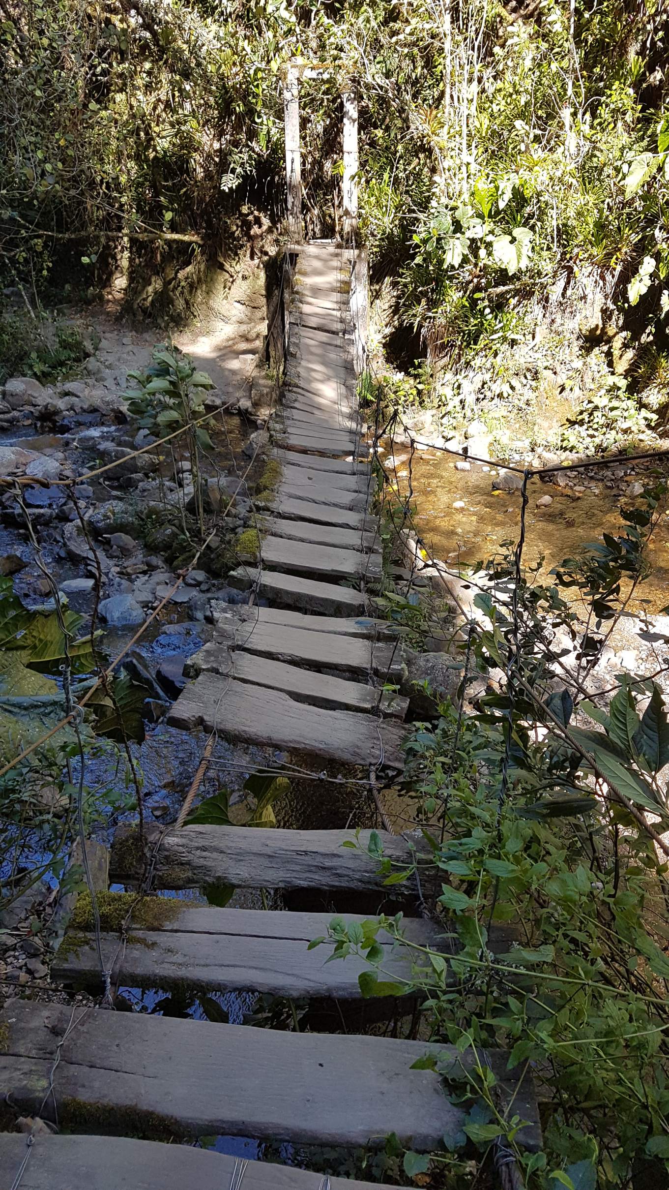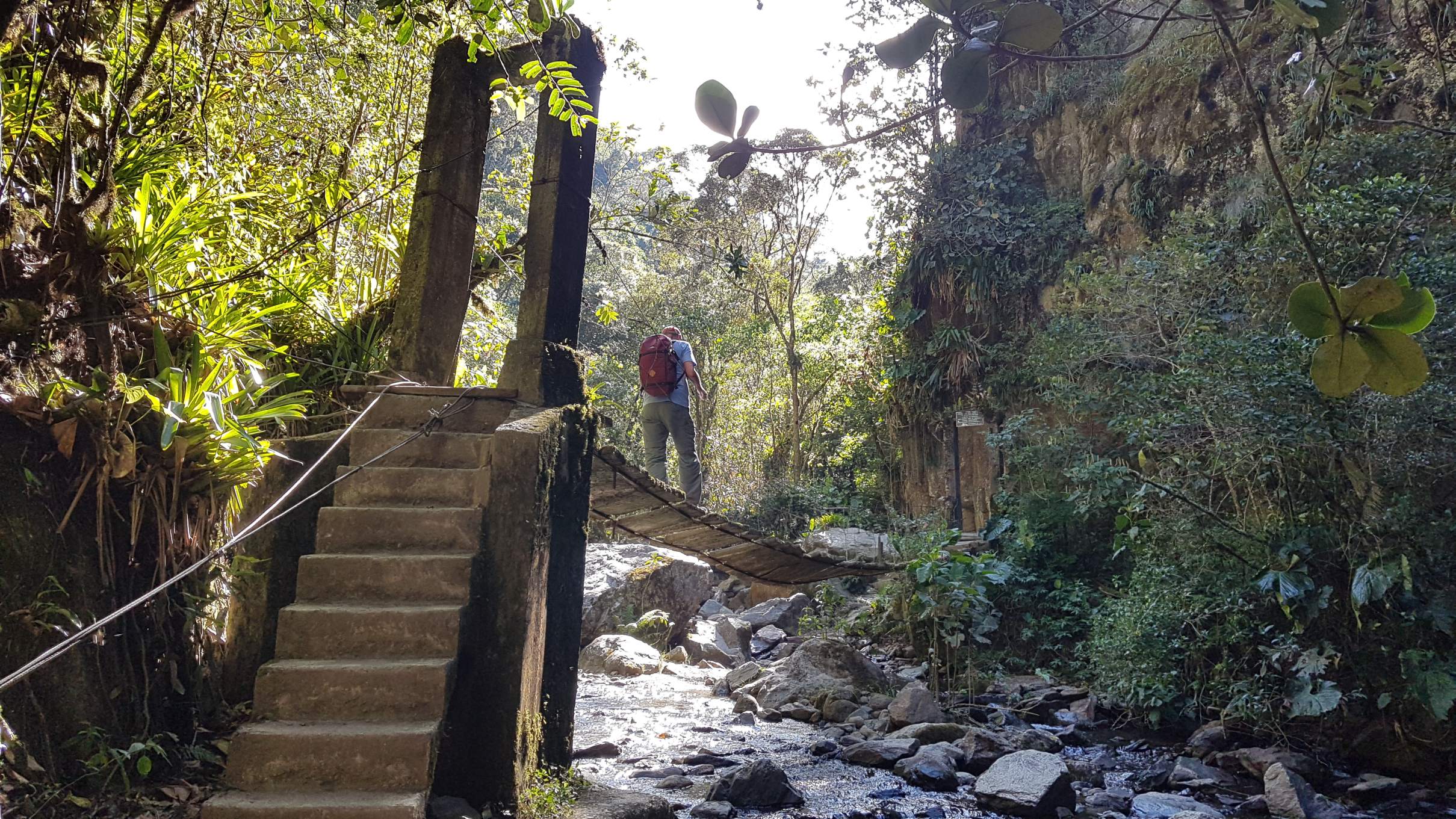 Immer wieder wechselt der Pfad die Flussseiten und die verwitterten Dschungelbrücken passen sich optisch dem verwilderten Ambiente an.