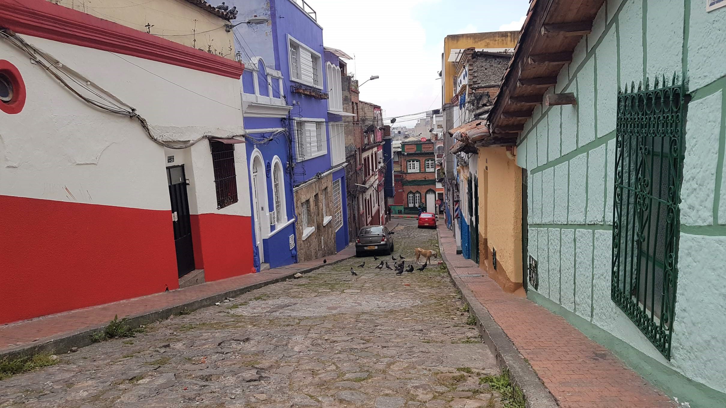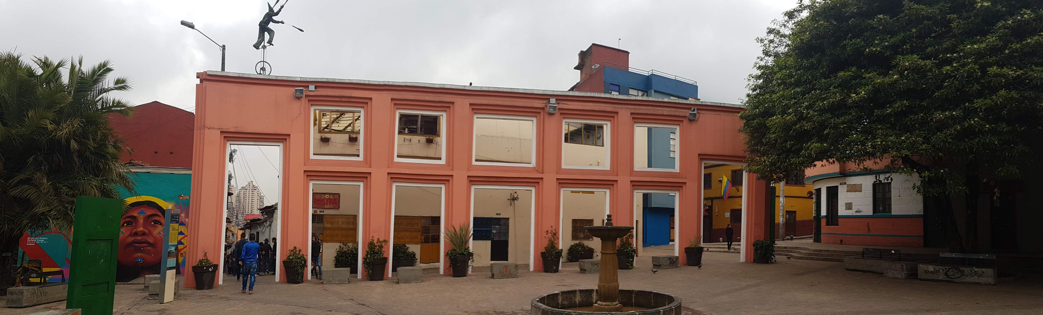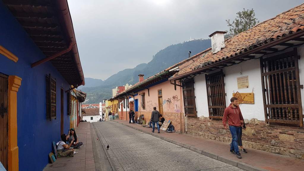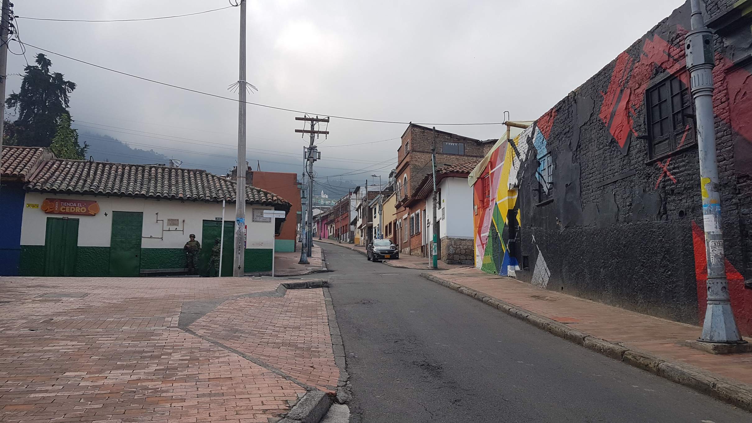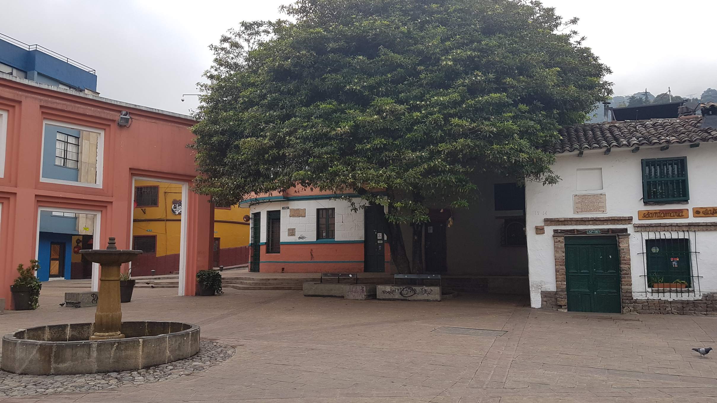 Ich starte zu meinem ersten Orientierungs- und Erkundungsgang. Das alte Herz Bogotás liegt gleich ums Eck: die Plazoleta del Chorro de Quevedo. Manche behaupten, hier wäre Bogotá gegründet worden. Egal wie, dieser Platz in La Candelaria erwacht auf jeden Fall spätestens am Nachmittag zu Leben. Auf ihm versammeln sich Musiker und Geschichtenerzähler, Akrobaten und Comedians und jede Menge junge Menschen. Es wird den Künstlern gelauscht, viel gelacht und applaudiert, aromatisierte Chicha getrunken, in Gruppen geratscht und philosophiert. Auch die Policía schaut hin und wieder nach dem Rechten.